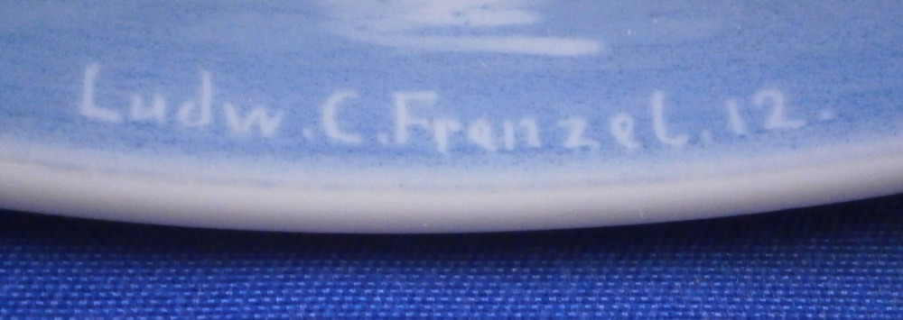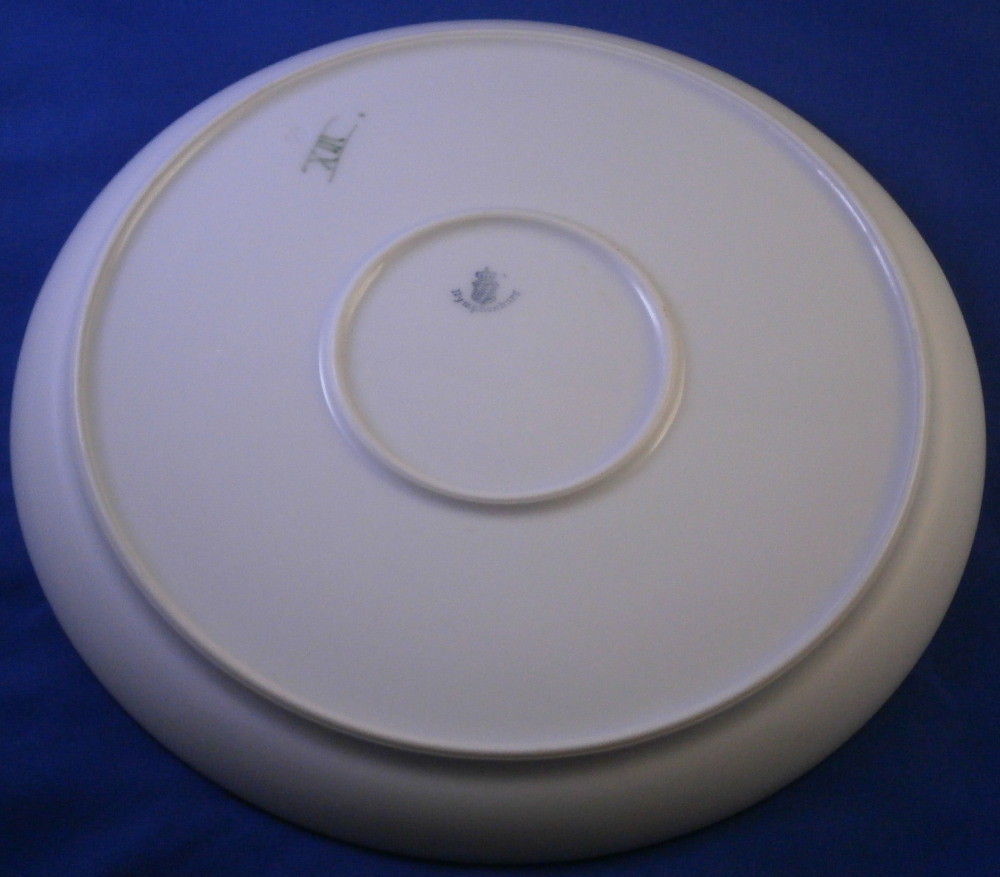 This is a rare and superb plate made by Nymphenburg in the early 20th century - 1912 to be exact. It is hand painted with a scene that covers the entire surfact of the front by the famous artist Ludwig Carl Frenzel who always painted these swan scenes. The cups are a bit more common but these large scene on plates are very rare! The plate is hand painted in under glaze colors with a pair of swans swimming on a lake with some greenery in the background as well as a temple looking structure - called the Apollotemple near the Nymphenburg park by the castle. A great plate that looks amazing and is in superb condition. No chips, etc. It is marked with the green shield under the crown with Nymphenburg under it, the impressed shield mark as well as a green Roman numeral XIII as shown. The piece is 0.75 inches tall and 9 inches in diameter. Signed by the artist Ludw. C.Frenzel and the number 11 for 1911. Please email me for more information or other pictures.