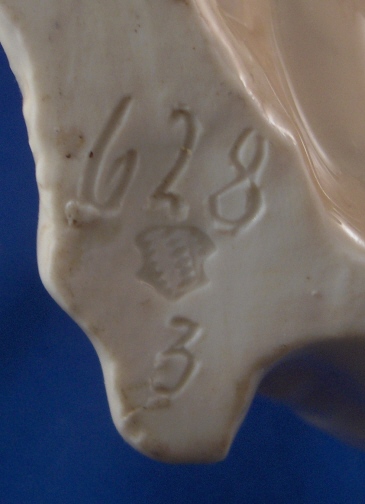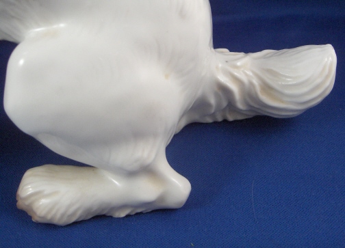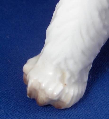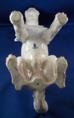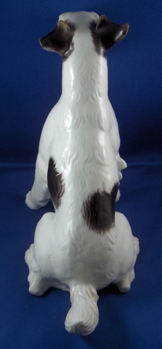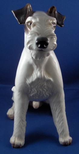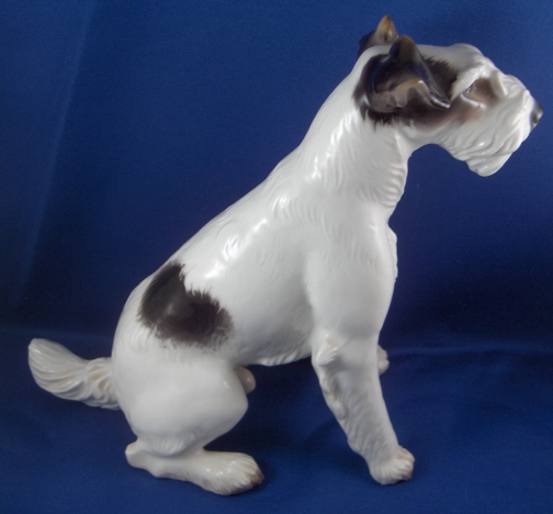 This is a figure of a dog made by Nymphenburg in the early to mid 20th century. I do believe it is a terrier but am somewhat clueless in the dog department :) Either way he is superbly modeled (just look at the fur!) and painted just right to make him very elegant. The dog is 8.625 inches tall, 4.5 inches wide and 8.75 inches long. Marked twice - with the impressed shield mark, once with the incised numbers 628 and 3 and once with the green shield mark under the crown with the word Nymphenburg underneath. He is in perfect condition with a teeny firing crack on the tip of the tail not easily seen. Please email me for more information or other pictures.