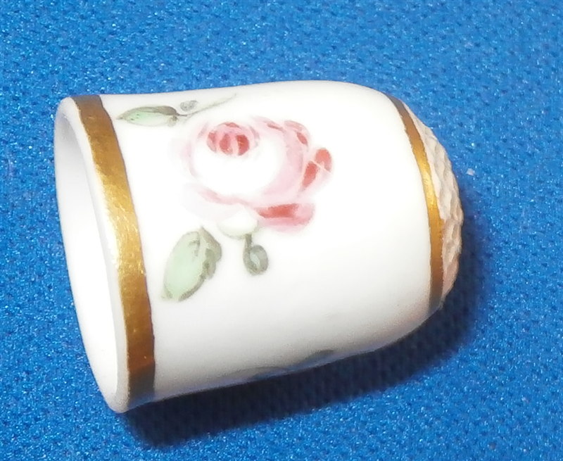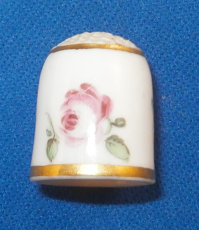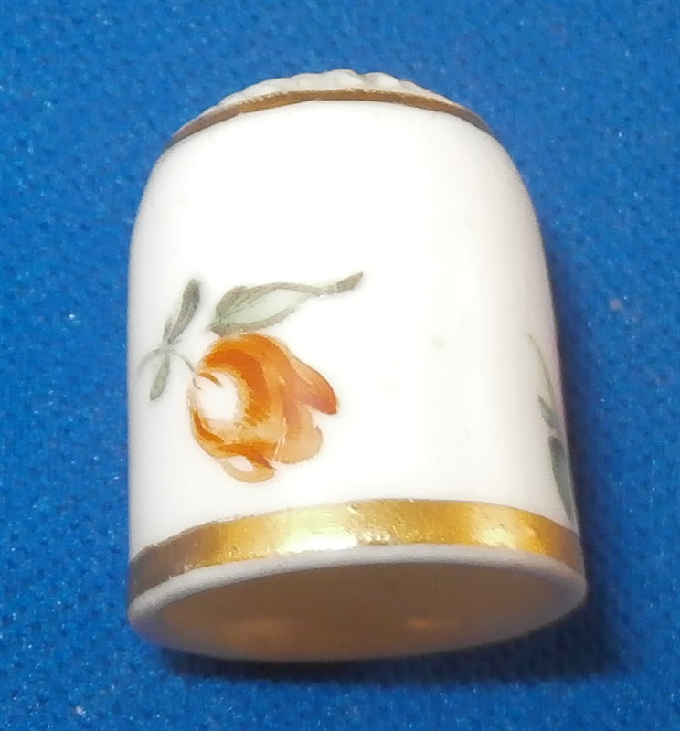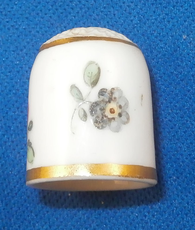 This is a thimble I think was made by Nymphenburg in the late 18th century. It is handpainted with three small flowers and two gold rings. The top has the rough surface on it and it seems more child size than regular size. The colors, style of painting, gilding and the paste lead me to believe it is by Nymphenburg but it is hard to be 100% on a piece like this though it is definitely German and from this period. The piece is not marked but that would be normal on a piece like this. It is in perfect condition. The thimble is 0.75 inches tall and 0.625 inches in diameter. Please email me for more information or other pictures.