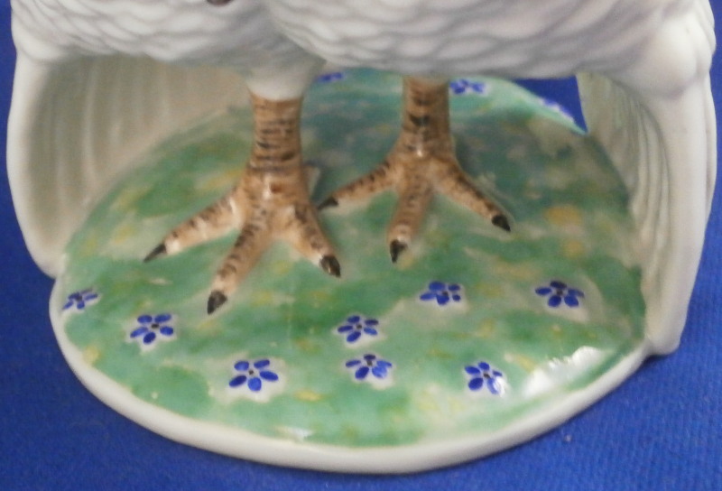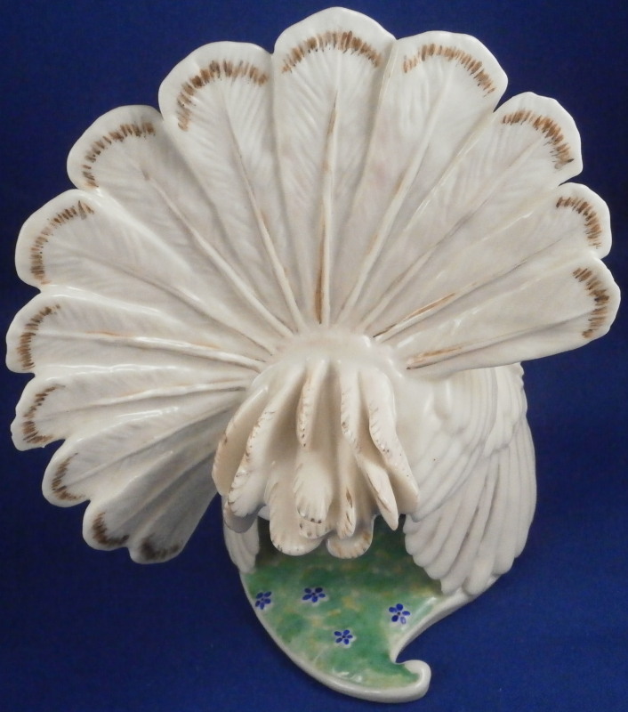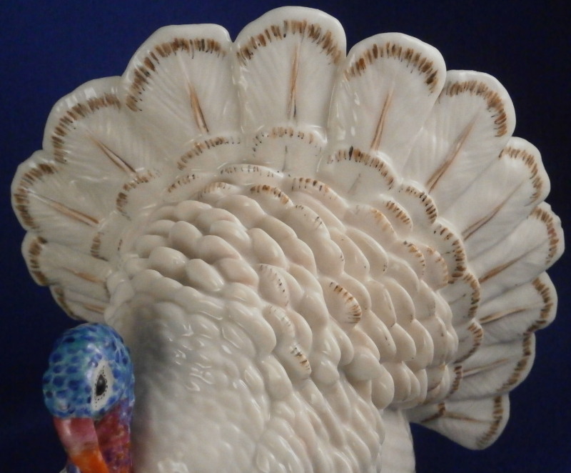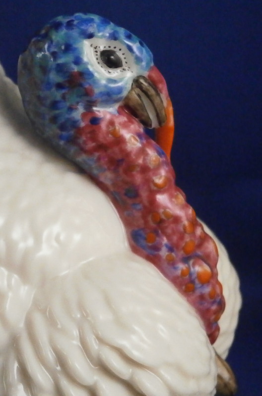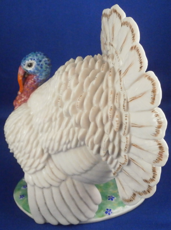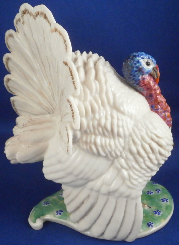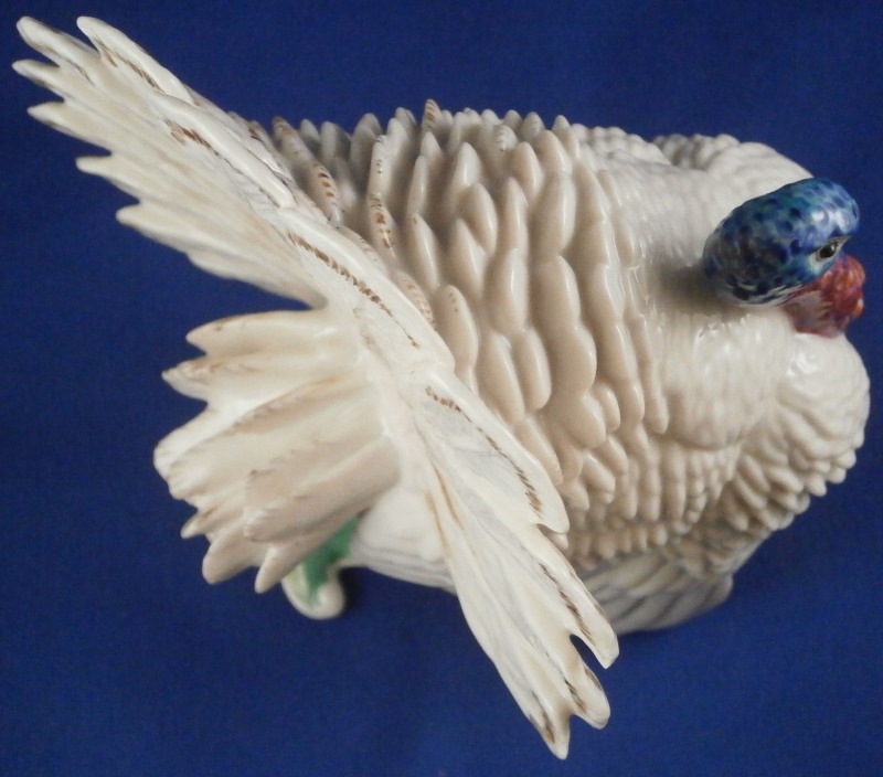 This is a fun figurine of a male turkey aka Tom made by Nymphenburg in the middle of the 20th century. It was first designed by Terletzki-Scherf who is probably one of the two best known animal designers of this factory. Hers are generally the more fun ones while Kaerner has the more realistic ones. This piece here is another great example of this superb artist! One of the nicest turkeys I have ever seen in porcelain and difficult to find. Very well modeled and painted just enough to make it look fun and elegant especially the fun base. The figure is 5.5 inches tall, 4.625 inches wide and about 4.25 inches from breast to tail. The bird is marked with the impressed shield mark underneath with the model number 936 over 3 and the green shield mark with the word Nymphenburg under it. I do believe the artist initials are on the back of the base but they are impossible to see. The figure is in excellent condition with a thin small chip off one of the plume's feathers. Displays perfectly! Please email me for more information or other pictures.