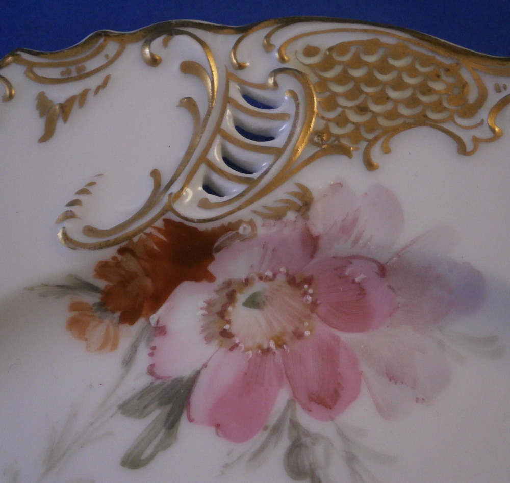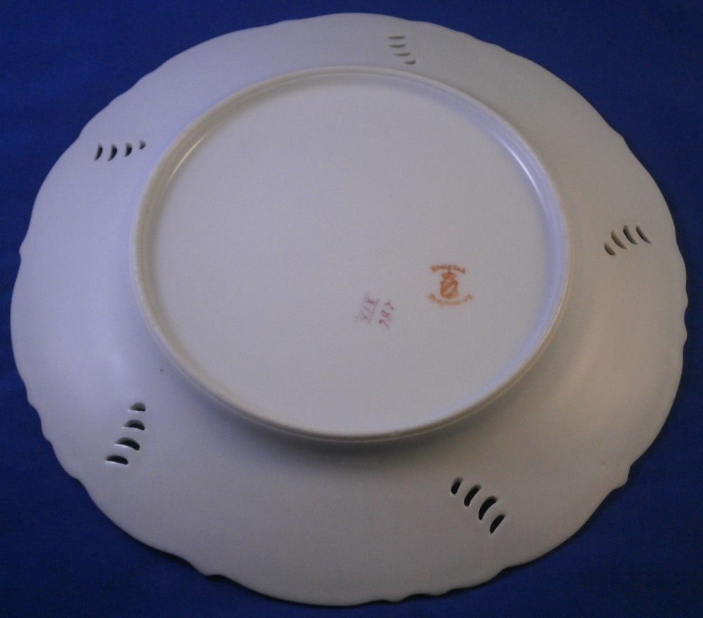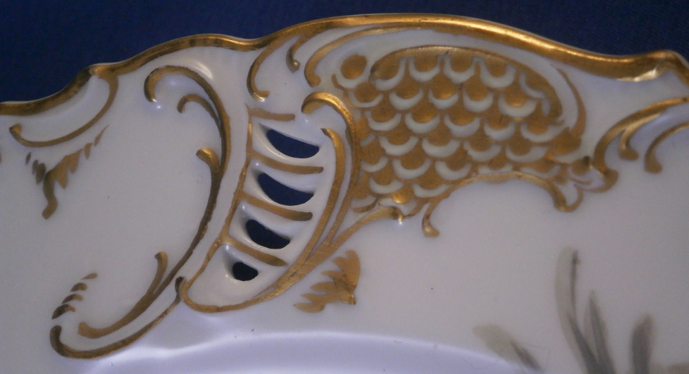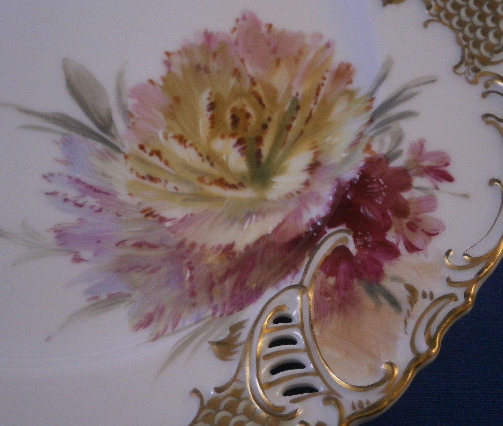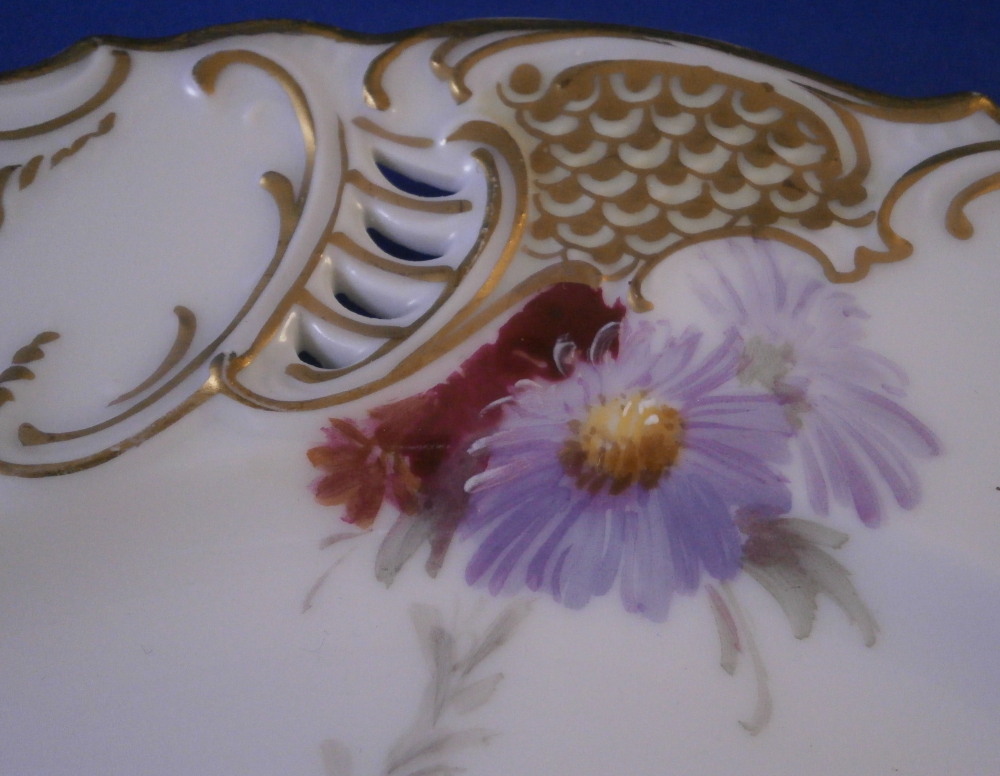 This is a superb plate made by Nymphenburg in the late 19th century. A very typical shape for them during this Art Nouveau / Jugendstil period with the flowers being their answer to the Weichmalerei flowers at KPM. The plate is superbly modeled with a fancy rim design including five reticulated panels with a gold scale design next to them. There is one large polychrome floral arrangement to one side and two smaller ones to the other plus a small single flower. Lots of nice gilding. There are even the raised white enamel highlights to the flowers just like KPM used. A stunning example! The plate is marked with the rare orange shield and crown mark with Koeniglich above and Nymphenburg below. This was used in the late 19th century. There are also some Roman numerals and numbers plus the impressed shield mark with the crown above as shown. The plate is 1 inch tall and 8.375 inches in diameter. It is in great condition with just a touch of wear to the gilding to the very edge of the plate and a tiny chip to the footring as shown. I own a second plate matching this one if anyone is interested in a very rare pair. Please email me for more information or other pictures.