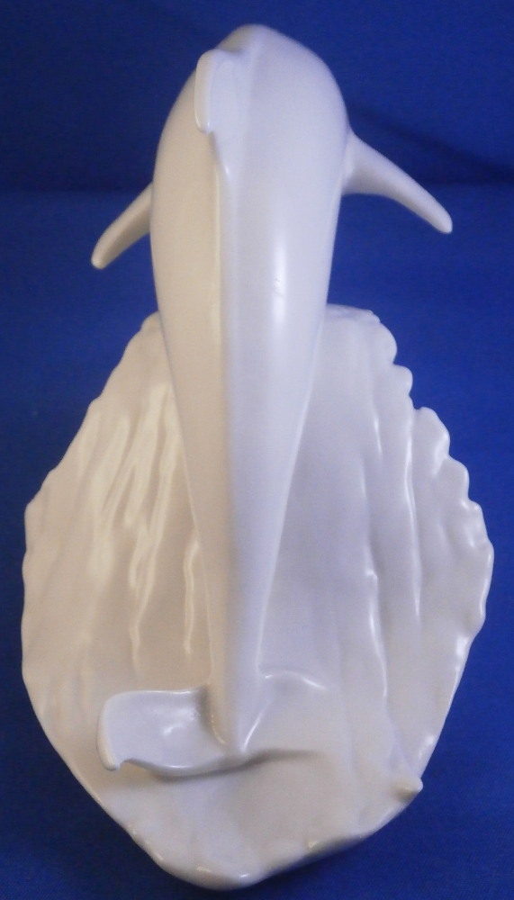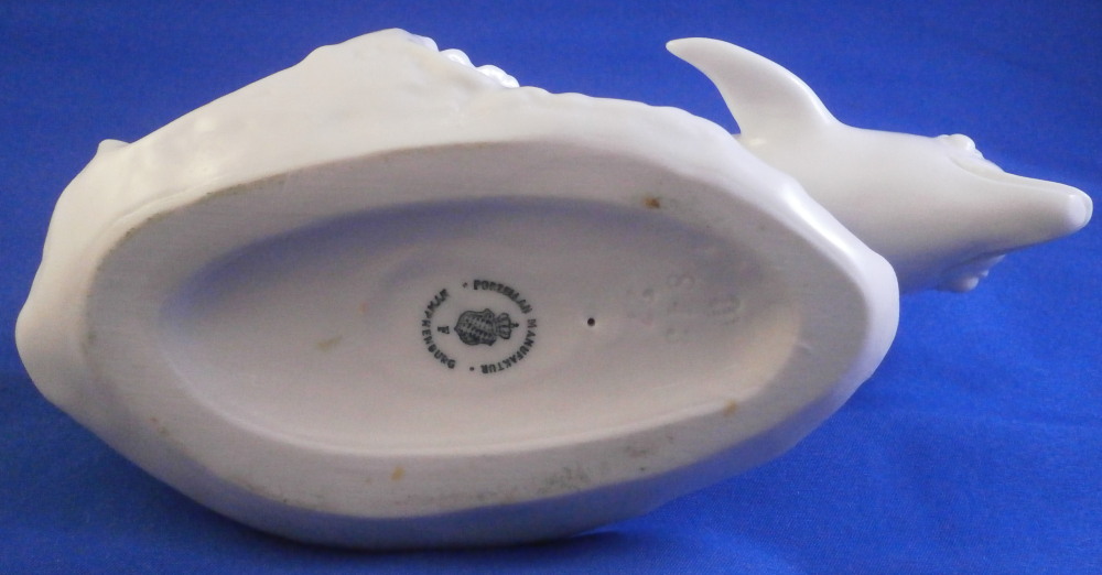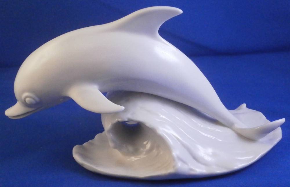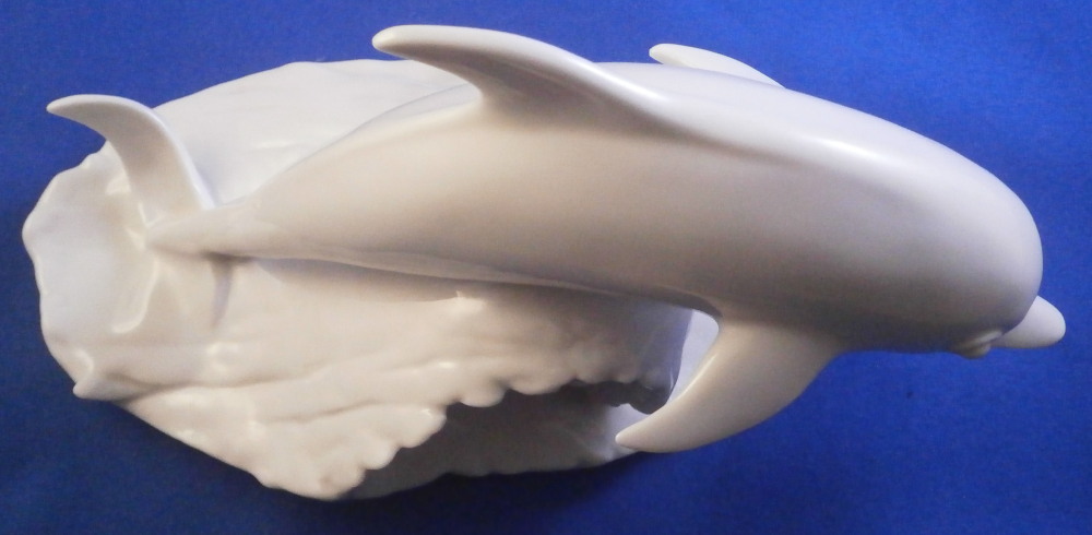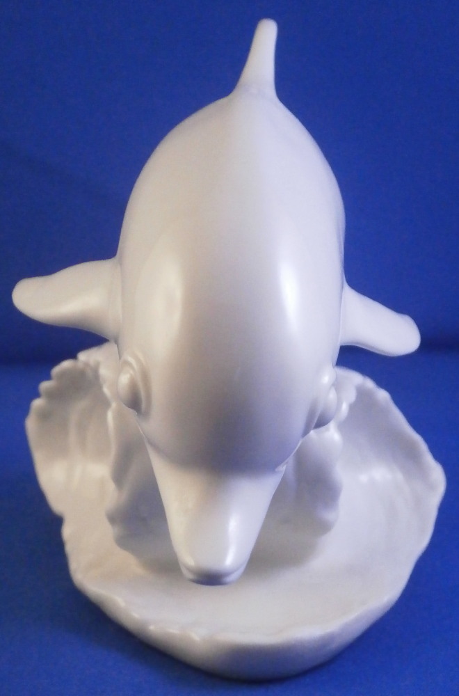 This is a superb figurine of a dolphin made by Nymphenburg during the later 20th century. An unusual piece one does not see often at all! A very sleek design of dolphin riding a wave that was designed by the famous Terletzki-Scherf so you know it is a superb piece! It is modeled perfectly and left in the white to show off all that amazing detail. I also own the painted version both have their own charm! The figurine is 4 inches tall, 3.125 inches wide and 6.75 inches long so a nice size. It is marked with the impressed shield mark underneath with the number 843 over 27 under it. Also marked with the green shield mark with the word Porzellan Manufaktur Nymphenburg around it as shown. The piece is in perfect condition. Please email me for more information or other pictures.