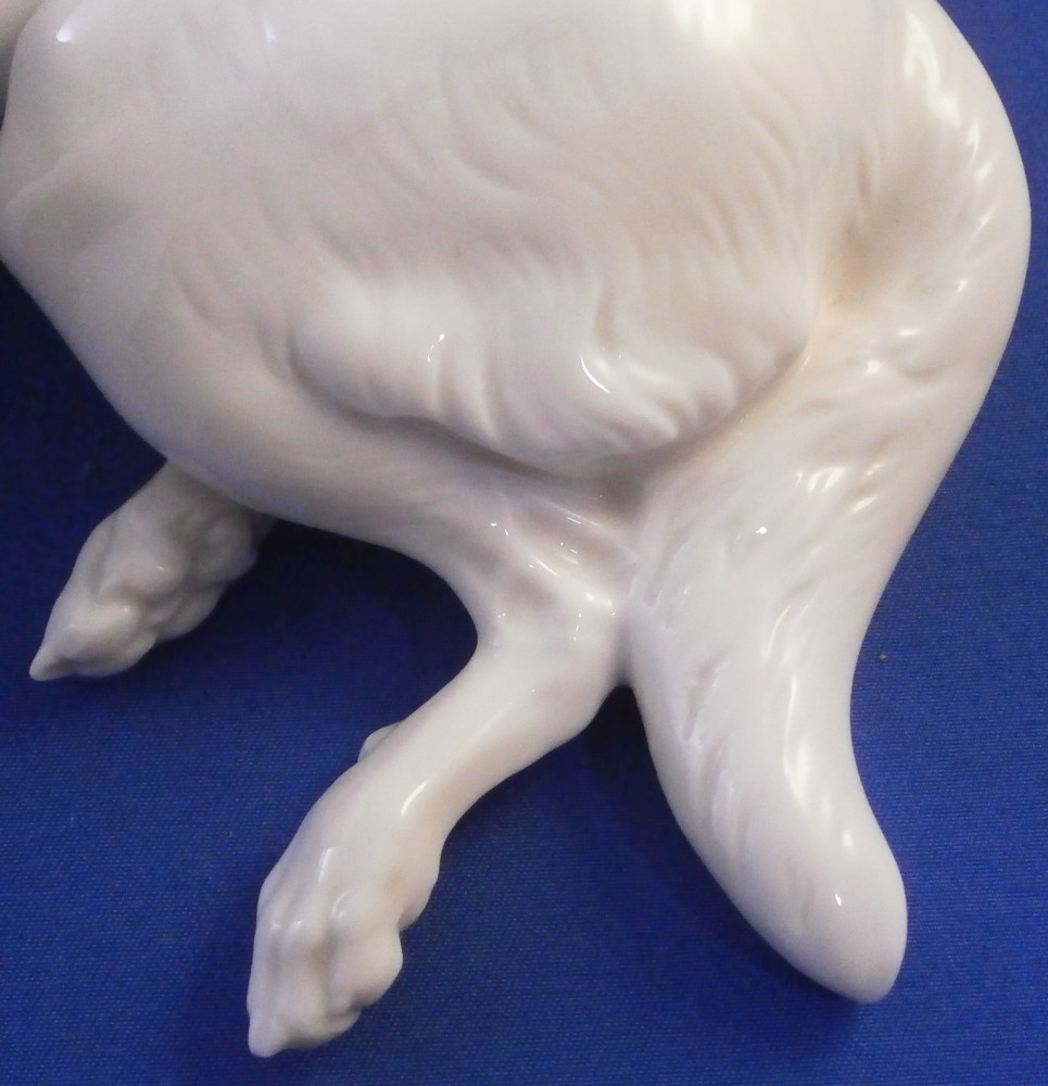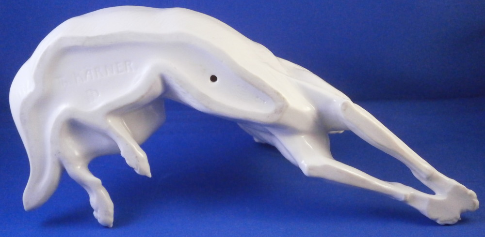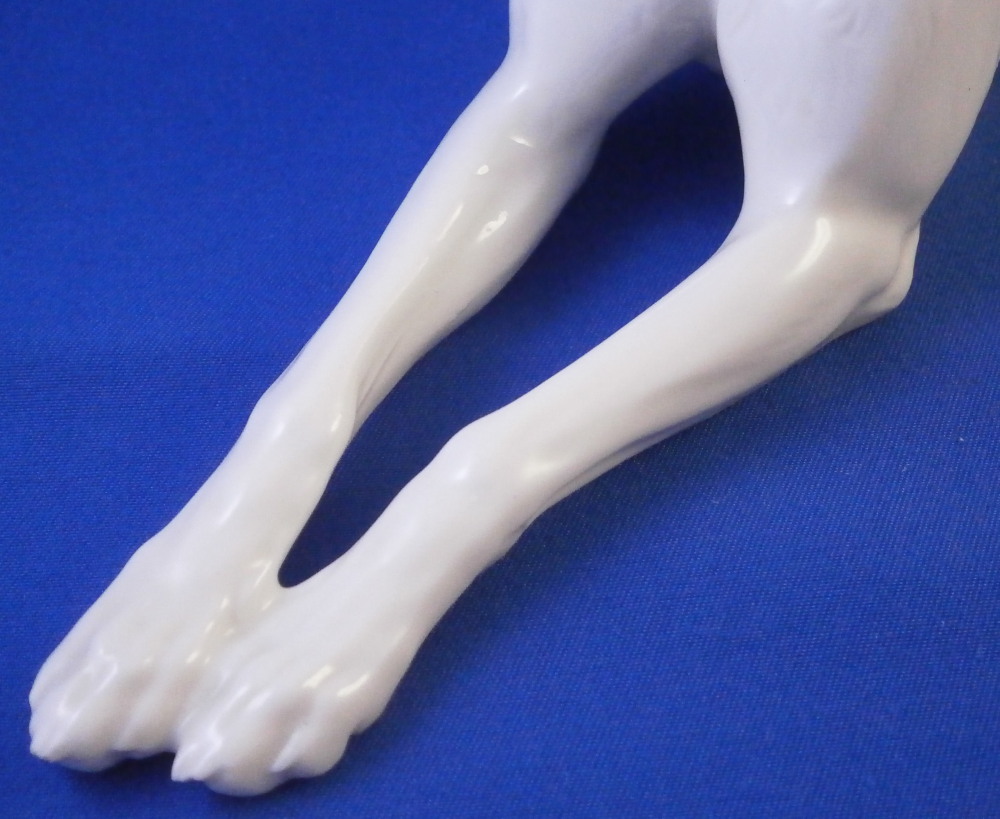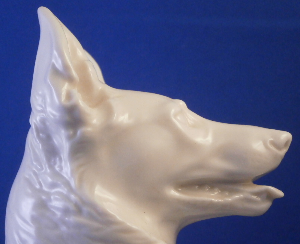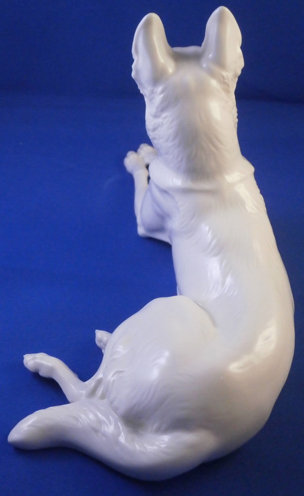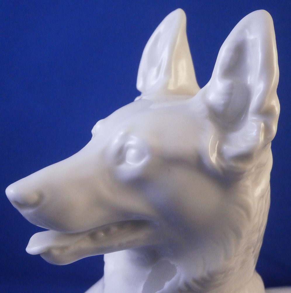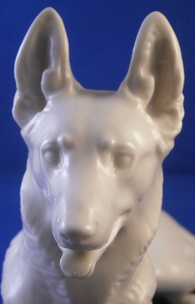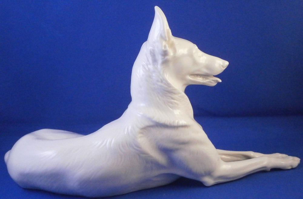 This is a figurine of a German Shepherd made by Nymphenburg in the early to mid 20th century. It is superbly modeled as one would expect from Nymphenburg with lots of detail and left in the white to show it all off. The figure is in excellent condition. It is marked underneath with the impressed shield mark and the numbers 5 and an incised 398 as well as the modelers name impressed. Theodor Kaerner who is probably the best animal designer ever. The piece is 5.375 inches tall, 9.75 inches long and 5.25 inches deep. Please email me for more information or other pictures.