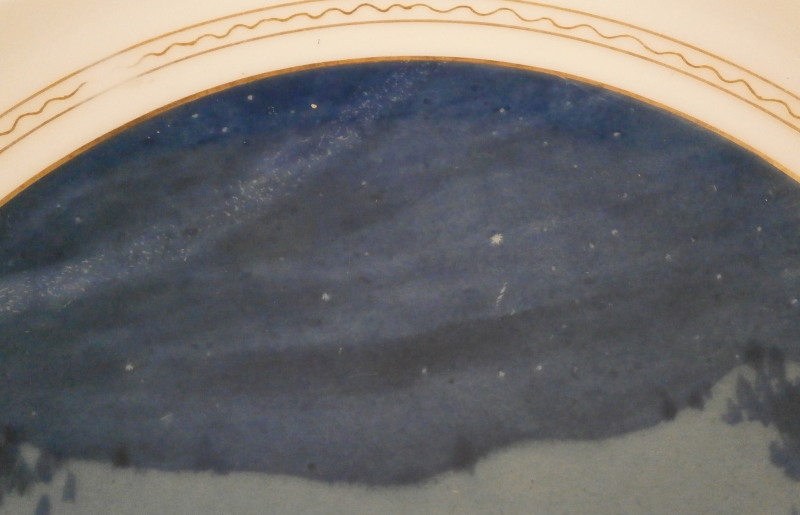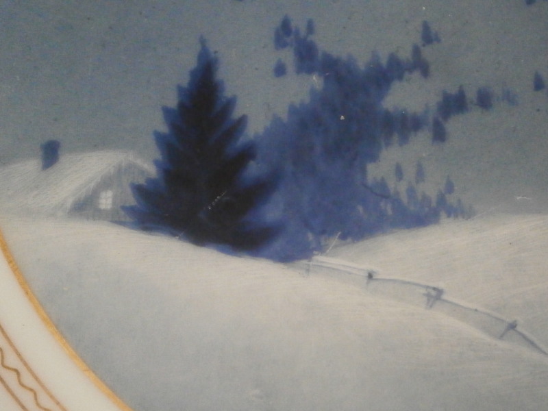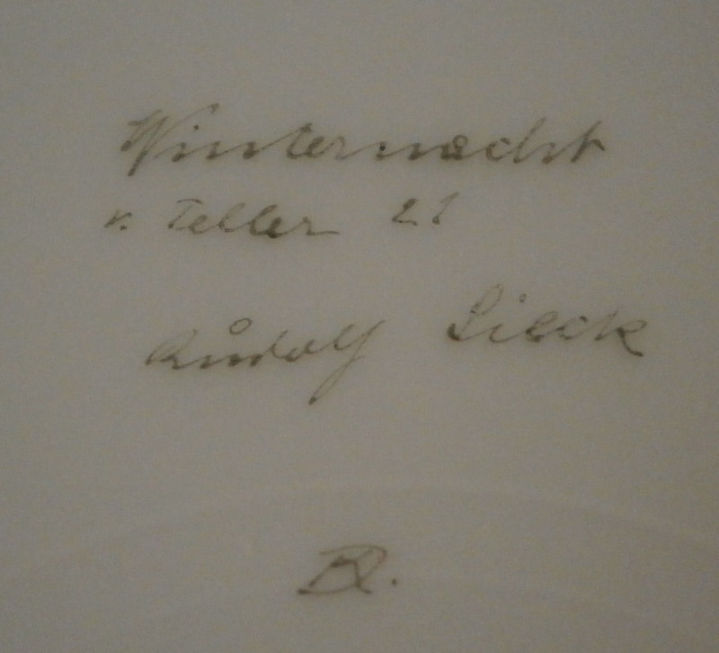 This is a hard to find dinner plate made by Nymphenburg in the early 20th century during the original period in about 1906/08. The plate design itself is from the Pearl service with those little "pearls" along the edge - it is an old design dating back to the 18th century. The central painting however was first done by Rudolf Sieck around 1906/08. It is titled Winternacht - winter night - a very Art Nouveau feel design of winter scene of snow covered mountains with trees, a house with a fence and a starry sky. There is a nice gold trim around the edge of the well. A really nice plate that is hard to find especially from the original period and in this size! It was likely painted by the artist himself! The plate is 1.125 inches tall and 9.875 inches in diameter. It is well marked with the printed shield mark with the word Nymphenburg underneath, the impressed shield mark, the usual black numbers, Winternach w. Teller 21 (I think) and signed Rudolf Sieck as well as his initials as shown. The piece is in great condition with some very minor wear. Please email me for more information or other pictures.