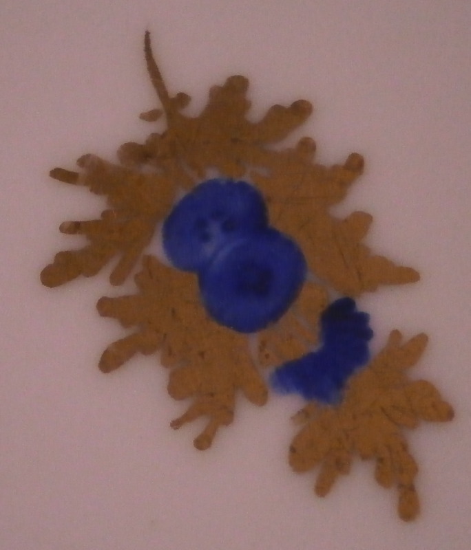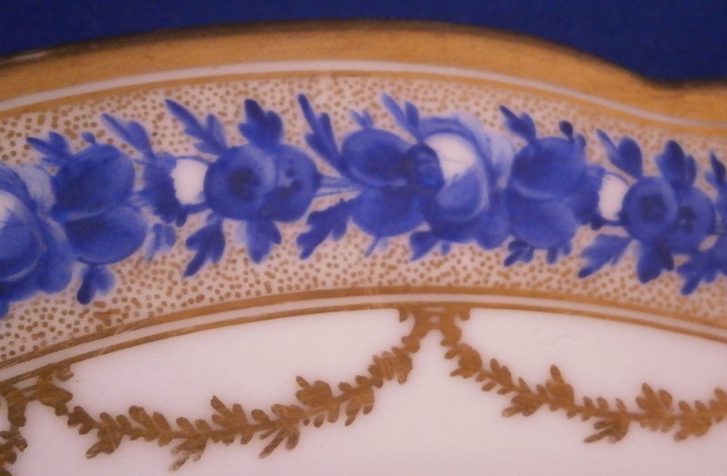 This is a nice little plate made by Nyon around 1780. It is hand painted with a blue and gold design consisting of flowers and garlands and gold dots along the rim with a blue flower with gold leaves design to the center. The piece is marked underneath with the under glaze blue fish mark as shown. It is in great condition with some very minimal wear. About as nice as you will find! The plate is 1.125 inches tall and 7.25 inches in diameter. Please email me for more information or other pictures.