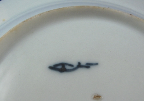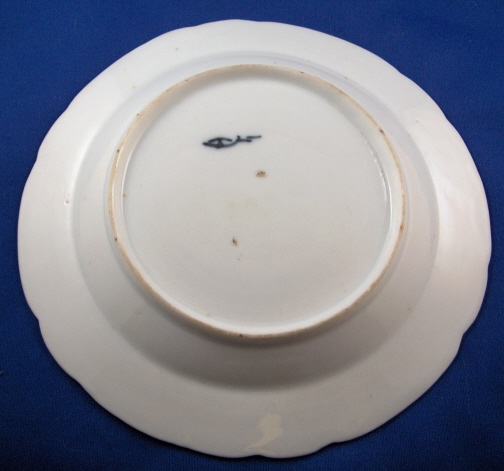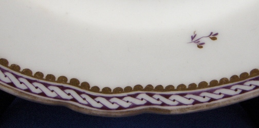 This is a plate made by Nyon around 1780. It is handpainted with a gold and purple design to the rim as well as gold and purple small sprigs around the rest of the plate. It is marked underneath with the underglaze blue fish mark and in good condition. Some wear mostly to the outermost gold trim. No chips, etc. The plate is 1 inch tall and 7.25 inches in diameter. Please email me for more information or other pictures.