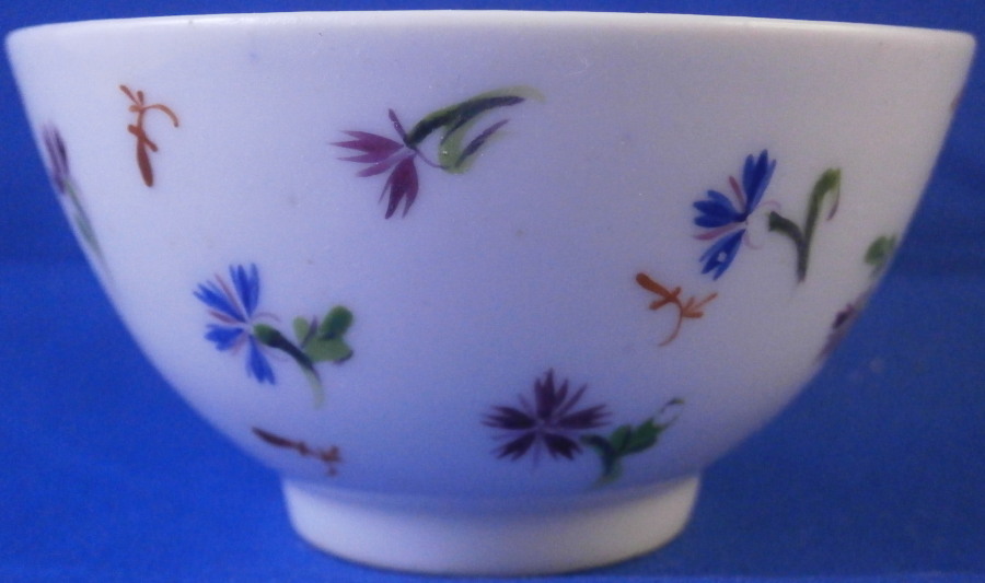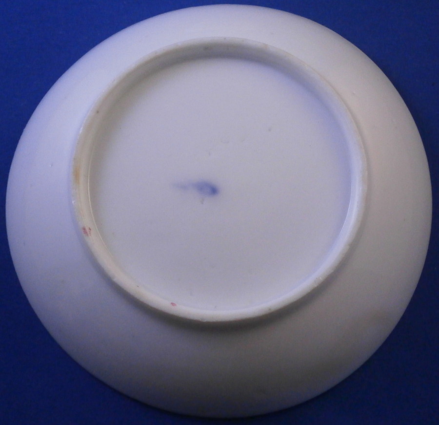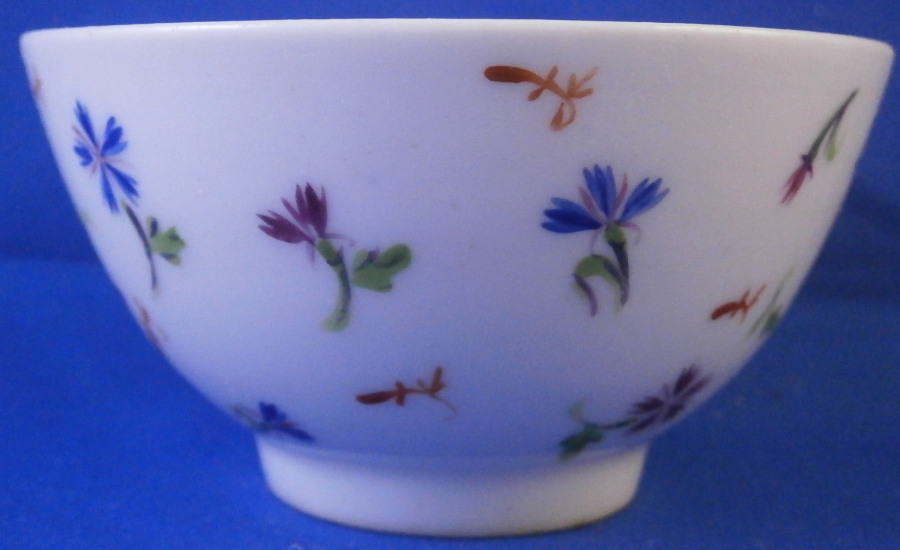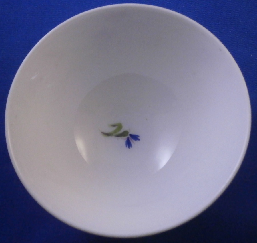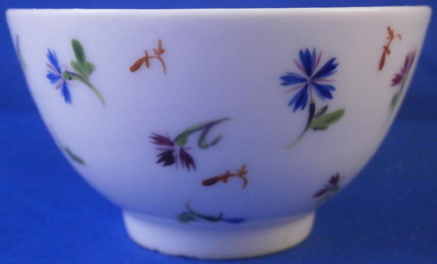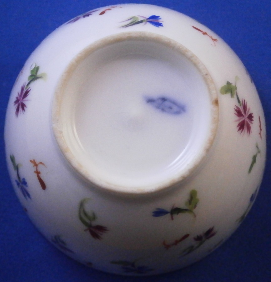 This is a nice handleless cup and saucer made by Nyon around 1780. Both the teabowl and saucer are hand painted with lots of little cornflowers both in puce and blue with iron red leaves in between. This design is quite typical for Nyon. It looks really ncie and Cornflowers were very popular during this period and I think were a favorite of Marie Antoinette which propably helped popularize them. The set is marked underneath with the under glaze blue fish mark as shown. They are in great condition with a tiny green paint flake to a flower on the cup. They display perfectly! Typical smokey foot ring color which is a hallmark of this maker. The cup is 1.75 inches tall and 3.25 inches in diameter. The saucer is 1.125 inches tall and 5.375 inches in diameter. Please email me for more information or other pictures.