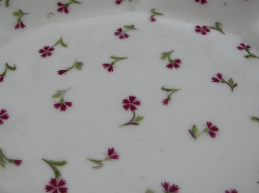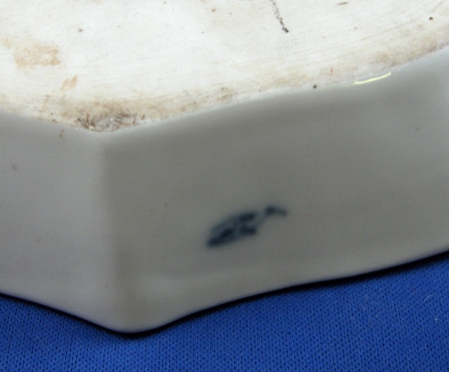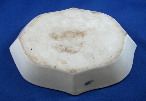 This is a teapot stand made by Nyon around 1780. It is handpainted with puce and green flowers all around. The stand is marked on the outside rim with the underglaze blue fish mark since the bottom of the stand is unglazed. It is in perfect condition. The piece is a nice shape. It is 1 inch tall, 7.875 inches wide and 6.375 inches deep. Please email me for more information or other pictures.
