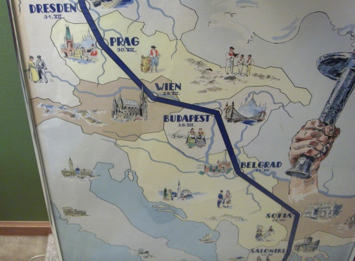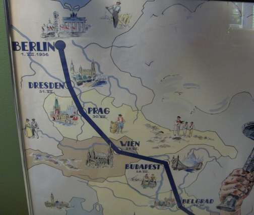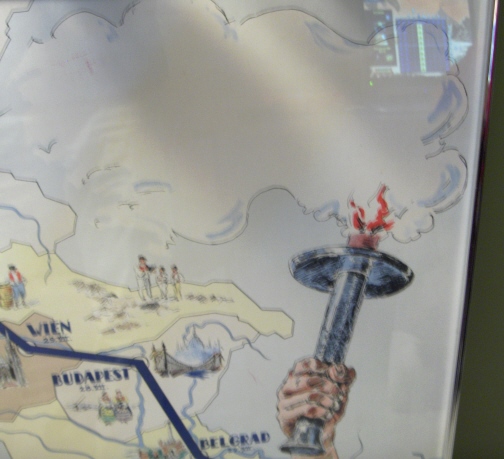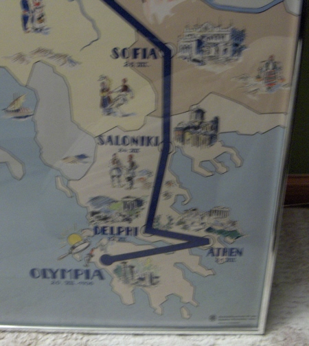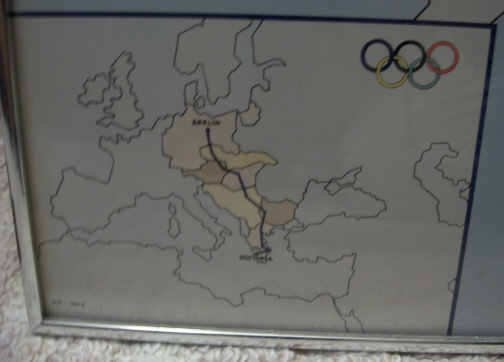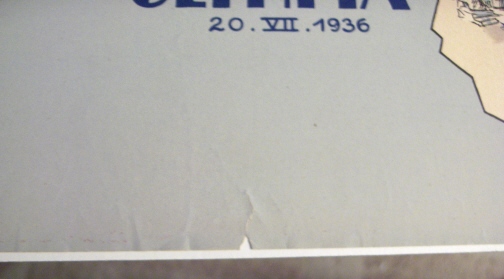 This is a rare poster from the 1936 Olympics in Berlin. It was published by the Reichsbahnzentrale fuer den Deutschen Reiseverkehr ( Reich Committee for Tourist Traffic ), Berlin and was printed in Germany. The other corner has a small AO-1364 d. in it which I have no idea of the meaning. The poster is superb and I bought it because being from Germany one likes the occasional thing like this in the house but only because there is no Nazi symbolism anywhere to be found which actually surprised me. The poster shows the route of the torch from Greece to Germany. Nicely done! The poster is about 25 inches wide and 39.75 inches tall but the frame is a tiny bit bigger. It is signed in print in the top right hand corner but I am not sure what exactly the name is. The poster looks to be in perfect condition barring the tiny edge one cannot see with this frame. I took the poster out of the frame and it is glued onto a thicker backing cardboard. It seems rather thin and fragile by itself so that moved probably allowed it to survive so well. Also a bit of edge damage hidden under the frame (a very thin frame so any frame you use will hide it and a rip on the bottom about one inch in from the edge as shown. There is one small area of reddish transfer in the smoke cloud of the torch which came from some other object and doesn't take away from the piece at all. I have only been able to find one other poster like it in England for a crazy price and that said Olympia Torch Relay-Race 1936 in blue in the smoke of the torch while this one here is blank. I assume these were printed in different languages maybe after the fact??!! Not my specialty but this is certainly a superb piece of sports history in amazing shape. The frame and glass are in good shape as well. Please email me for more information or other pictures.