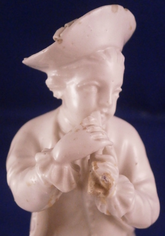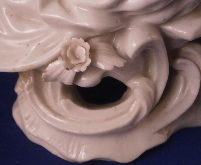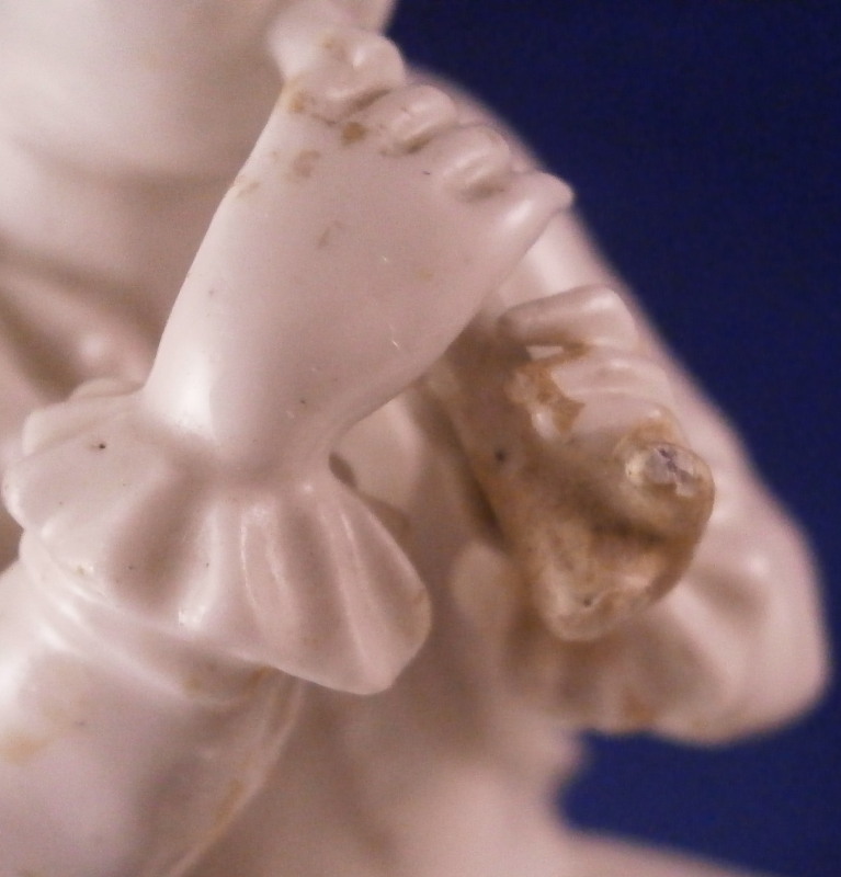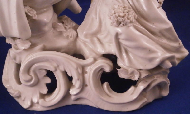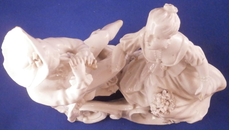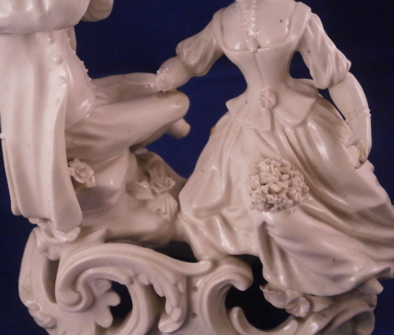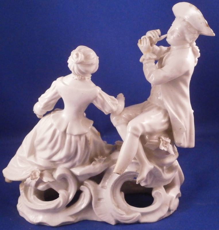 This is a nice figurine made by Orleans in about 1770. I have seen this model sold as made by Mennecy but I am fairly certain it was actually made in Orleans. Either way it is a nicely modeled figure of a couple made in soft paste porcelain. The gentleman is playing his flute while the lady is watching attentively. Both are sitting on a scroll work base quite typical of this maker. The lady has a little bird's nest on her lap. The figure is plain white but glazed and since it is made of softpaste porcelain it looks quite elegant. Orleans started making porcelain around 1767 under Claude-Charles Gerault d'Areaubert who died in 1782. After him his widow took over for a while and then some other people until it closed in 1812 I think. The piece is unmarked which is very common on pieces from this period. It displays nicely but has flaws - the flute is missing its end though his fingers seems to be intact, he is missing one of his feet while the lady is missing both of heres and her one hand which I believe should also have held an adult bird. One chip to a finger, a corner of his coat and some chips to his hat and the occasional leaf but otherwise it is in great shape given the age and the missing pieces are not very obvious when on display at all. The figurine is 6.5 inches tall, 6 inches wide and 3.25 inches deep. Please email me for more information or other pictures.
