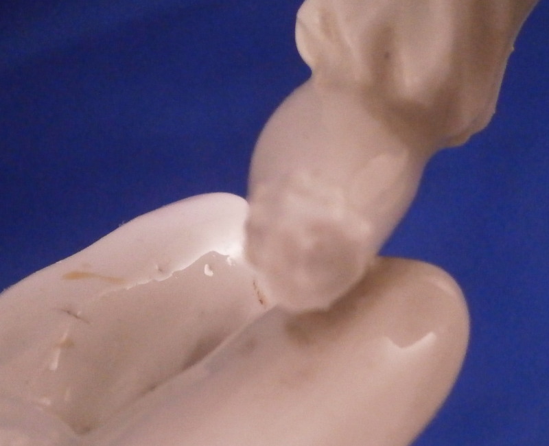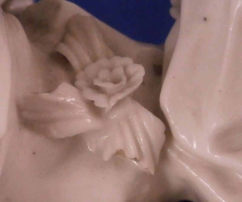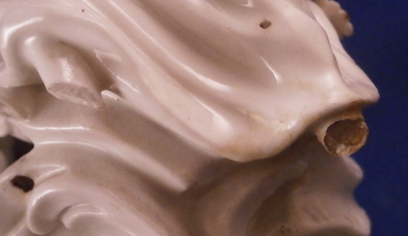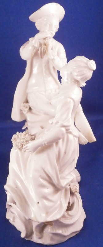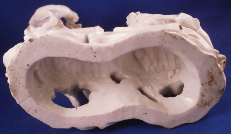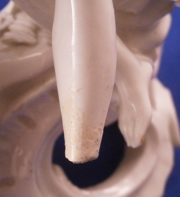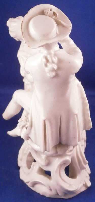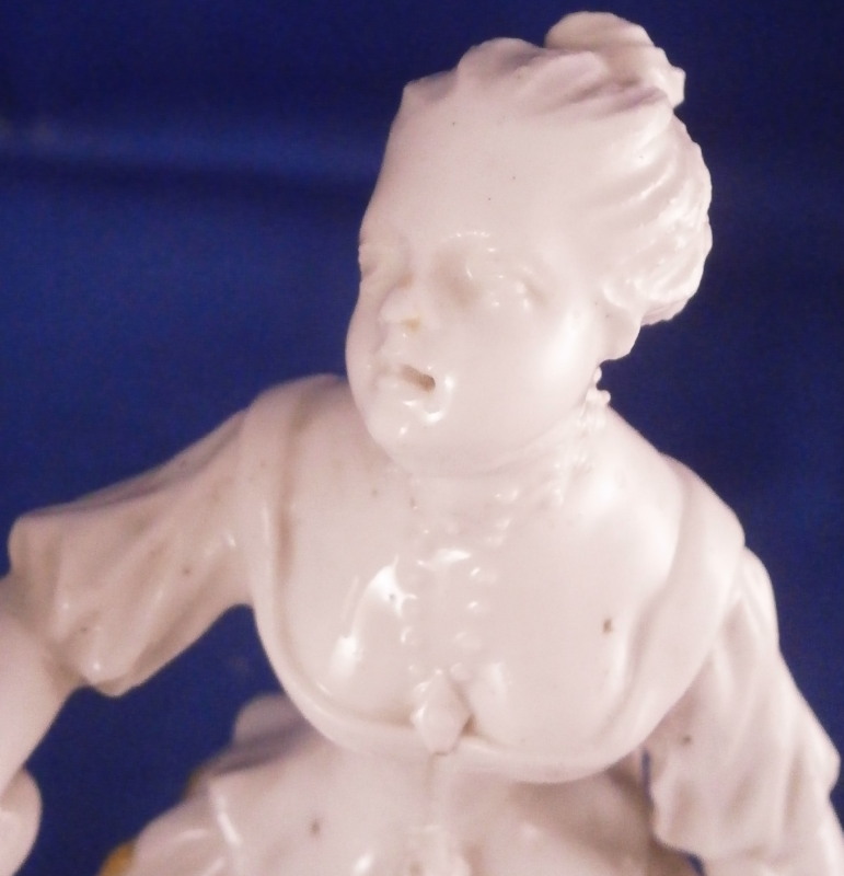 This is a nice figurine made by Orleans in about 1770. I have seen this model sold as made by Mennecy but I am fairly certain it was actually made in Orleans. Either way it is a nicely modeled figure of a couple made in soft paste porcelain. The gentleman is playing his flute while the lady is watching attentively. Both are sitting on a scroll work base quite typical of this maker. The lady has a little bird's nest on her lap. The figure is plain white but glazed and since it is made of softpaste porcelain it looks quite elegant. Orleans started making porcelain around 1767 under Claude-Charles Gerault d'Areaubert who died in 1782. After him his widow took over for a while and then some other people until it closed in 1812 I think. The piece is unmarked which is very common on pieces from this period. It displays nicely but has flaws - the flute is missing its end though his fingers seems to be intact, he is missing one of his feet while the lady is missing both of heres and her one hand which I believe should also have held an adult bird. One chip to a finger, a corner of his coat and some chips to his hat and the occasional leaf but otherwise it is in great shape given the age and the missing pieces are not very obvious when on display at all. The figurine is 6.5 inches tall, 6 inches wide and 3.25 inches deep. Please email me for more information or other pictures.