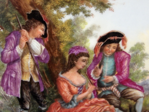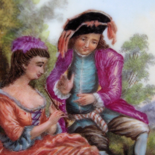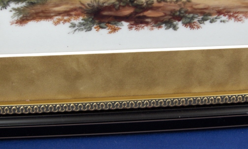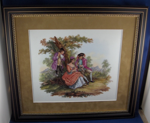 This is a porcelain plaque of a handpainted Watteau style scene most likely made in Germany. It is rare to find one of this style and size. It is extremely well painted with nice colors and detail. The frame seems to be brand new and the matte is a greenish velvet kind that is one of the more expensive ones you can find. So no expense was spared to make this piece look superb. I never did open the back to see if there is a mark and don't see much of a point in that. The piece is in perfect condition. The porcelain part that shows is 8 inches tall and 9.25 inches wide. The frame is 13 inches tall, 14.25 inches wide and 1 inch thick. Please email me for more information or photos.