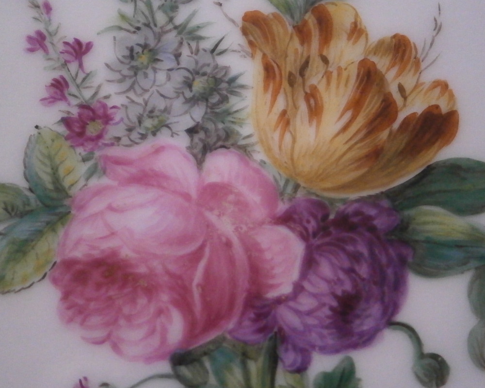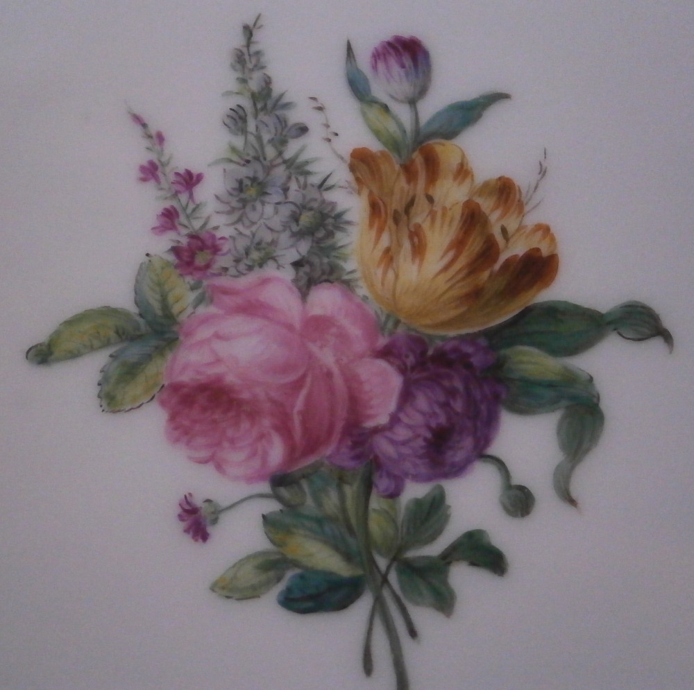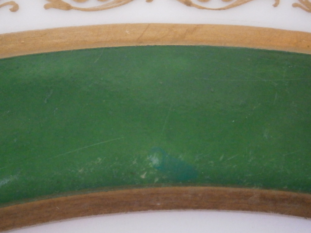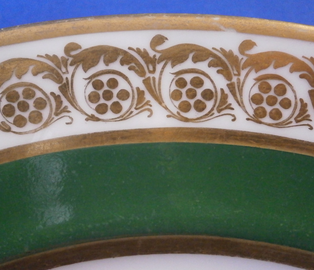 This is a plate made by one of the Paris makers around 1800. It is hand painted with a superb gold trim along the edge and a green band flanked by two thing gold bands covering the rest of the rim. The green color is superb and reminds me a bit of the apple green on Worcester plates that one rarely sees. The center of the plate has a nicely painted floral arrangement to it including different blossoms and leaves. Not sure which maker might have done it but definitely ones of the better French ones from the Paris region. The plate is in great condition with a couple minor white spots in the green trim, some wear to the gilding on the very edge mostly and some very minor use marks. Minor firing flaws to the foot ring from when it was made. It displays very nicely! As is the norm the piece is unmarked except for an incised line as shown typical of this region and period. The plate is 1.125 inches tall and 9.375 inches in diameter. Please email me for more information or other pictures.