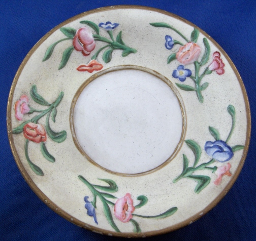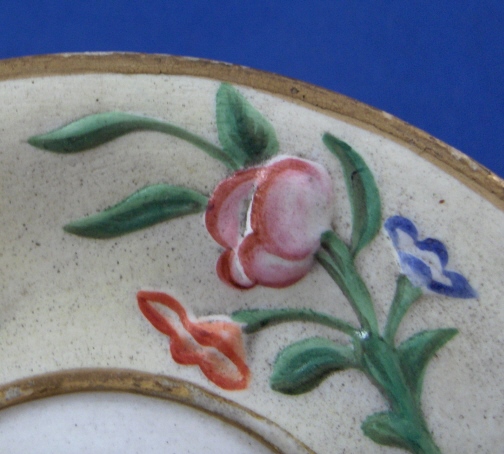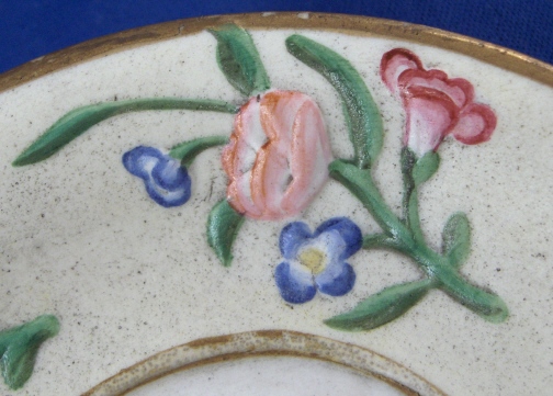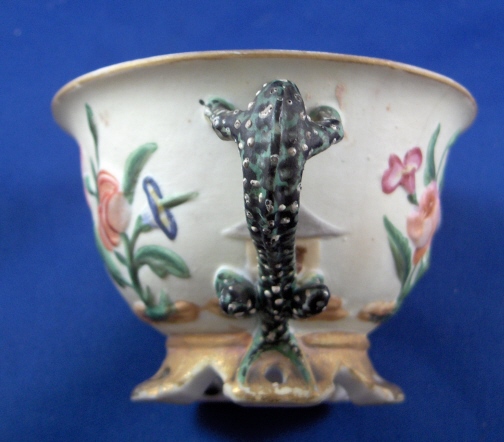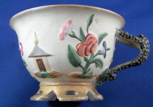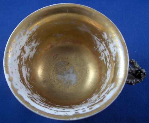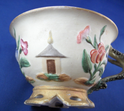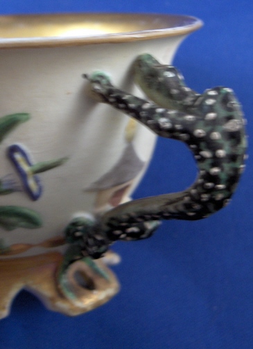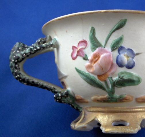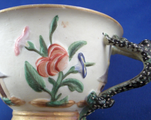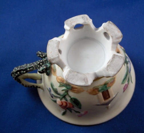 This is a very neat cup and saucer made by one of the Paris makers around 1800. Likely Jacob Petit or one of the better makers. I have never seen a set like it so it is definitely something unusual. The unglazed saucer top is decorated with a floral design in relief that was painted in polychrome. The ground color of the rest except the well is a pale yellow. Nice gold trim as well. The saucer underside is glazed like any other set. The cup outside is also unglazed and decorated in the same way except it also has Asian type houses on it, a superb foot and the handle is the main reason I bought this set - it is in the shape of a lizard! Truly something unique! The inside cup is glazed and fully gilded. The cup and saucer are in great condition but the saucer has three hairlines that are virtually invisible from the top due to it not being glazed. The cup has a single hairline and the inside gilding is worn. The saucer has some flaking to the gold as it was applied to the unglazed porcelain and doesn't hold as well. The saucer looks like it has lots of black spots on top but I suspect it is just dirt in all the small pores of the unglazed surface and will give it a cleaning when I have time. I was curious and gave the saucer a quick once over cleaning and it improved a lot! So that is all it was. With a little more patience it will probably come perfectly clean! The set is unmarked which is common for Paris makers around that time but definitely by one of the top makers! The cup is 2.375 inches tall and 3.75 inches in diameter. The saucer is 1 inches tall and 5.25 inches in diameter. Please email me for more information or other pictures.