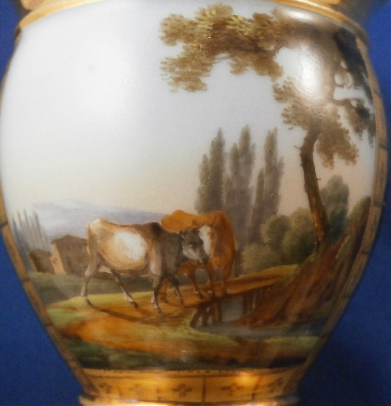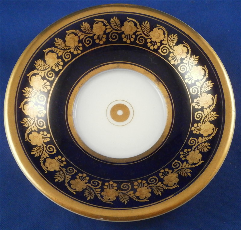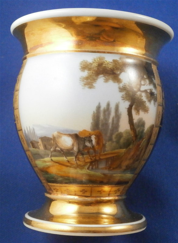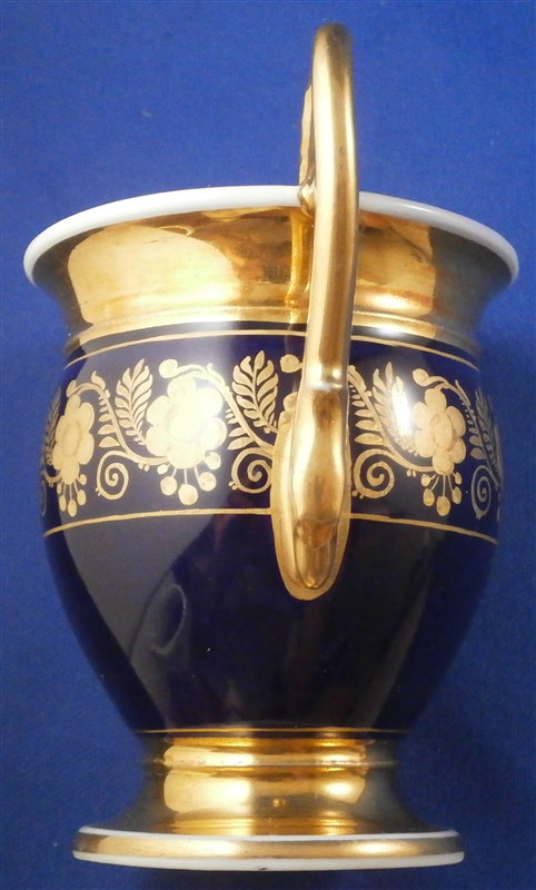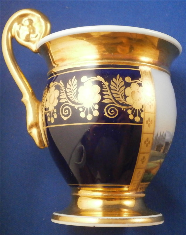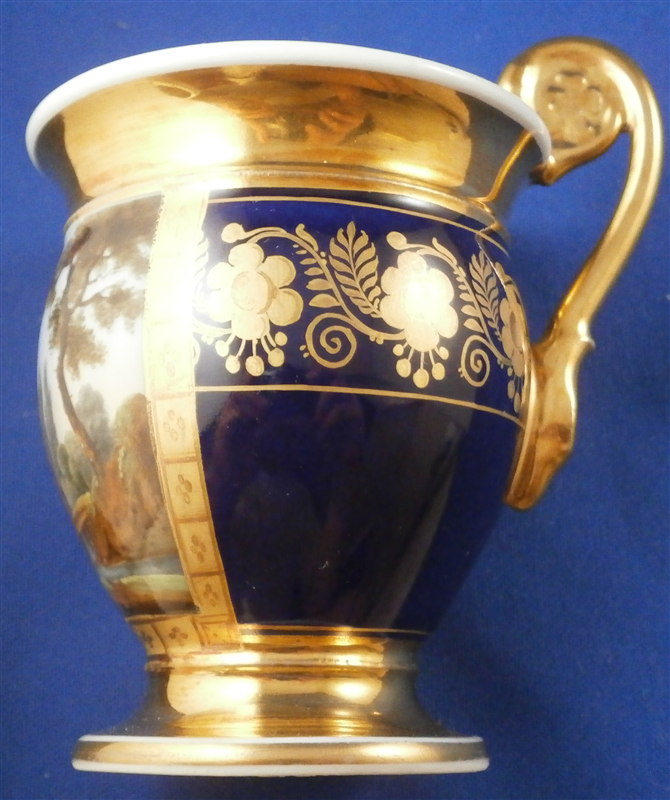 This is a superb cup and saucer made by one of the better Paris region makers around 1800. The cup has a top quality hand painted scene to the front of cattle / cows in a landscape surrounding. The scene is framed by some nice tooled gilding with the rest of the cup having a superb cobalt blue ground color with a nice gold floral design to it. Gold trim to the top, bottom, inside and handle. Nice handle shape in the form of a swan's head. The saucer has the same deep blue ground color with that nice gilding to it. The set is in perfect condition with the slightest amount of wear to the central ring of the saucer. Neither piece is marked except for an incised line underneath the saucer but that is the norm for these pieces. The cup is 3.875 inches tall including the handle which sticks up about 0.625 inches above the rest of the cup and 2.75 inches in diameter. The saucer is 0.875 inches tall and 5.125 inches in diameter. Please email me for more information or other pictures.