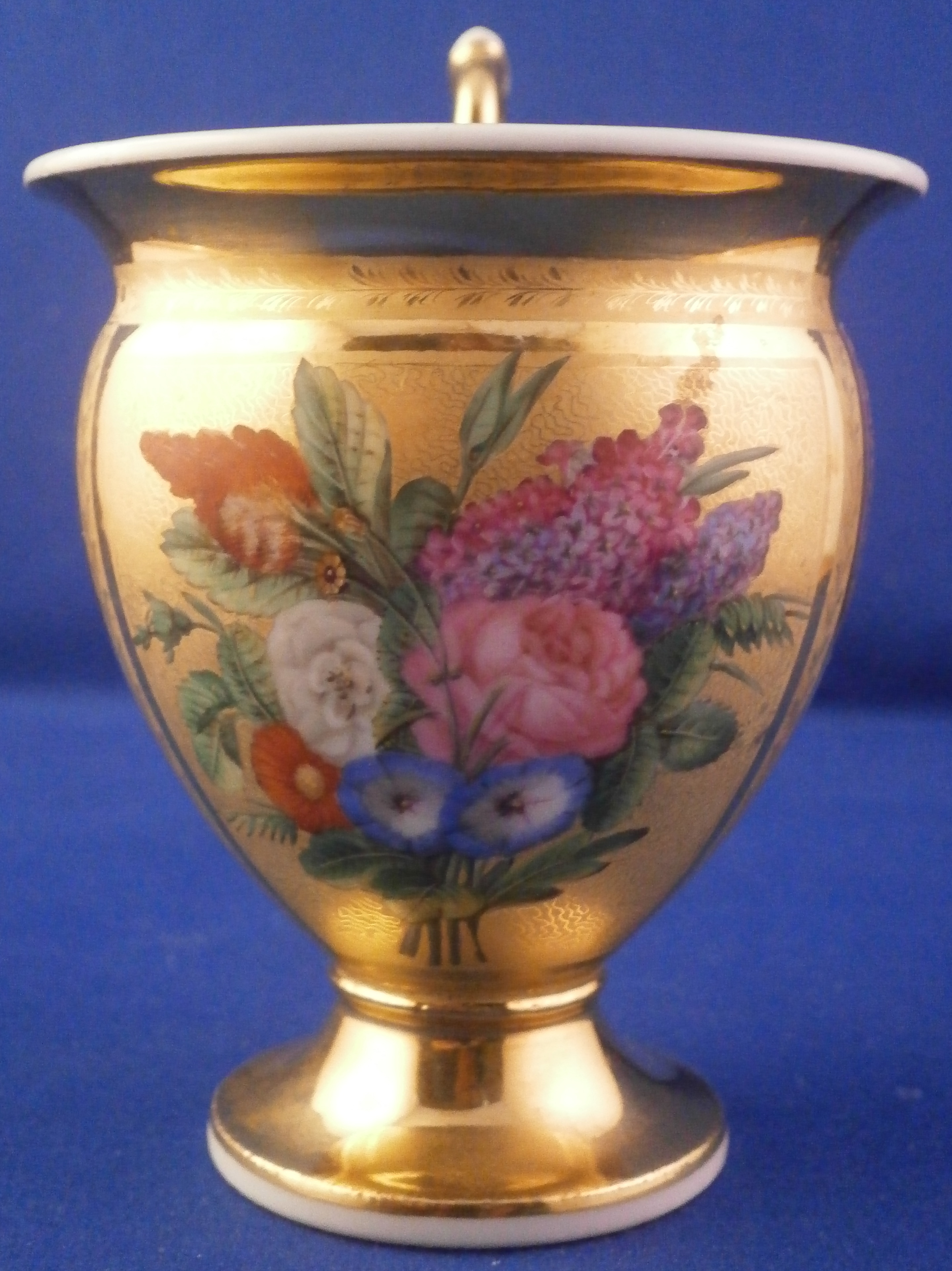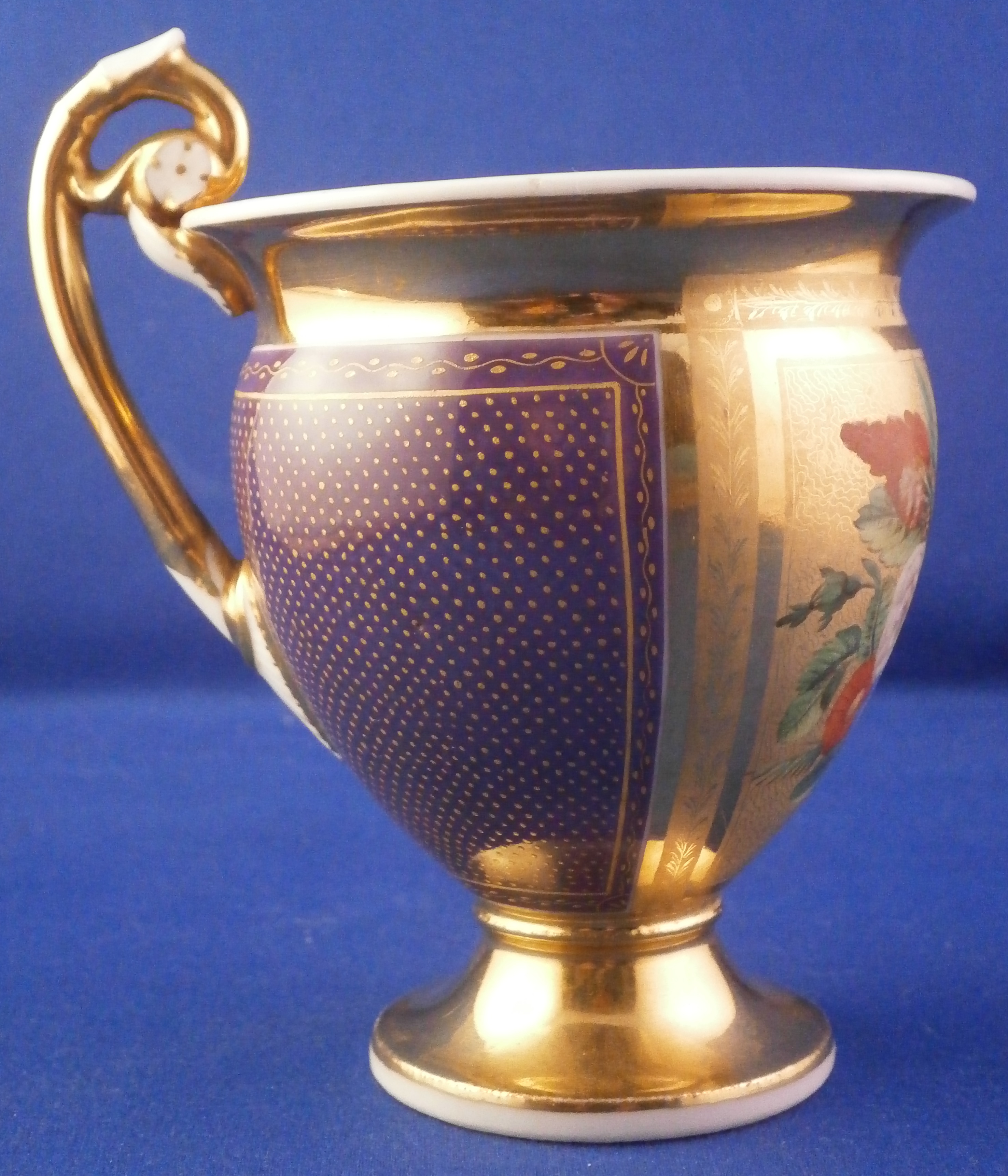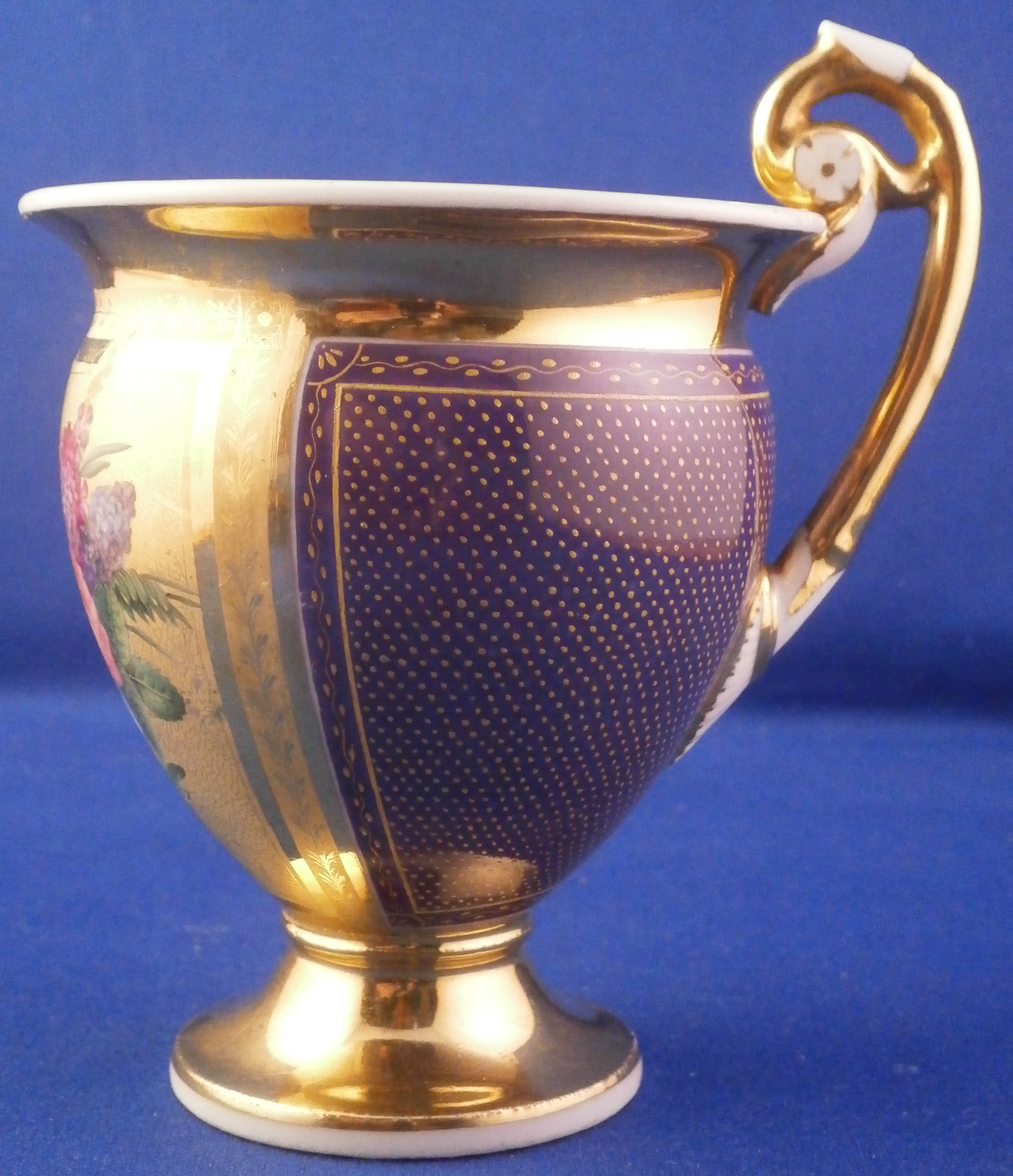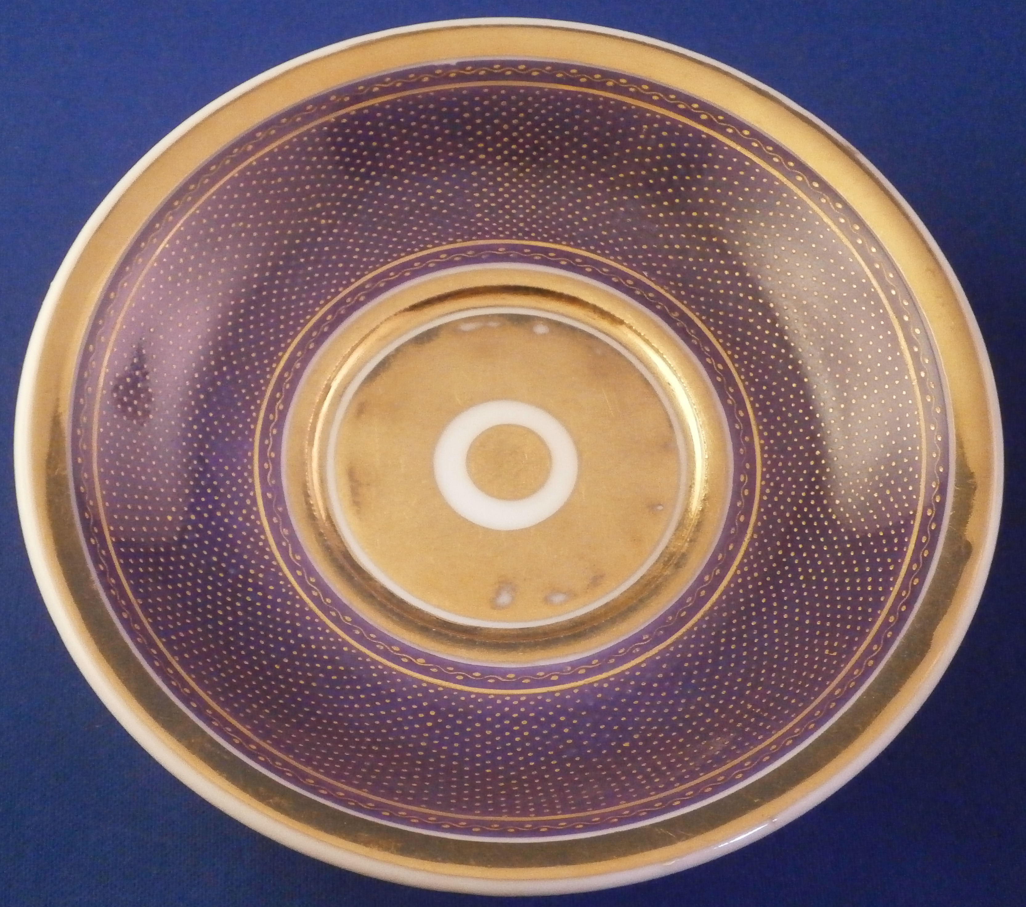 This is a really nice cup and saucer made by one of the Paris makers around 1800. One of the nicest floral cups I have seen by them and probably done by one of the top makers liek Dagoty or Nast . The cup has a nice shape to it and is hand painted with a nice floral arrangement to the front with the area around the flowers gilded with a vermicelli tooled type ground and a gold frame with a tooled design around that. The rest of the piece has a purple ground with tiny gold dots throughout and a gold trim to the edge. Even the inside of the cup is msotly gilded with a design aroun the top. Superb handle shappe with a gold and white design to it and a fullt gilded foot. The saucer has the same purple and gold design to it. They look really stunning and with all that fine detail work it must ahve taken ages to complete them. Definitely worth the effort! The set is in perfect condition with just some wear to the well edge of the saucer! There are two discolored lines to the underside rim of the saucer. Not sure what these are from but they are not hairlines or other damage! The set is unmarked which is common for Paris makers around that time. I always wonder why they did not take more pride in their work and mark these top pieces!? The cup is 4.125 inches tall (including the handle) and 3.125 inches in diameter. The saucer is 1.375 inches tall and 5.5 inches in diameter. Please email me for more information or other pictures.