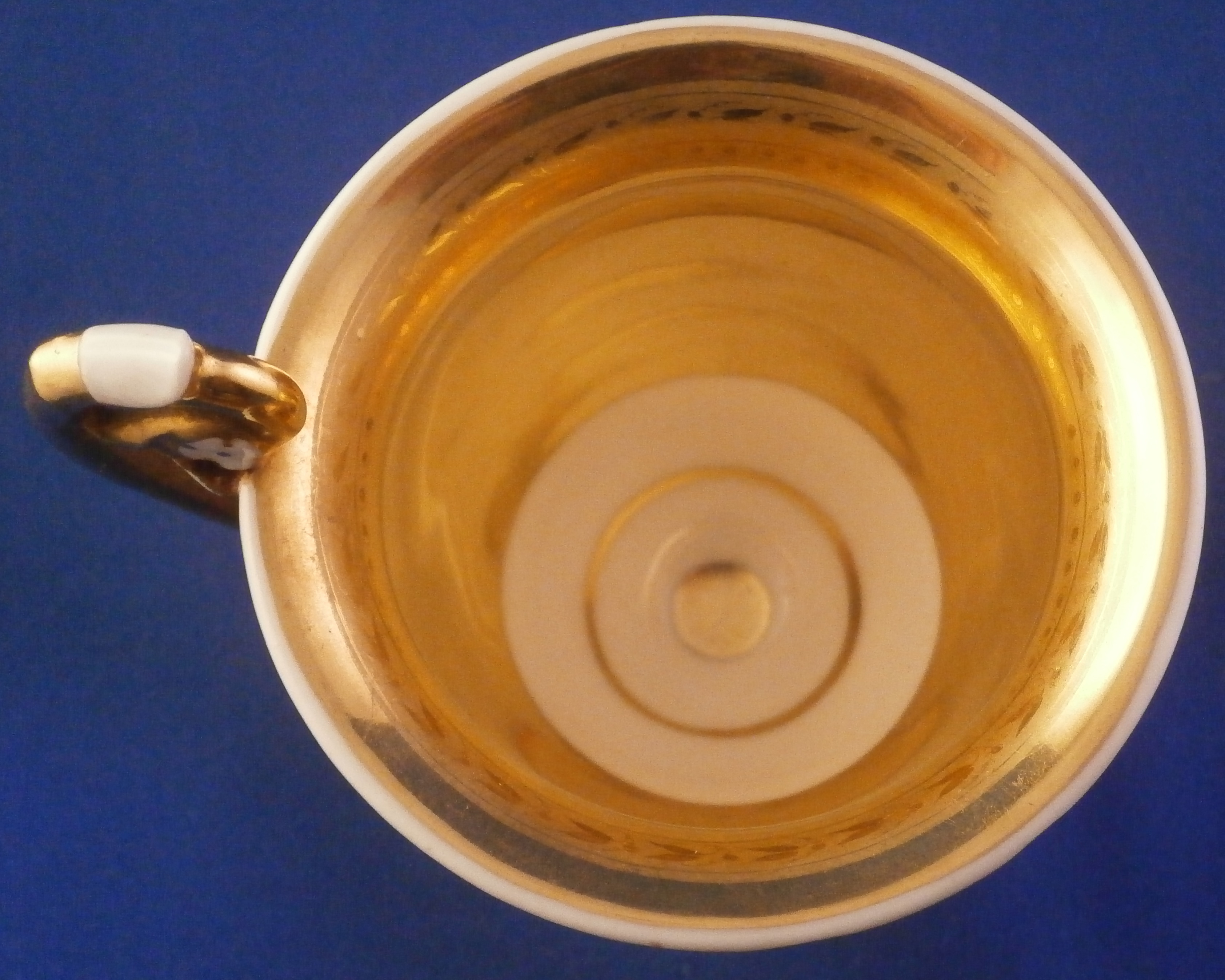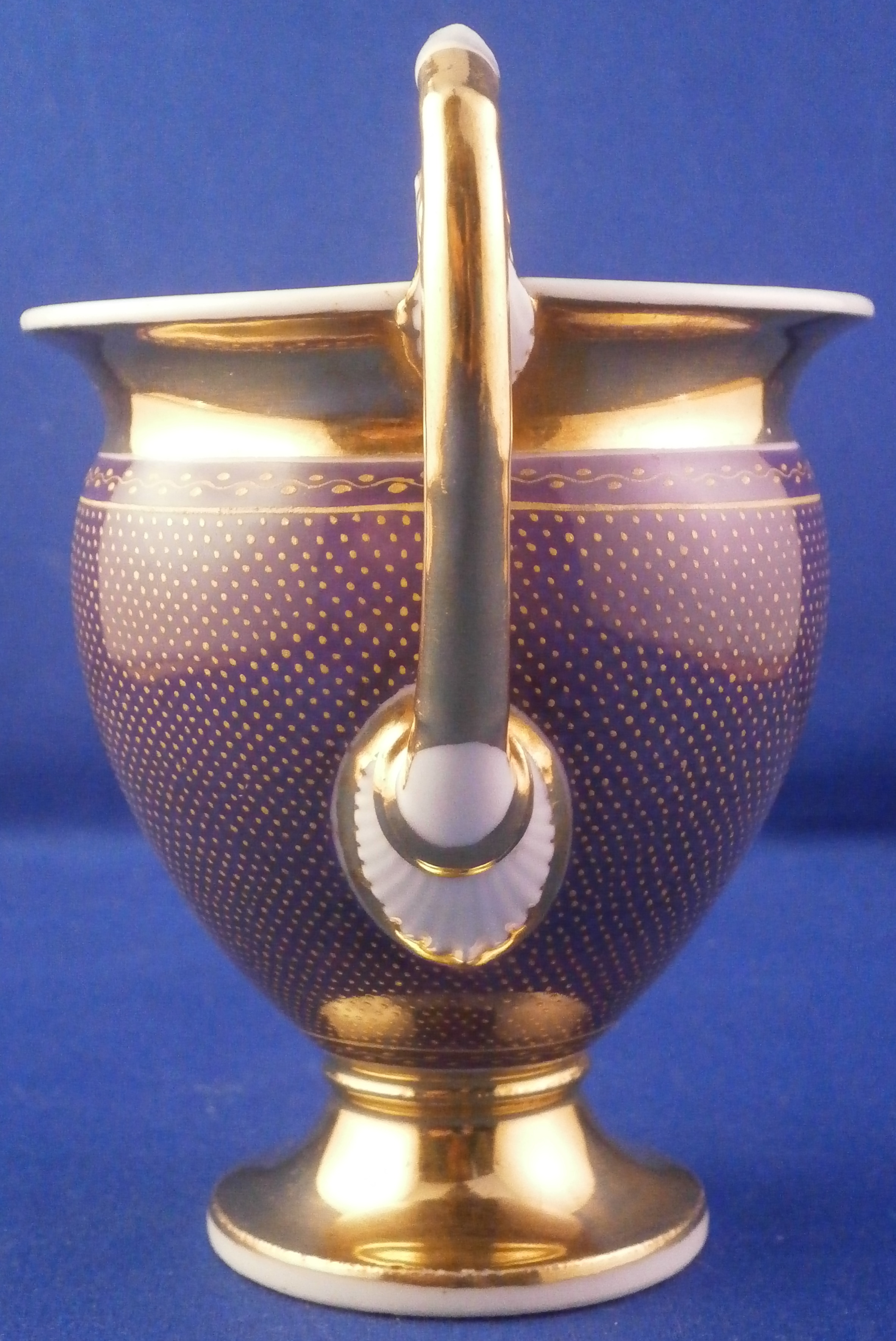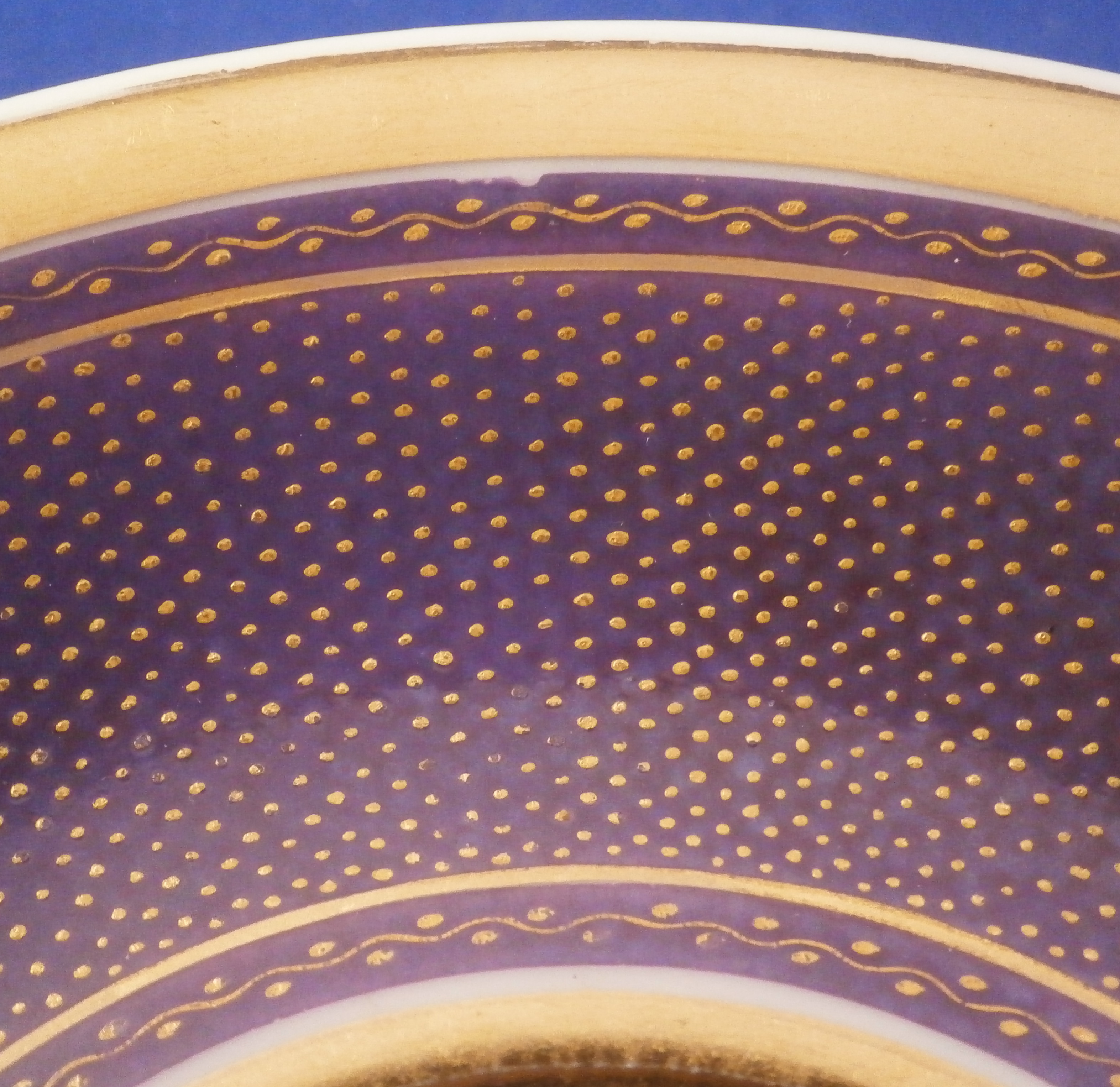 This is a really nice cup and saucer made by one of the Paris makers around 1800. One of the nicest floral cups I have seen by them and probably done by one of the top makers liek Dagoty or Nast . The cup has a nice shape to it and is hand painted with a nice floral arrangement to the front with the area around the flowers gilded with a vermicelli tooled type ground and a gold frame with a tooled design around that. The rest of the piece has a purple ground with tiny gold dots throughout and a gold trim to the edge. Even the inside of the cup is msotly gilded with a design aroun the top. Superb handle shappe with a gold and white design to it and a fullt gilded foot. The saucer has the same purple and gold design to it. They look really stunning and with all that fine detail work it must ahve taken ages to complete them. Definitely worth the effort! The set is in perfect condition with just some wear to the well edge of the saucer! There are two discolored lines to the underside rim of the saucer. Not sure what these are from but they are not hairlines or other damage! The set is unmarked which is common for Paris makers around that time. I always wonder why they did not take more pride in their work and mark these top pieces!? The cup is 4.125 inches tall (including the handle) and 3.125 inches in diameter. The saucer is 1.375 inches tall and 5.5 inches in diameter. Please email me for more information or other pictures.