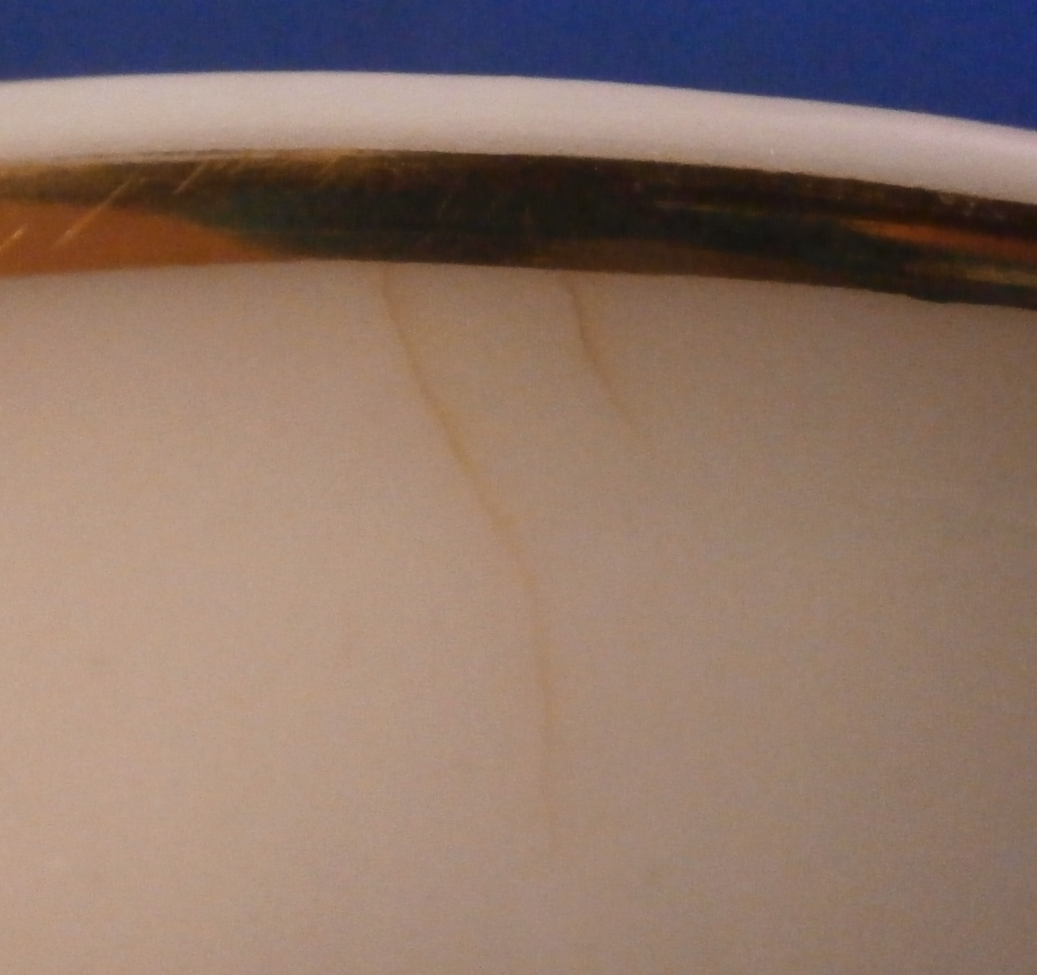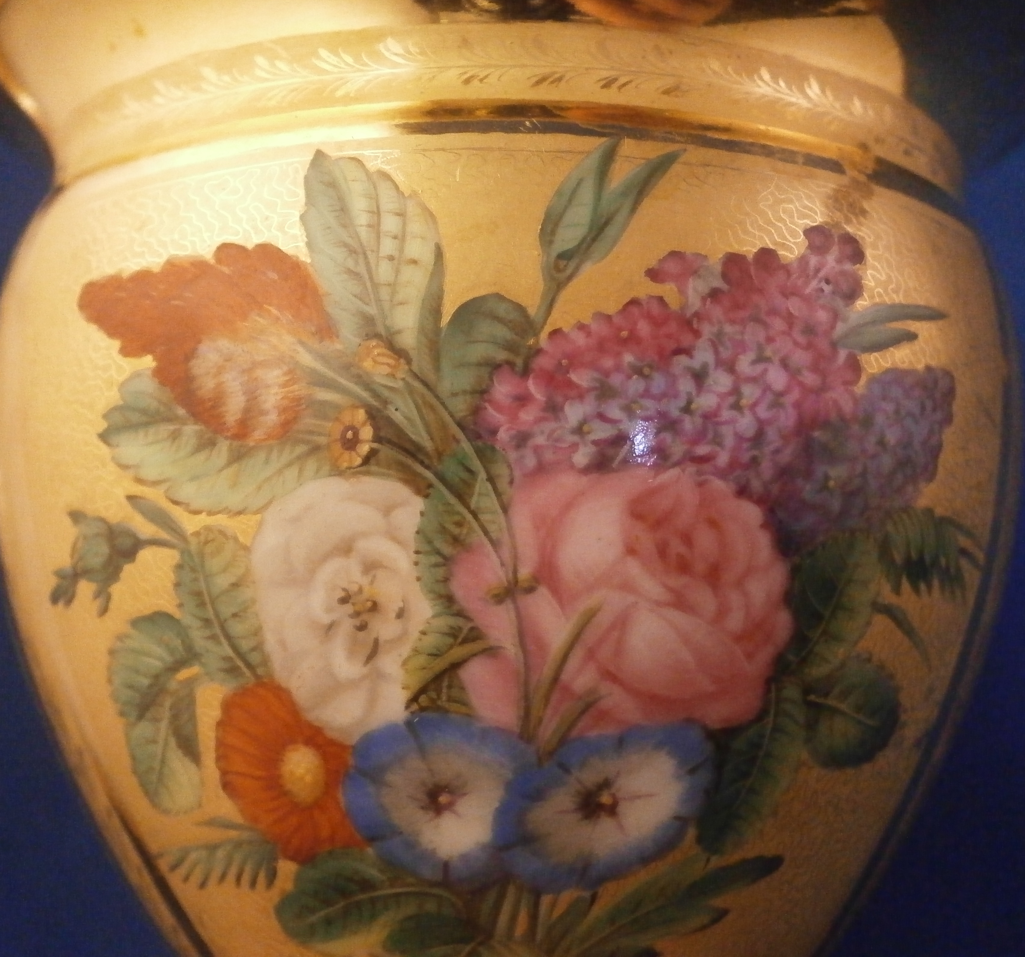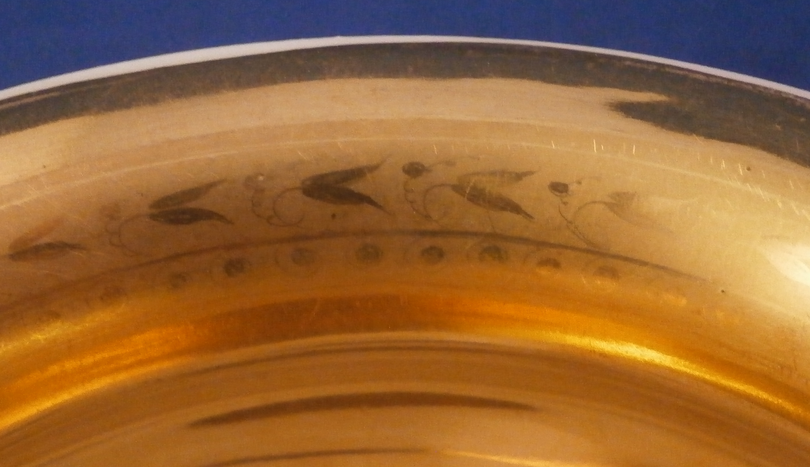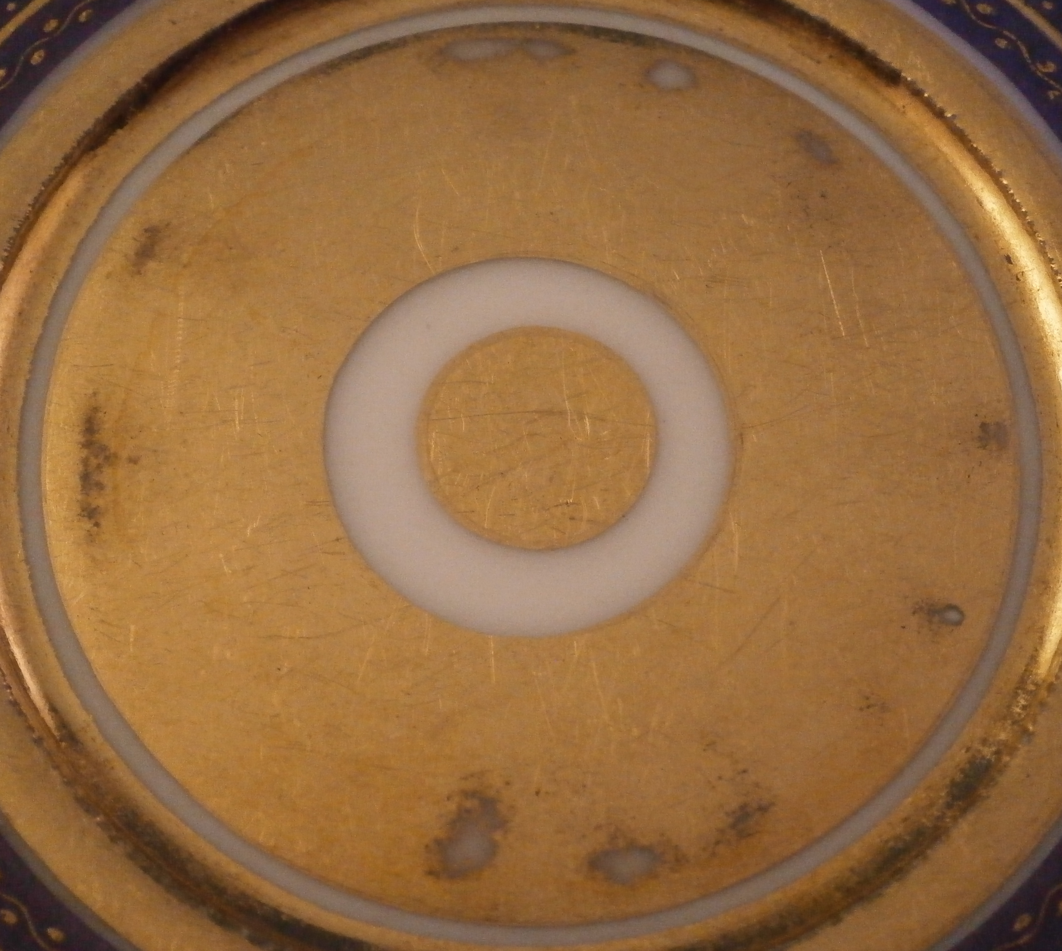This is a really nice cup and saucer made by one of the Paris makers around 1800. One of the nicest floral cups I have seen by them and probably done by one of the top makers liek Dagoty or Nast . The cup has a nice shape to it and is hand painted with a nice floral arrangement to the front with the area around the flowers gilded with a vermicelli tooled type ground and a gold frame with a tooled design around that. The rest of the piece has a purple ground with tiny gold dots throughout and a gold trim to the edge. Even the inside of the cup is msotly gilded with a design aroun the top. Superb handle shappe with a gold and white design to it and a fullt gilded foot. The saucer has the same purple and gold design to it. They look really stunning and with all that fine detail work it must ahve taken ages to complete them. Definitely worth the effort! The set is in perfect condition with just some wear to the well edge of the saucer! There are two discolored lines to the underside rim of the saucer. Not sure what these are from but they are not hairlines or other damage! The set is unmarked which is common for Paris makers around that time. I always wonder why they did not take more pride in their work and mark these top pieces!? The cup is 4.125 inches tall (including the handle) and 3.125 inches in diameter. The saucer is 1.375 inches tall and 5.5 inches in diameter. Please email me for more information or other pictures.