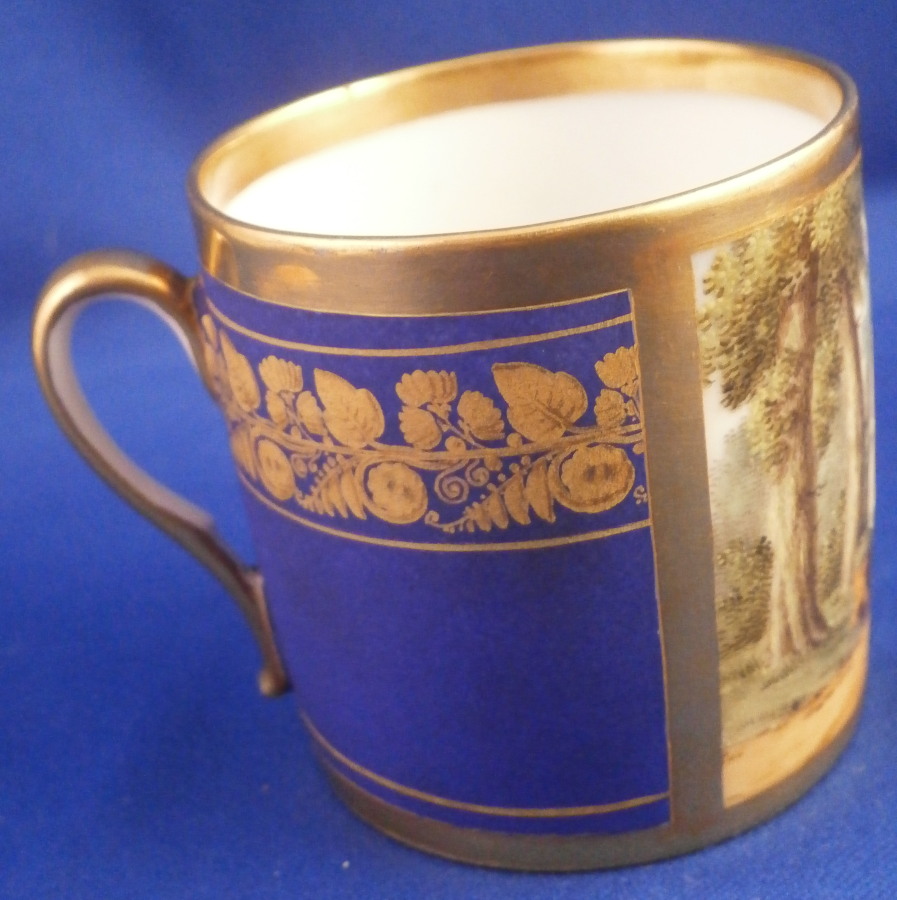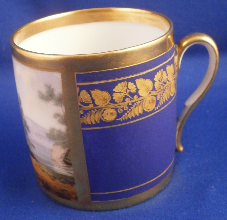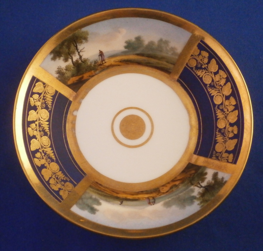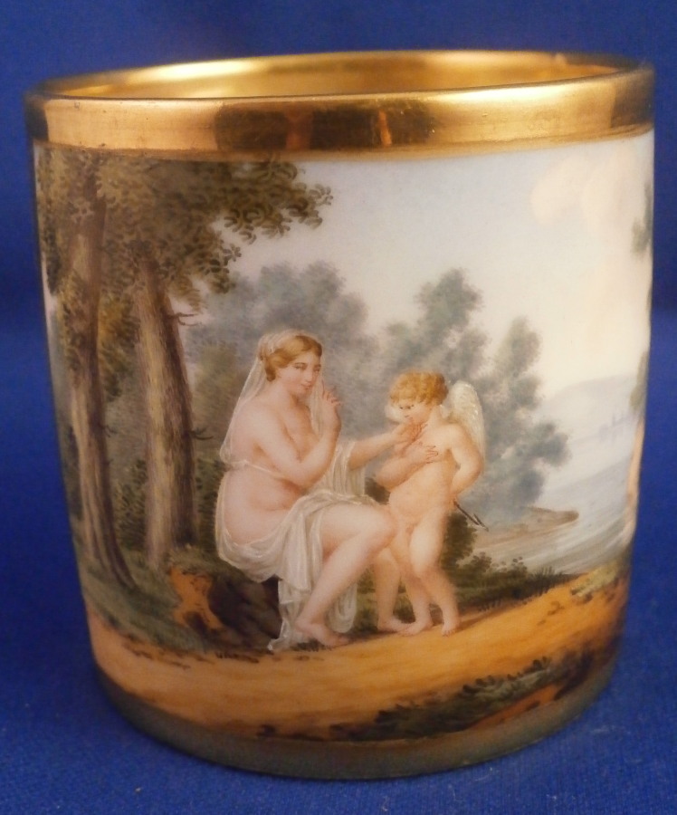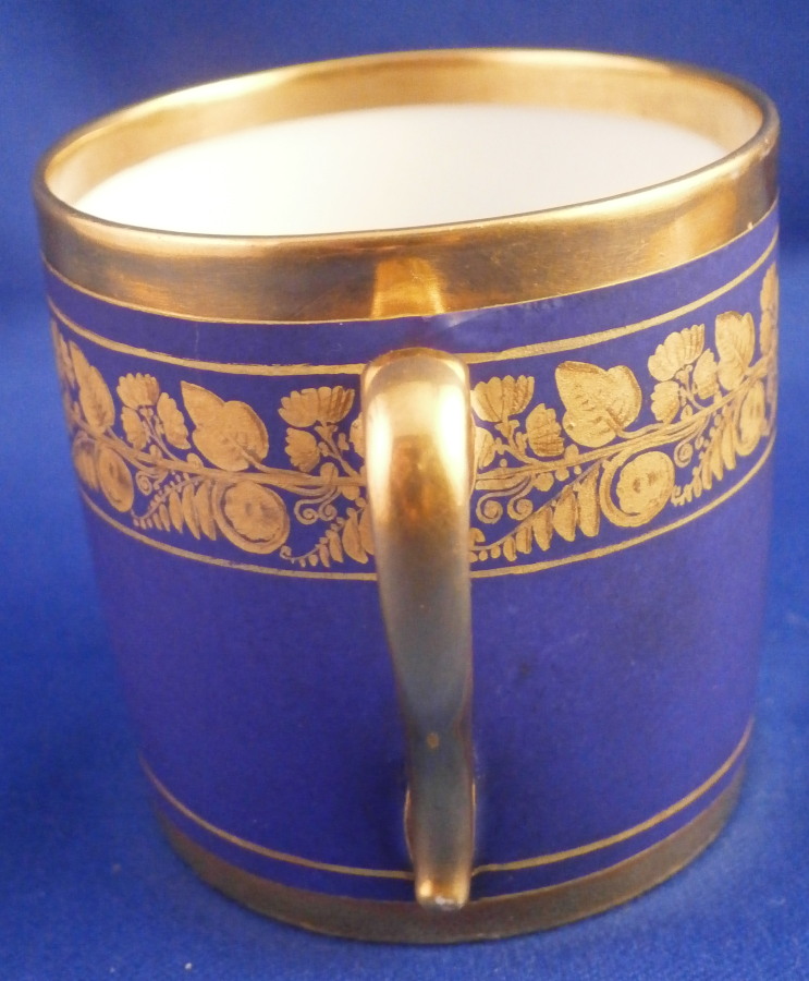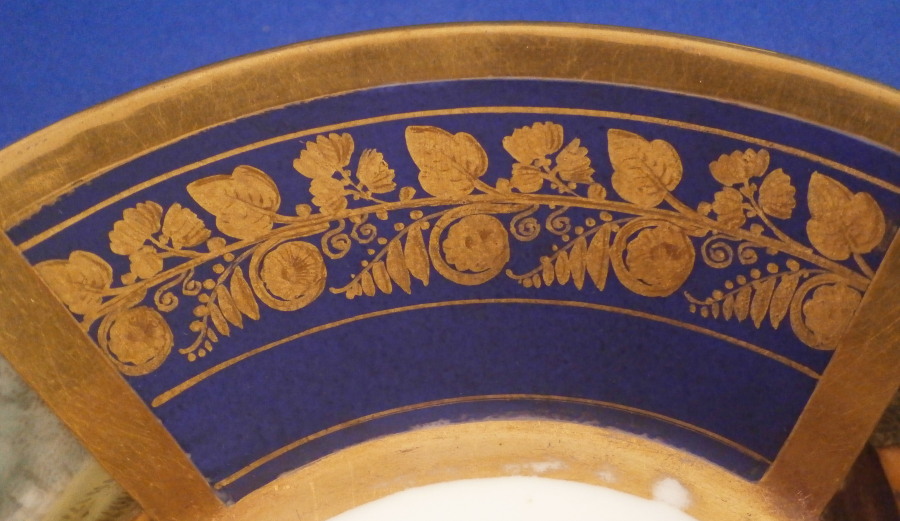 This is a superb cup and saucer made most likely by Dagoty - one of the Paris area makers - or possibly another one of the top factories fo the region around 1800. They were the first to use glazed and unglazed in combination. This cup is uses that stunningly! It has that amazing matte / unglazed blue ground color that is so rare but yet sooo nice, a superb gold trim over that and gold trim around the edges and the well. The saucer has two superb landscape scenes alternating with the blue ground designs and the cup has a large extremely well painted scene to the front of Venus and cupid / Amor in a landscape surrounding. Top quality set! Typically shaped handle to the cup. This set is in great condition with a touch of wear to the gold around the well of the saucer. Neither piece is marked except for the typical incised letters of the region which don't help a whole lot. The cup is 2.375 inches tall and 2.375 inches in diameter. The saucer is 1.125 inches tall and 5.125 inches in diameter. Please email me for more information or other pictures.