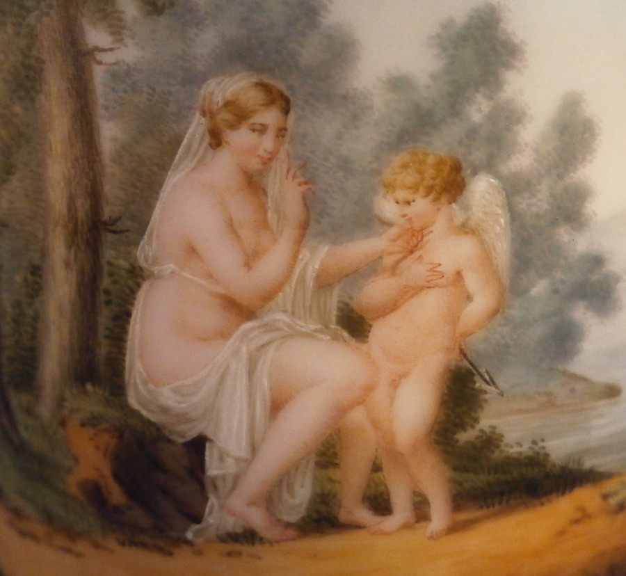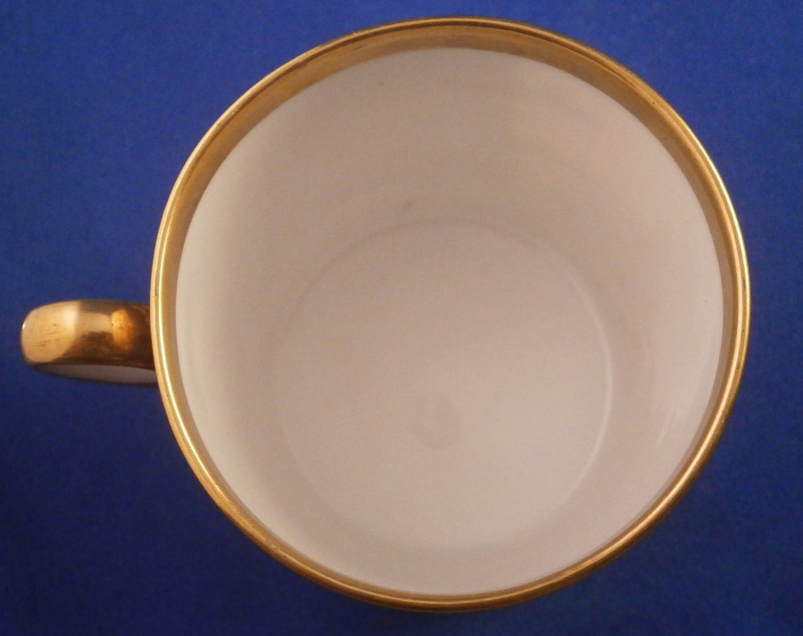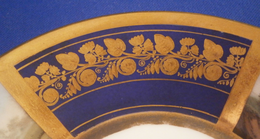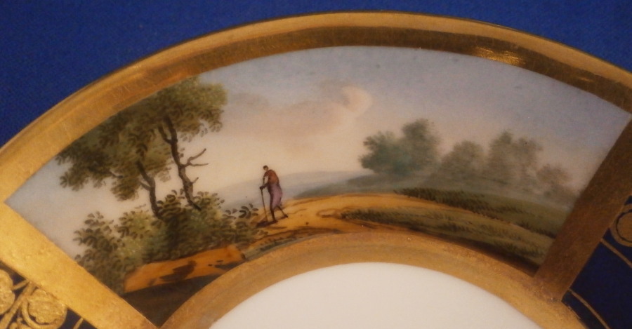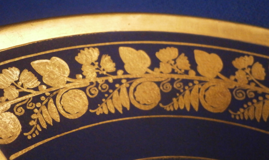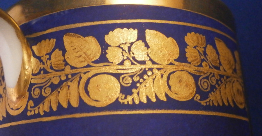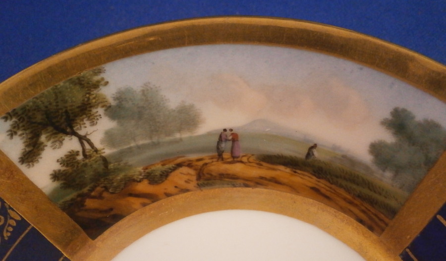 This is a superb cup and saucer made most likely by Dagoty - one of the Paris area makers - or possibly another one of the top factories fo the region around 1800. They were the first to use glazed and unglazed in combination. This cup is uses that stunningly! It has that amazing matte / unglazed blue ground color that is so rare but yet sooo nice, a superb gold trim over that and gold trim around the edges and the well. The saucer has two superb landscape scenes alternating with the blue ground designs and the cup has a large extremely well painted scene to the front of Venus and cupid / Amor in a landscape surrounding. Top quality set! Typically shaped handle to the cup. This set is in great condition with a touch of wear to the gold around the well of the saucer. Neither piece is marked except for the typical incised letters of the region which don't help a whole lot. The cup is 2.375 inches tall and 2.375 inches in diameter. The saucer is 1.125 inches tall and 5.125 inches in diameter. Please email me for more information or other pictures.