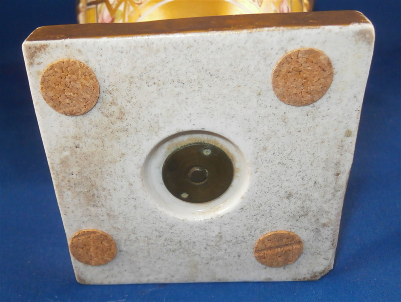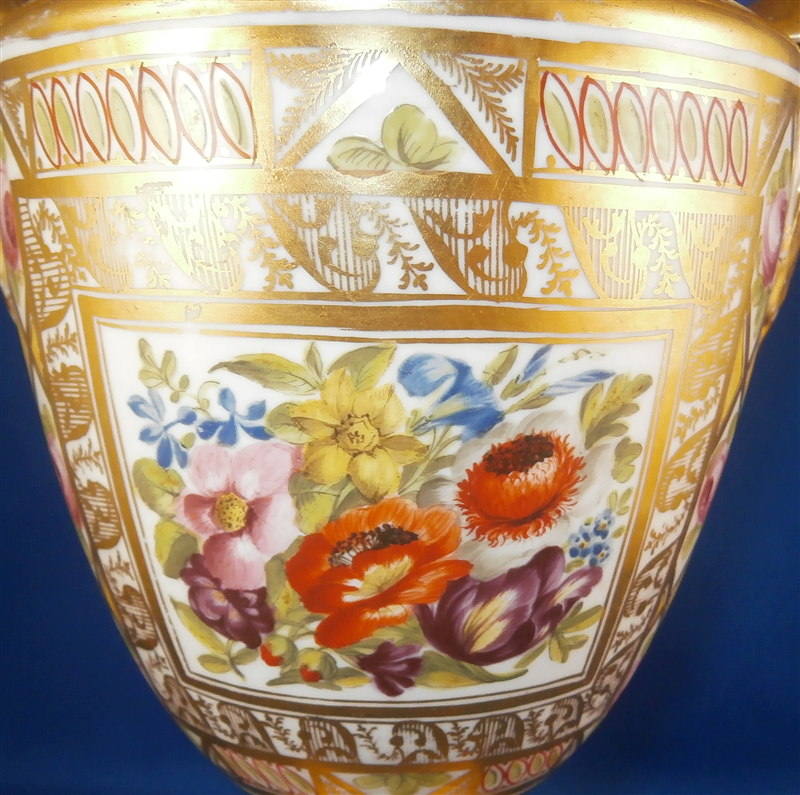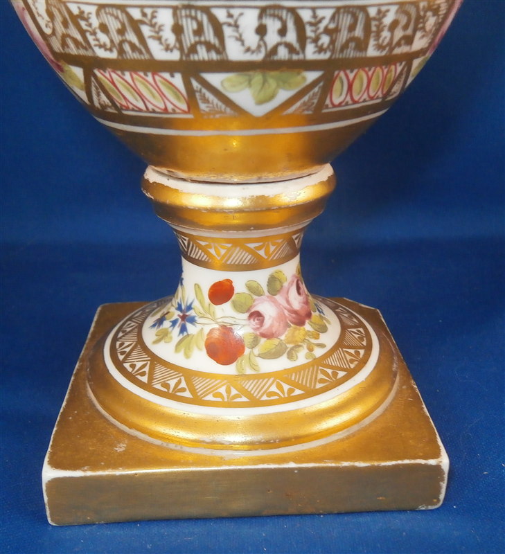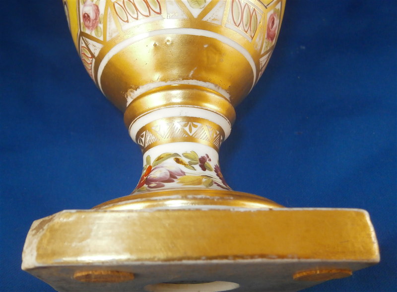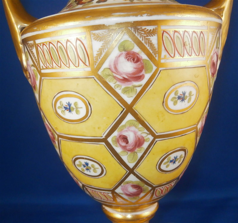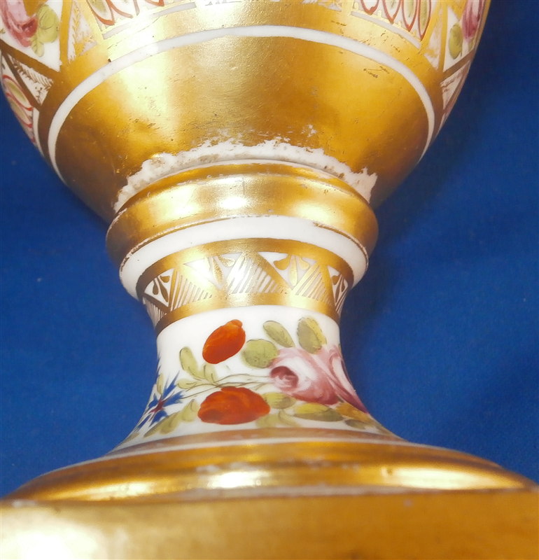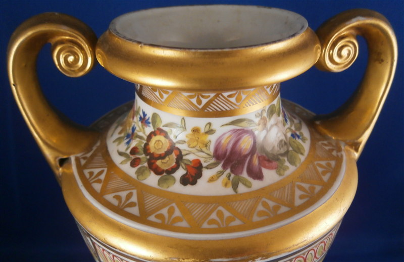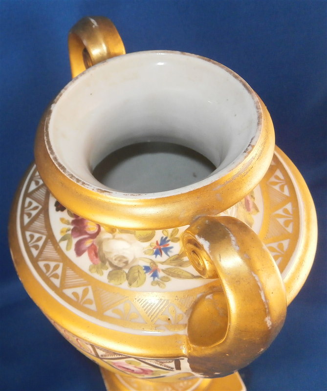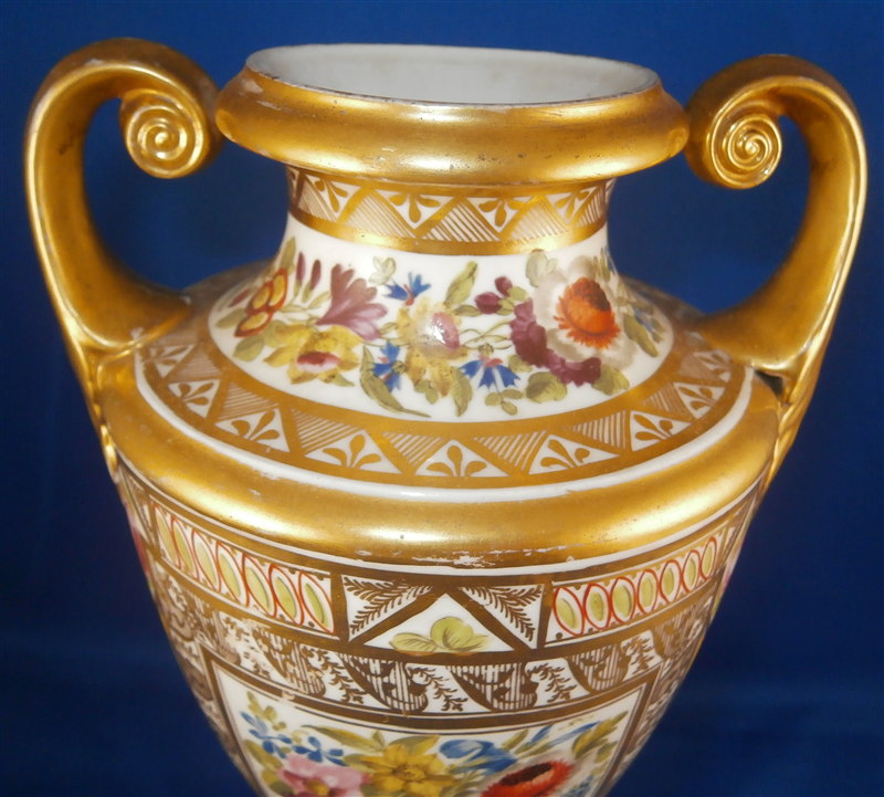 This is a great vase made by Coalport and likely London decorated by Thomas Baxter around 1810. The church gresley pattern is superb with lots of fancy gilding, lots of geometric patterns including yellow ground compartments with blue cornflowers in the center, roses, two floral garlands - one around the top and one around the foot and a great floral arrangement scene in the front center. Nice shape with two scroll handles. A top of the line piece in one of the more fun patterns of this period. The vase is in great condition with some very minor wear to the gilding in a few spots but nothing that distracts and a chip to a corner of the base. The piece is about 9 inches tall, 5.5 inches wide and 4.5 inches deep. Not marked but that is pretty normal! The same vase except converted to a lamp is available on Ruby Lane by another seller if you'd like a pair :) Please email me for more information or other pictures.