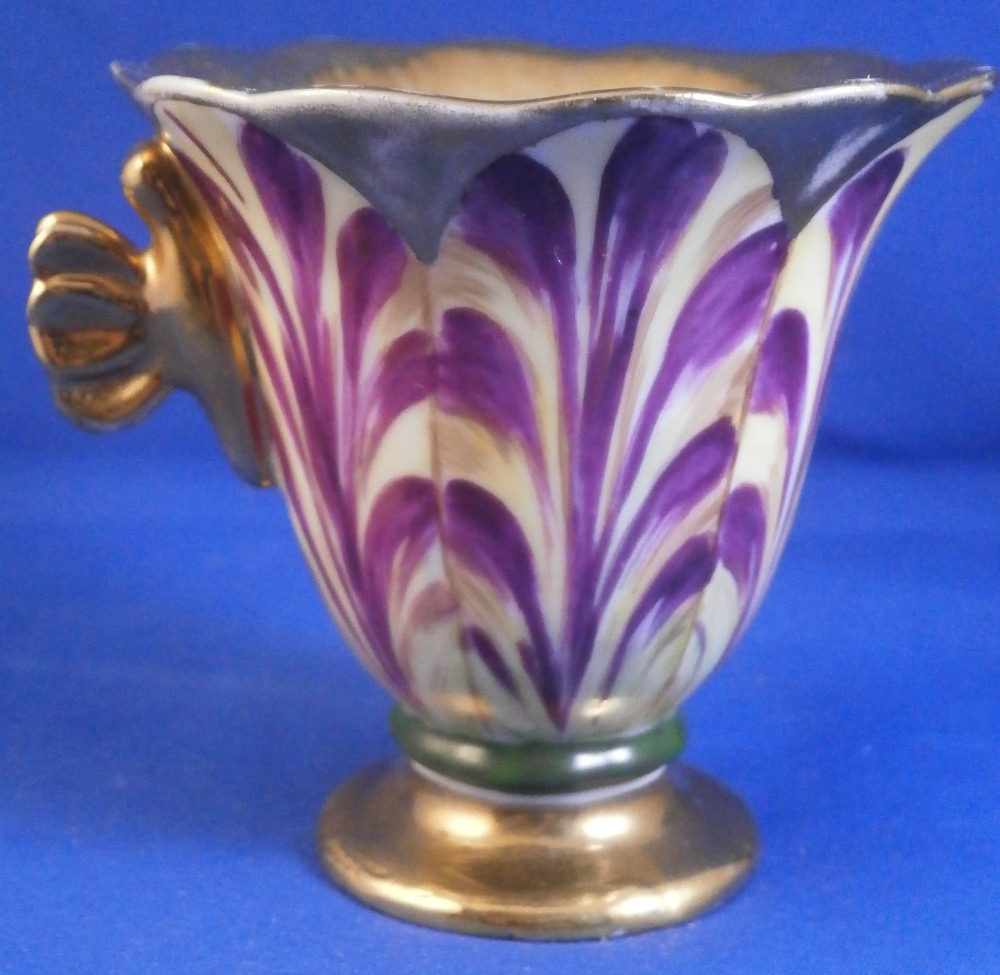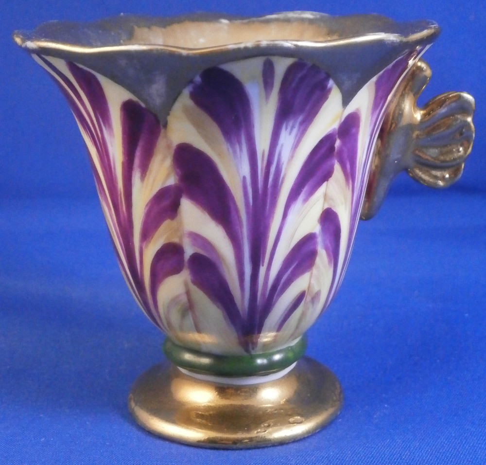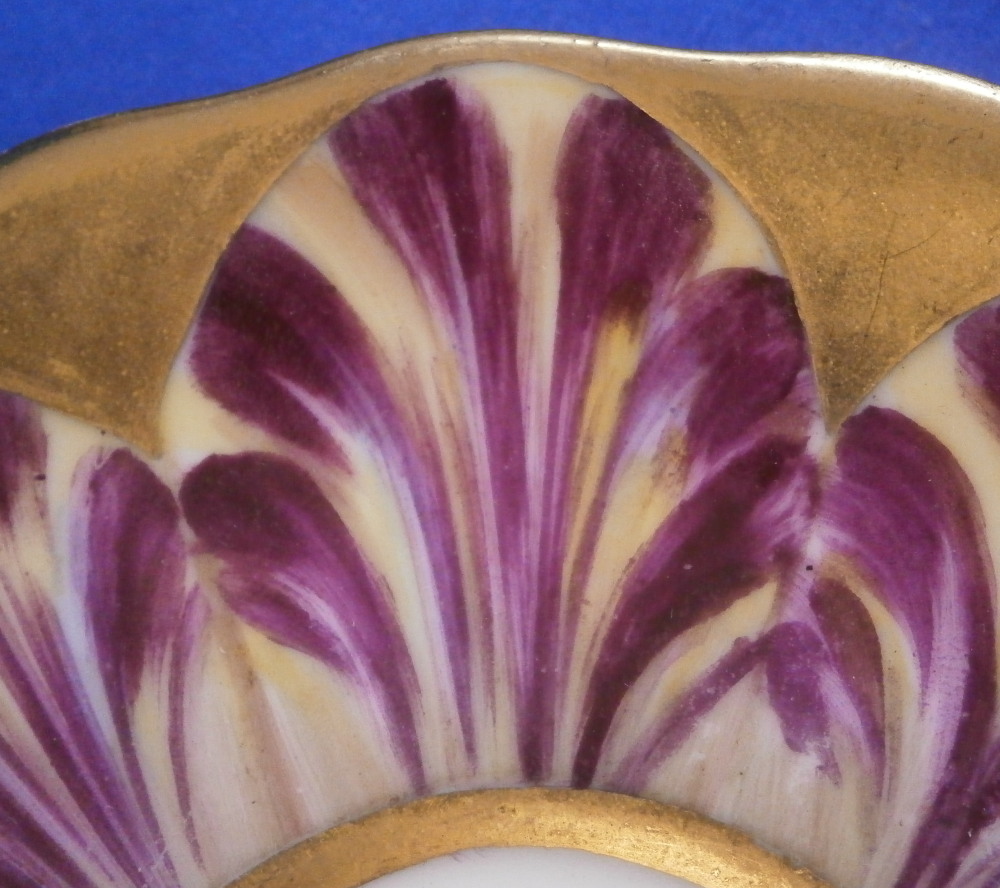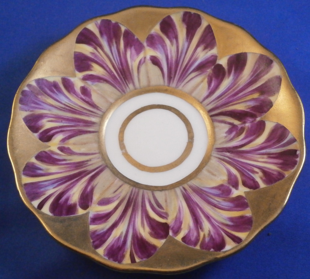 This is a superb cup and saucer made most likely by one of the better Paris region makers in the early 19th century. I know his design was made by Flamen-Fleury (1816-1828) as well as Spode but I am not sure if others made it as well. Supposedly made for custard though that seems a bit odd as these usually did not have saucers. Either ay a really cool looking cup and saucer. Nice hand painted tulip flower petal design all around with gilding filling in the rest of the space and a gold butterfly as the handle. Inside of the cup is fully gilded as well. A truly magnificent set! It is in good condition with some wear though not bad at all. There is a small chip to the bottom edge of the cup as shown. Not obvious at all when on display as it is mainly to the underside. Now for the odd part - both underside except the rim of the saucer are unglazed. Never seen that before. There are remnants of something blue under the saucer but dowubt it is a remnant of any sort of mark. Definitely not a Spode example judging by the paste. The cup is 3 inches tall and 3 inches in diameter. The saucer is 0.875 inch tall and 5.125 inches in diameter. Please email me for more information or other pictures.