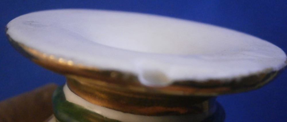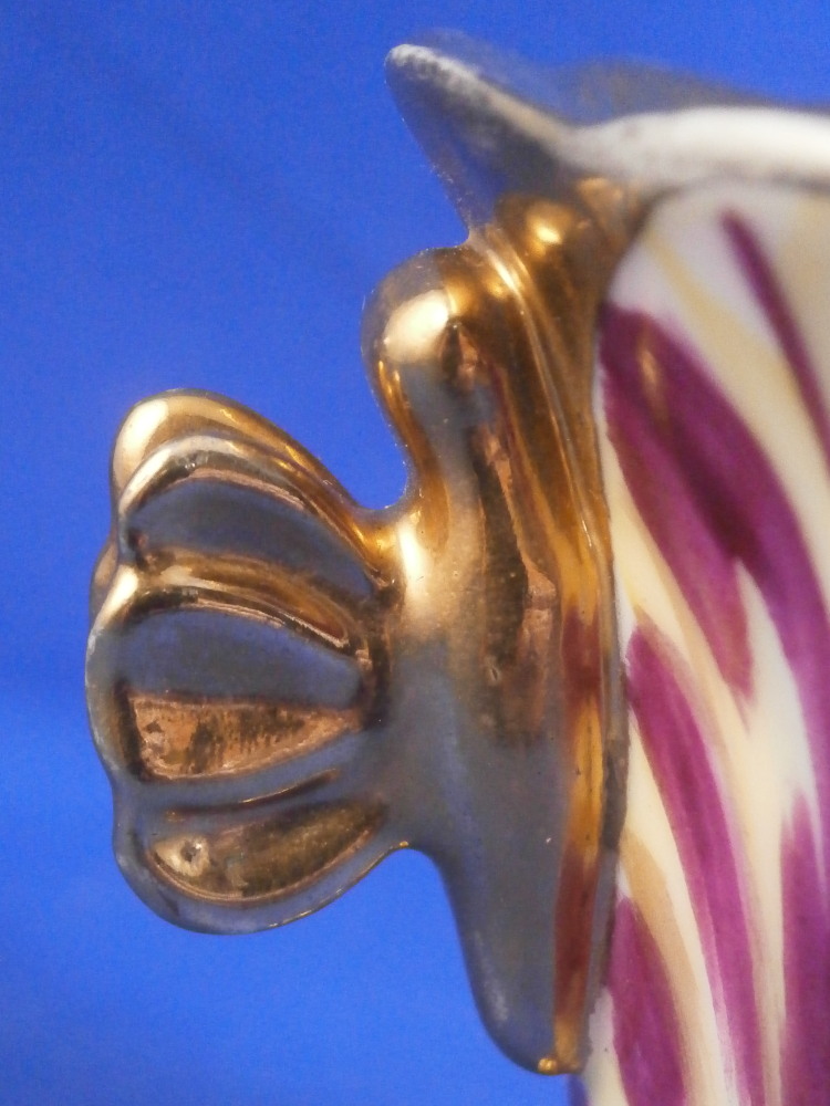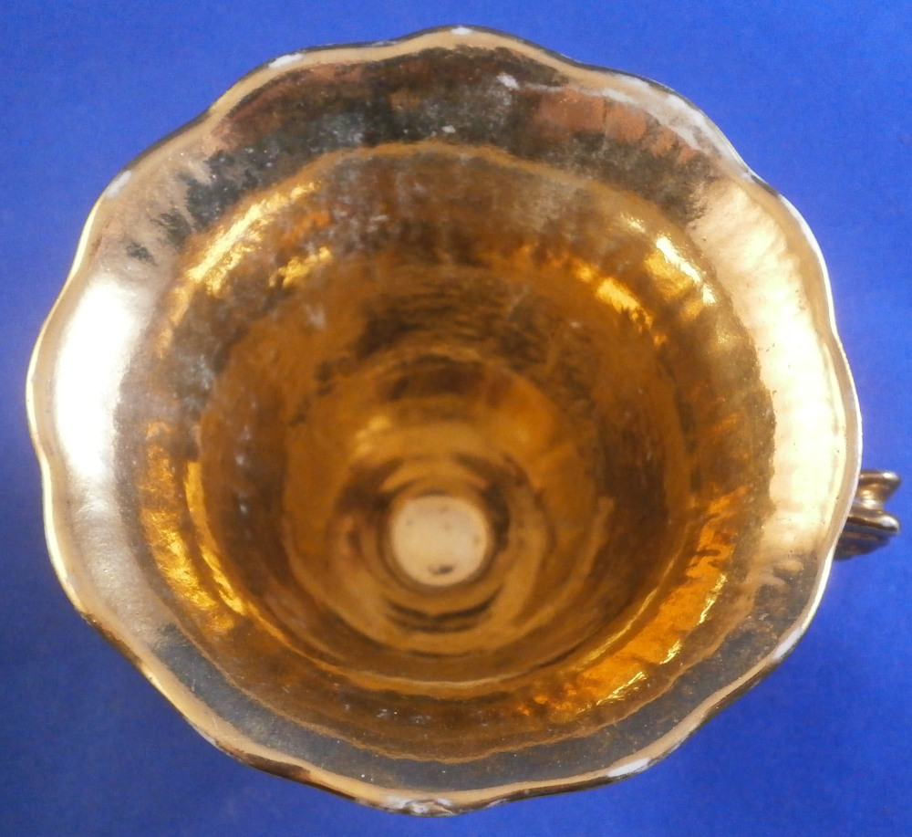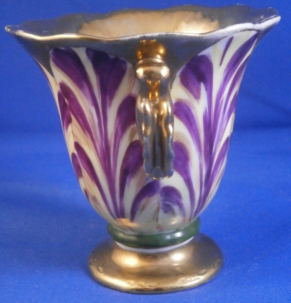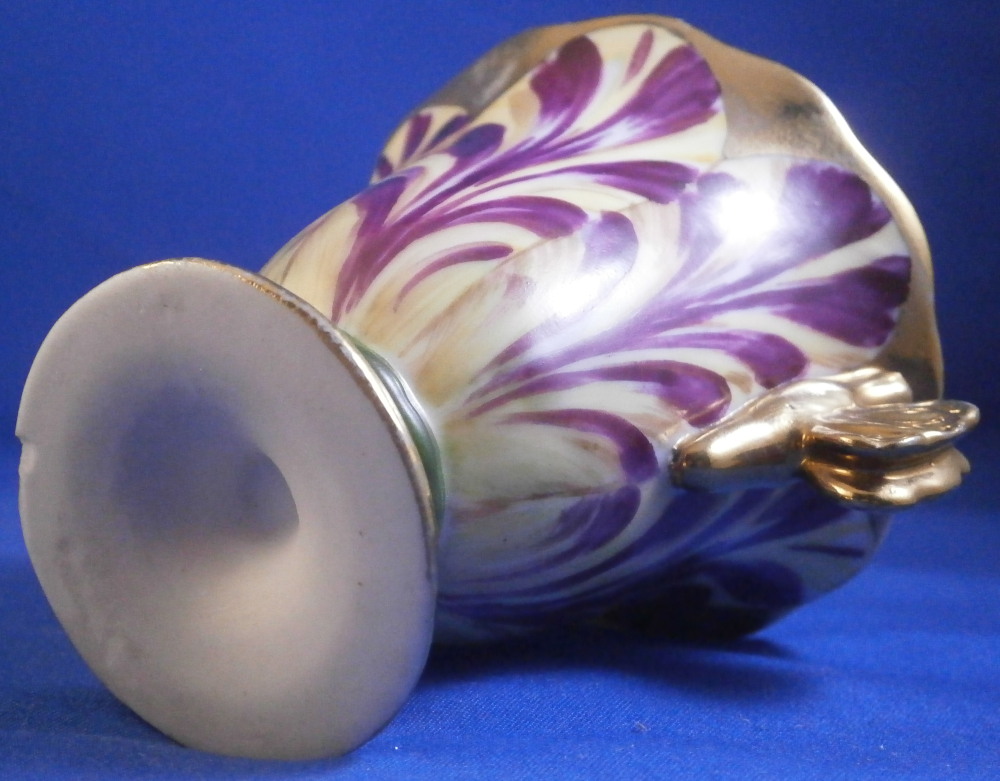This is a superb cup and saucer made most likely by one of the better Paris region makers in the early 19th century. I know his design was made by Flamen-Fleury (1816-1828) as well as Spode but I am not sure if others made it as well. Supposedly made for custard though that seems a bit odd as these usually did not have saucers. Either ay a really cool looking cup and saucer. Nice hand painted tulip flower petal design all around with gilding filling in the rest of the space and a gold butterfly as the handle. Inside of the cup is fully gilded as well. A truly magnificent set! It is in good condition with some wear though not bad at all. There is a small chip to the bottom edge of the cup as shown. Not obvious at all when on display as it is mainly to the underside. Now for the odd part - both underside except the rim of the saucer are unglazed. Never seen that before. There are remnants of something blue under the saucer but dowubt it is a remnant of any sort of mark. Definitely not a Spode example judging by the paste. The cup is 3 inches tall and 3 inches in diameter. The saucer is 0.875 inch tall and 5.125 inches in diameter. Please email me for more information or other pictures.