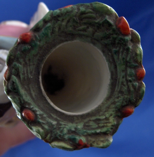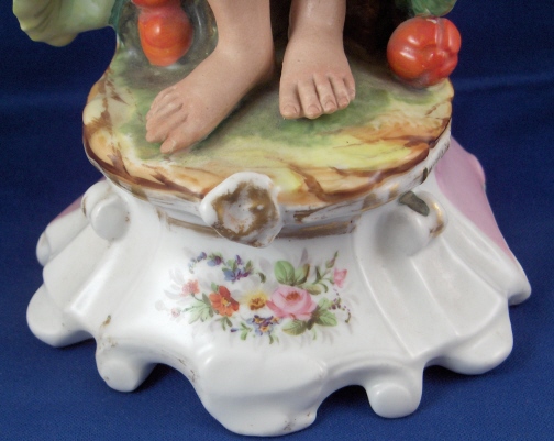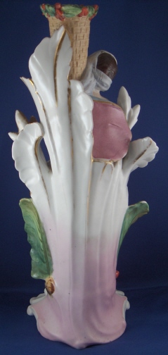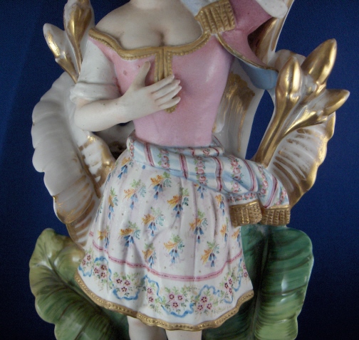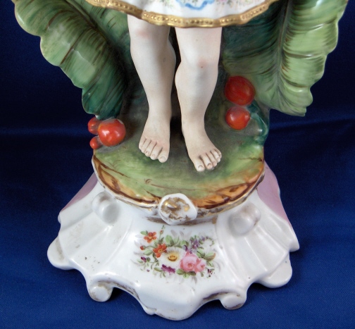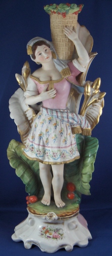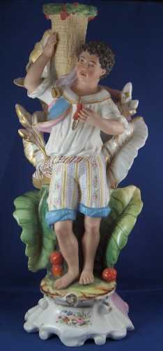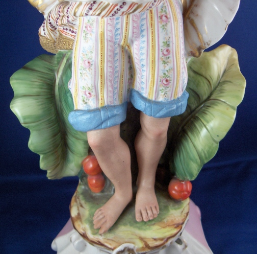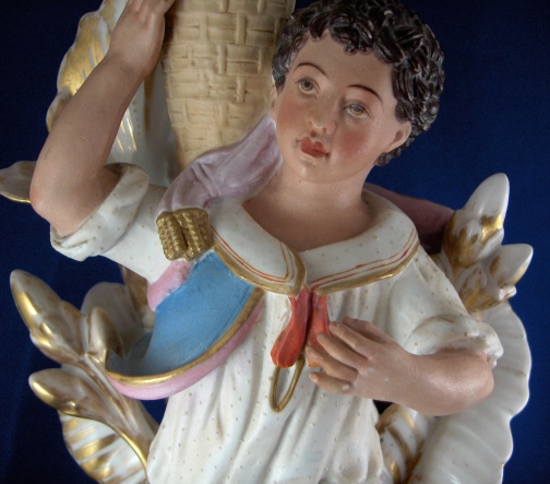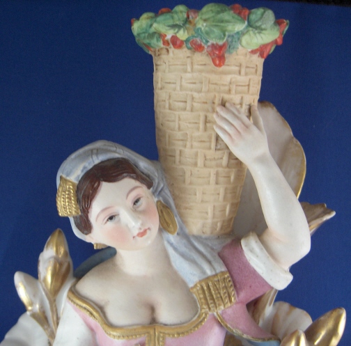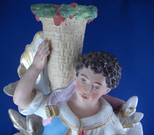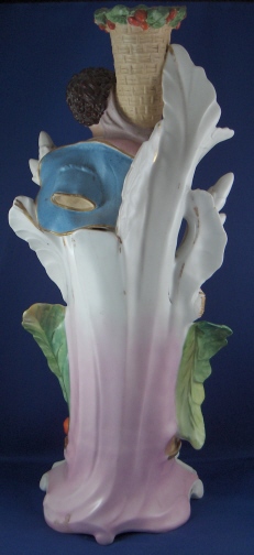 This is a rare pair of figural candlesticks made by one of the Paris makers in about 1850. It is quite rare to find a pair of this quality and condition. This pair is a bit 'newer' than the other one I have on the site. Here we have a male version who is wearing a colorful warm weather outfit and is standing in front of some tropical looking plants with the basket on his right should being the candlestick and a female version which is equally nice and standing in front of the same foliage. Both are very well modeled and painted and of very good quality. They also have some typical Paris style flowers on the front of the base and are in surprisingly good condition. Just some wear to the gilding which is normal since French gilding wears quite easily. He has one teeny rough spot on a leaf but you need to feel for it to find it. The figurines are not marked underneath except for two incised parallel lines underneath the base of the female piece but that is quite normal for the Paris makers. They are 14.75 inches tall, 6 inches wide and 5.75 inches deep so quite large! Please email me for more information or other pictures.