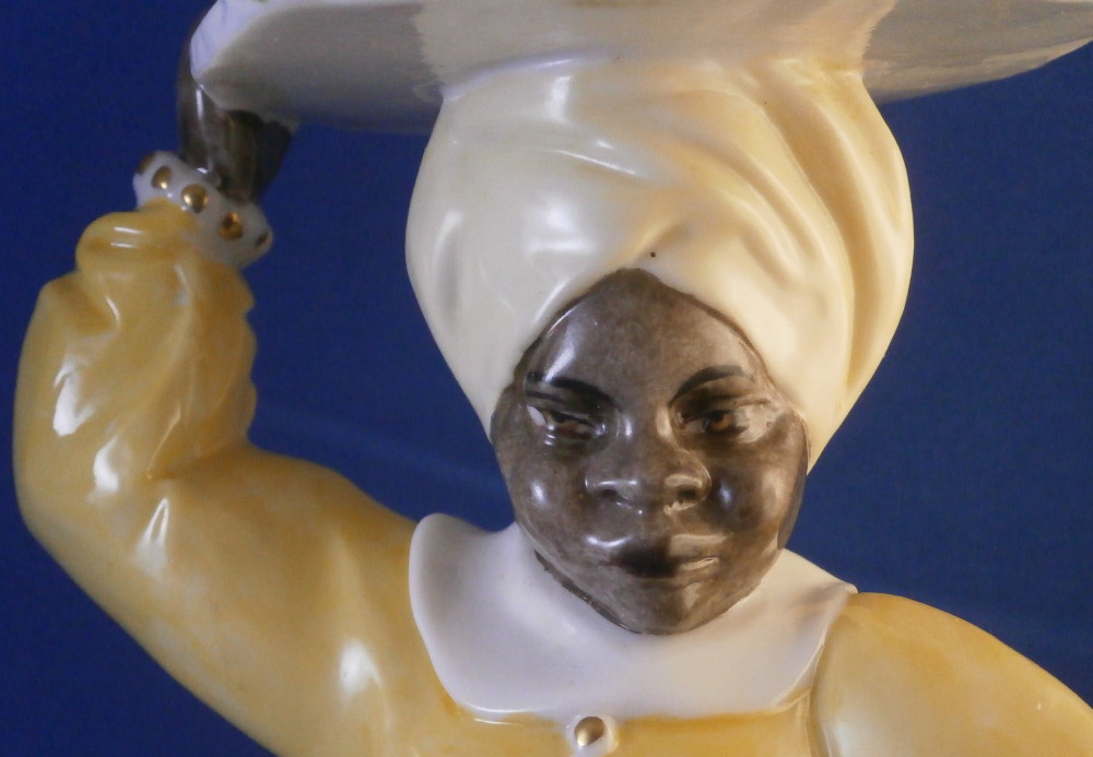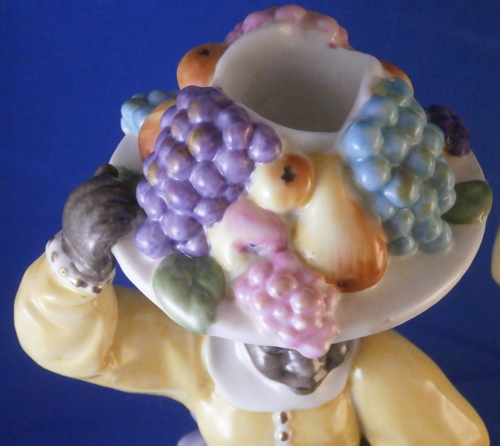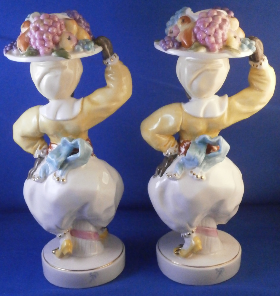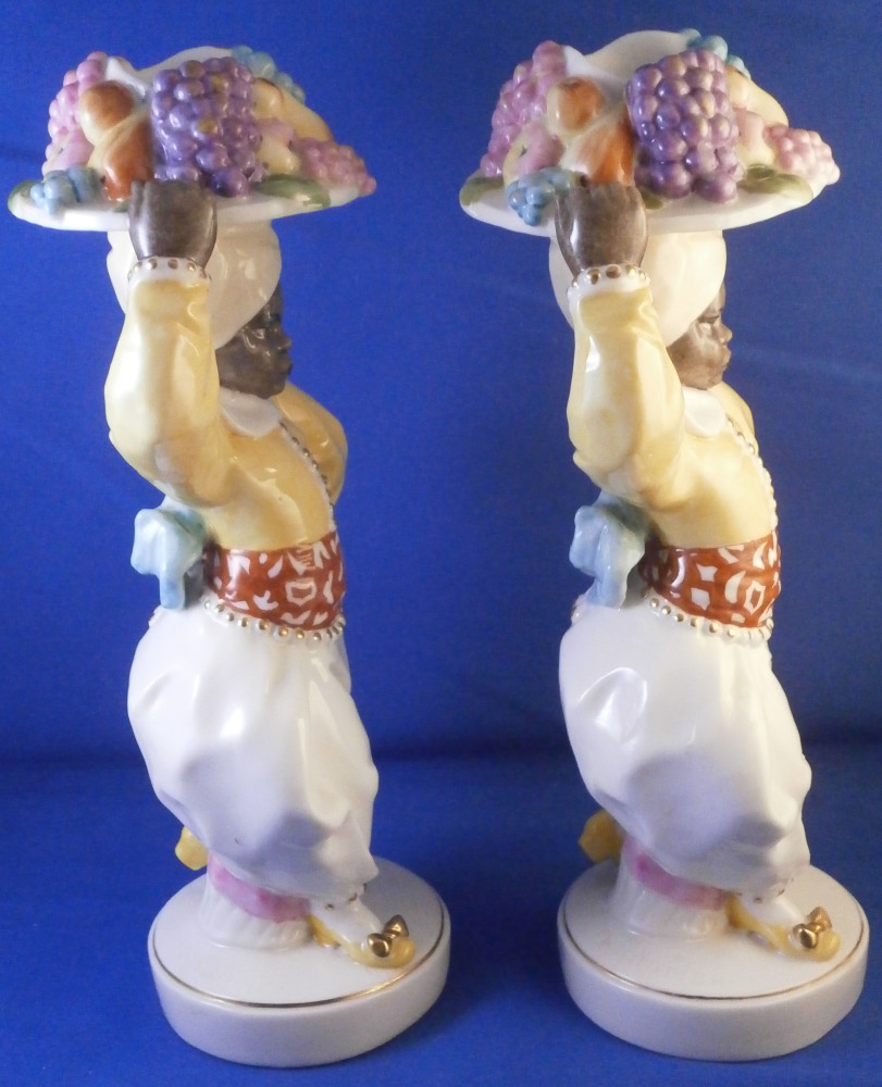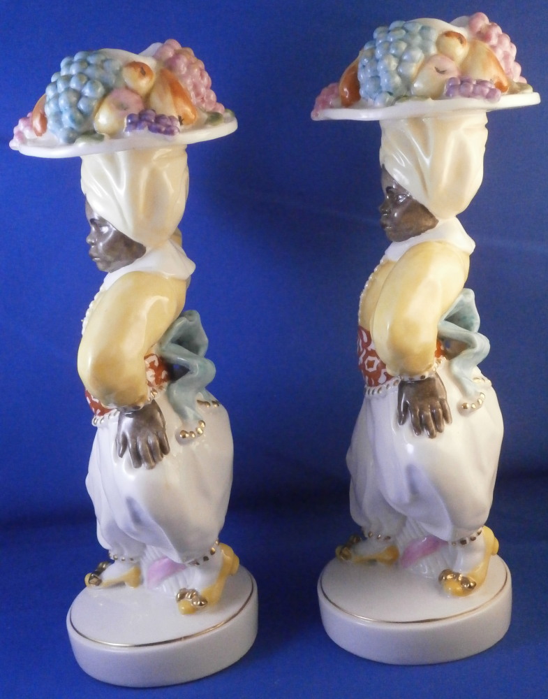 This is a rare pair of figural candlesticks made by Passau in the early 20th century. One does not see their pieces from this period very often and they did some really fun work during the Art Nouveau period as can be seen here. Quite similar to the work of the Schwarzburger Werkstaetten fuer Porzellankunst I think. Each candlestick is in the form of a blackamoor wearing wide flowy pants and a colorful top while acrrying a basket of fruit on top of their heads with the center having the hole to hold the candle! They are nicely modeled, superbly hand painted and of a ncie quality! Not so politically correct but they are from a different time. Both are marked with the double P and blue staff mark to the back and have the artist name impressed as shown - O. Kramer for Otto Kramer. He also worked for the Schwarzburg workshop so it explains the similarity in style. They are also marked with the model number P113, the number 9 and Germany in blue script as shown. Each piece is about 9 inches tall, 3.75 inches wide and 3 inches deep. They are perfect condition and look stunning! Please email me for more information or photos.