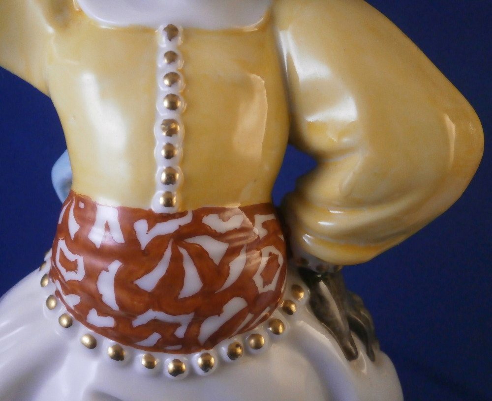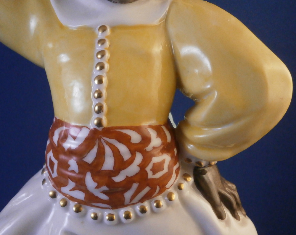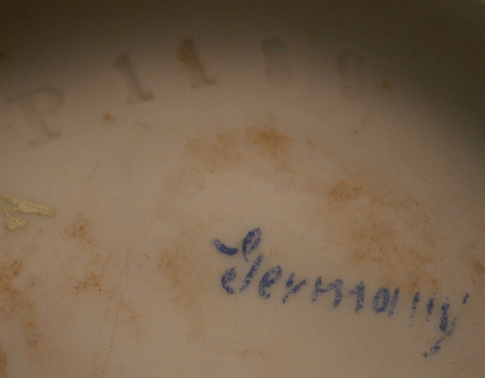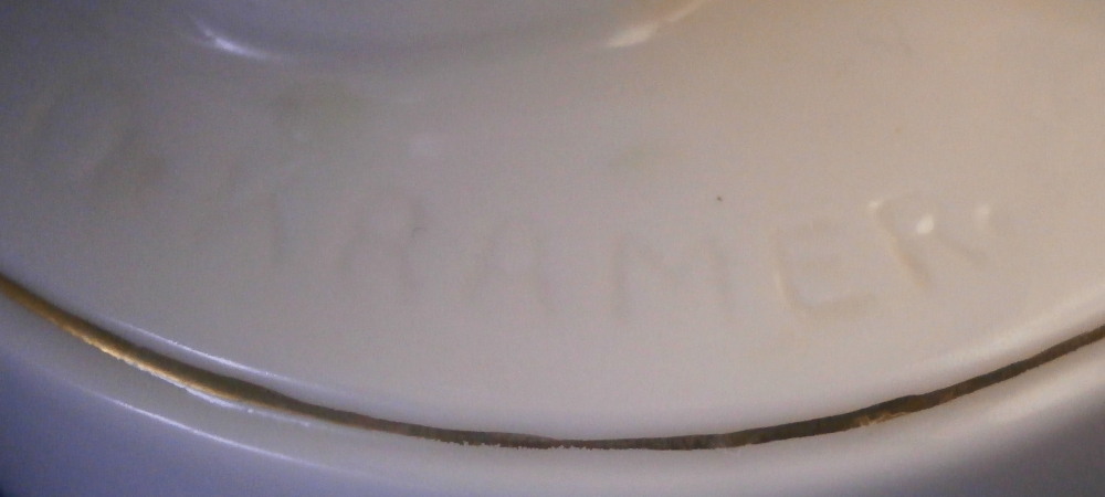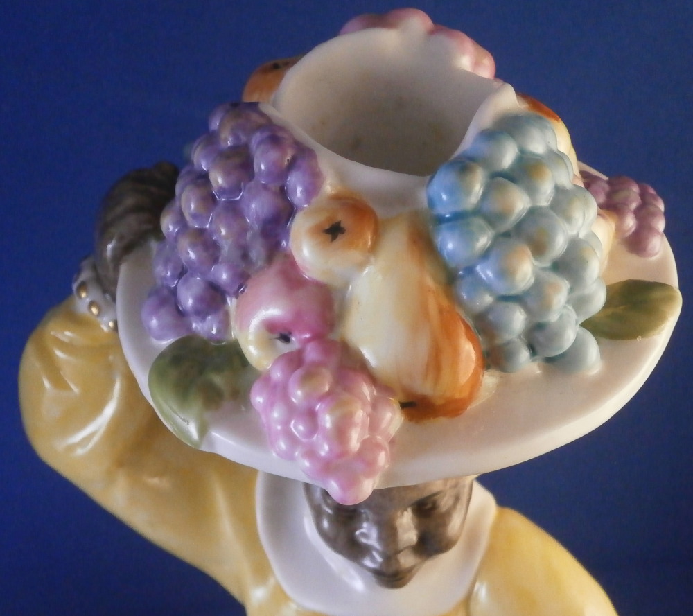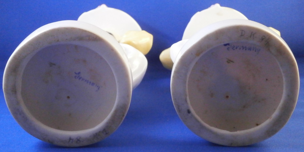 This is a rare pair of figural candlesticks made by Passau in the early 20th century. One does not see their pieces from this period very often and they did some really fun work during the Art Nouveau period as can be seen here. Quite similar to the work of the Schwarzburger Werkstaetten fuer Porzellankunst I think. Each candlestick is in the form of a blackamoor wearing wide flowy pants and a colorful top while acrrying a basket of fruit on top of their heads with the center having the hole to hold the candle! They are nicely modeled, superbly hand painted and of a ncie quality! Not so politically correct but they are from a different time. Both are marked with the double P and blue staff mark to the back and have the artist name impressed as shown - O. Kramer for Otto Kramer. He also worked for the Schwarzburg workshop so it explains the similarity in style. They are also marked with the model number P113, the number 9 and Germany in blue script as shown. Each piece is about 9 inches tall, 3.75 inches wide and 3 inches deep. They are perfect condition and look stunning! Please email me for more information or photos.