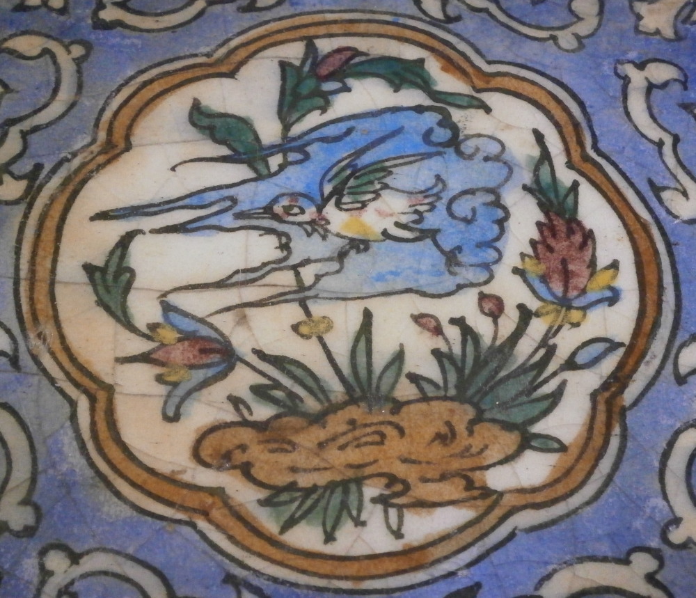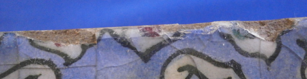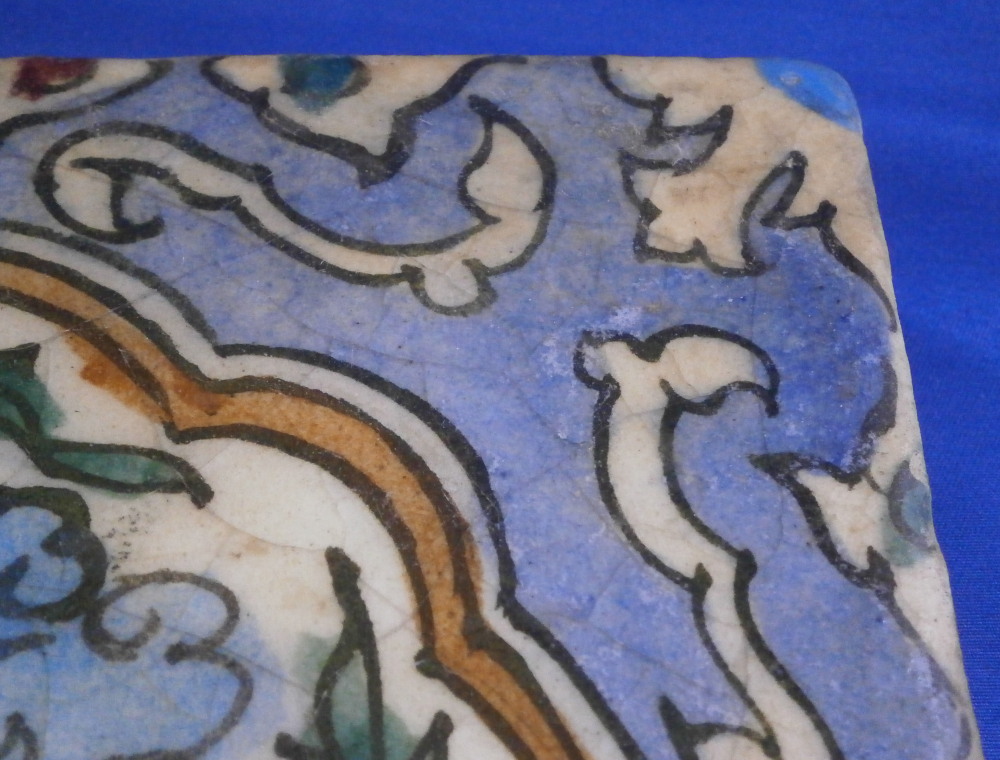 This is really nice square tile / plaque that I have not much of a clue on. It appears to be made of some sort of faience / pottery / ceramic material. I bought it because it looked interesting to me. I tried to do some research but that didn't help too much. I did find similar tiles that some claimed were from the mid 19th century and others as far back as the mid 18th century. All stated Qajar period but that covers a long period of time. I am sure it is a true antique and this one here looks older so maybe mid 19th century but I am not an expert at all. it appears to be Persian and possibly from Iran. The style seems to be Iznik with the design in this case haveing a cartouche in the center of a bird in a landscape surrounding with the edges of the tile having a blue ground with some scrolls to it. It is all hand painted and really quite nice. Like I said - I am not an expert at all on this piece but the quality is really nice and it has some good age to it. The tile is in good condition with some crazing which seems to be normal on these pieces. There are some chips to the left edge as well as flaking to the paint and glaze in one spot of the top edge as shown. The piece is 7.375 inches wide, 7.5 inches tall and 0.75 inches thick. Please email me for more information or other pictures.
