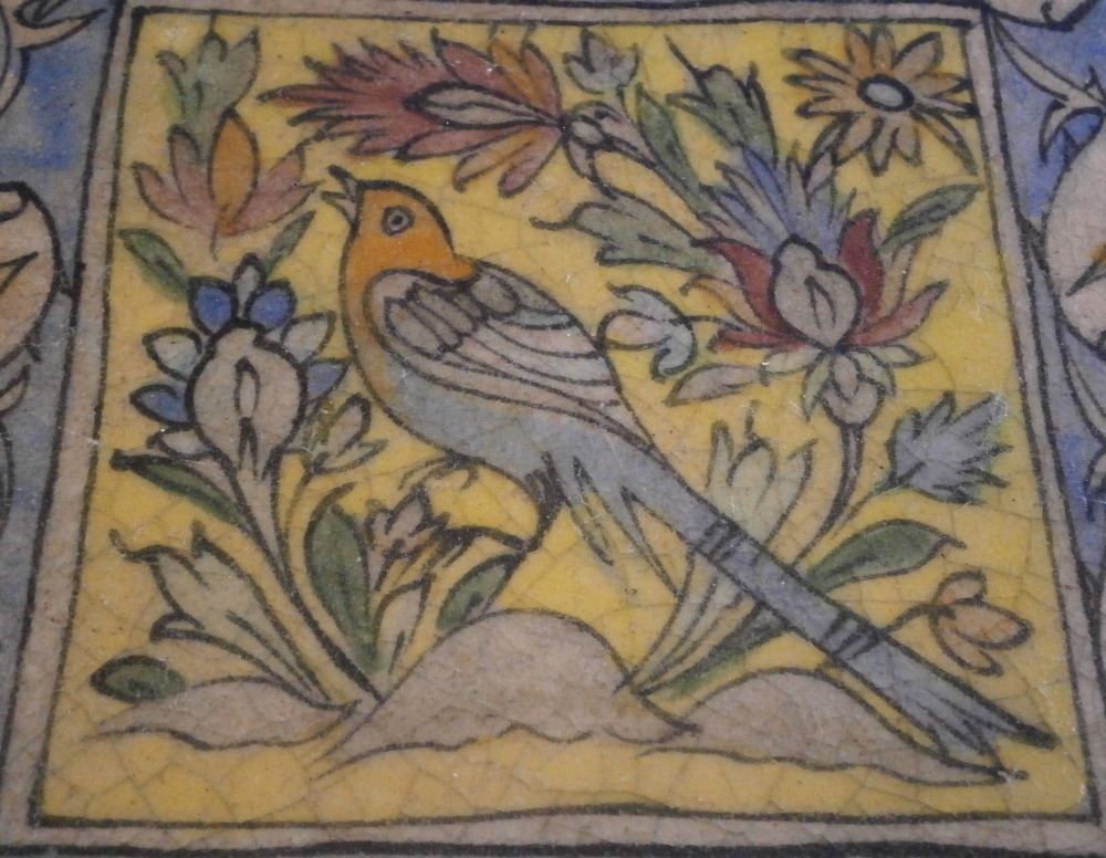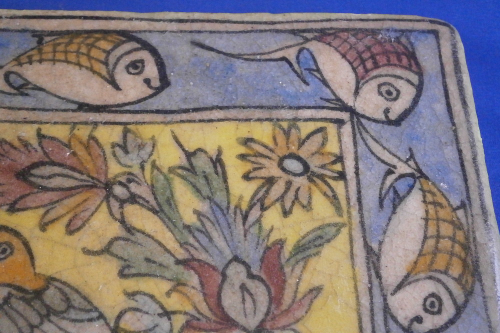 This is really nice square tile / plaque that I have not much of a clue on. It appears to be made of some sort of faience / pottery / ceramic material. I bought it because it looked interesting to me. I tried to do some research but that didn't help too much. I did find similar tiles that some claimed were from the mid 19th century and others as far back as the mid 18th century. All stated Qajar period but that covers a long period of time. I am sure it is a true antique and this one here looks older so maybe mid 19th century but I am not an expert at all. it appears to be Persian and possibly from Iran. The style seems to be Iznik with the design in this case haveing a cartouche in the center of a bird in a flower surrounding with the edges of the tile having a blue ground with some fish all around. It is all hand painted and really quite nice. Like I said - I am not an expert at all on this piece but the quality is really nice and it has some good age to it. The tile is in good condition with some crazing which seems to be normal on these pieces. There is some glaze and paint missing in the bottom right corner but it's not bad and the piece displays beautifully! The piece is 7.375 inches wide, 7.375 inches tall and 0.625 inches thick. Please email me for more information or other pictures.