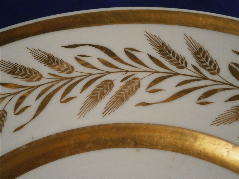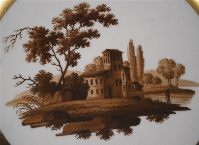 This is a superb scenic plate made by Popov around 1820. Alexander Popoff founded the factory near Moscow in the early 19th century. The products were highly sought after and from 1810 until 1830 they produced the best quality wares. The factory was closed in 1872. The center of the plate has a hand painted monochrome landscape scene in the famous chestnut brown he invented with a nice gold trim including wheat to the rim. The scenes includes a building, a person as well as trees and some water. The plate is in great condition with some very minor wear. The piece is marked underneath with the under glaze Popow AT looking mark as well as an impressed 20 as shown. The plate is 1.375 inches tall and 8.125 inches in diameter. Please email me for more information or other pictures.
