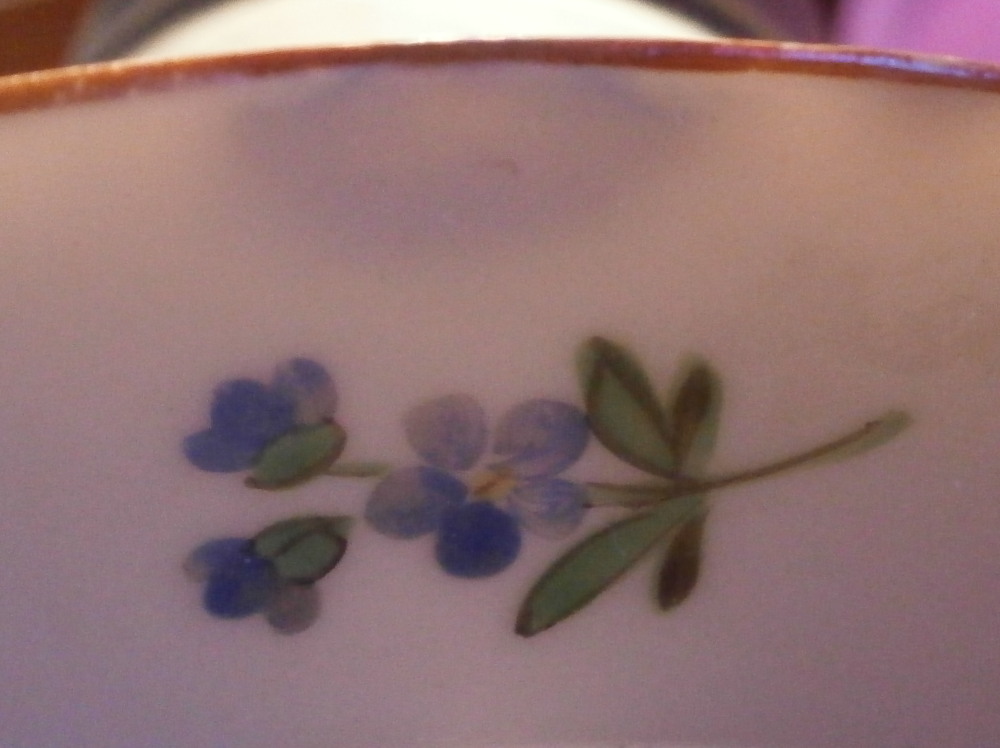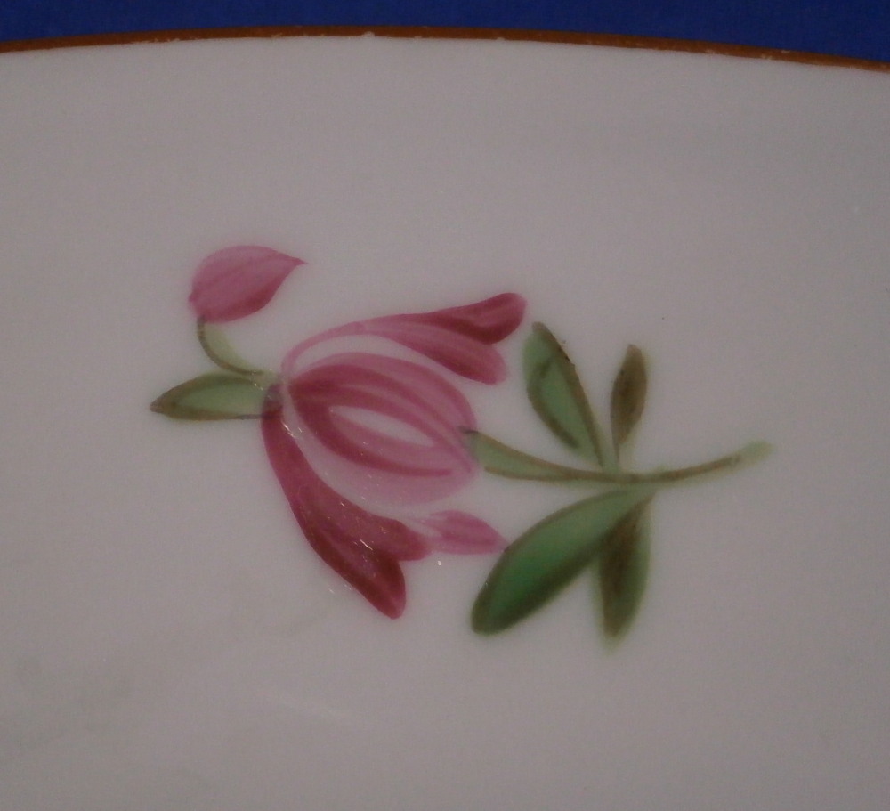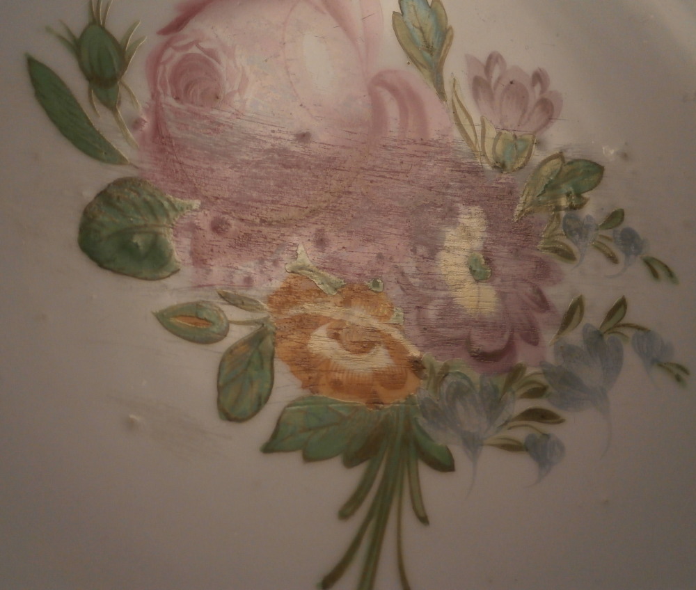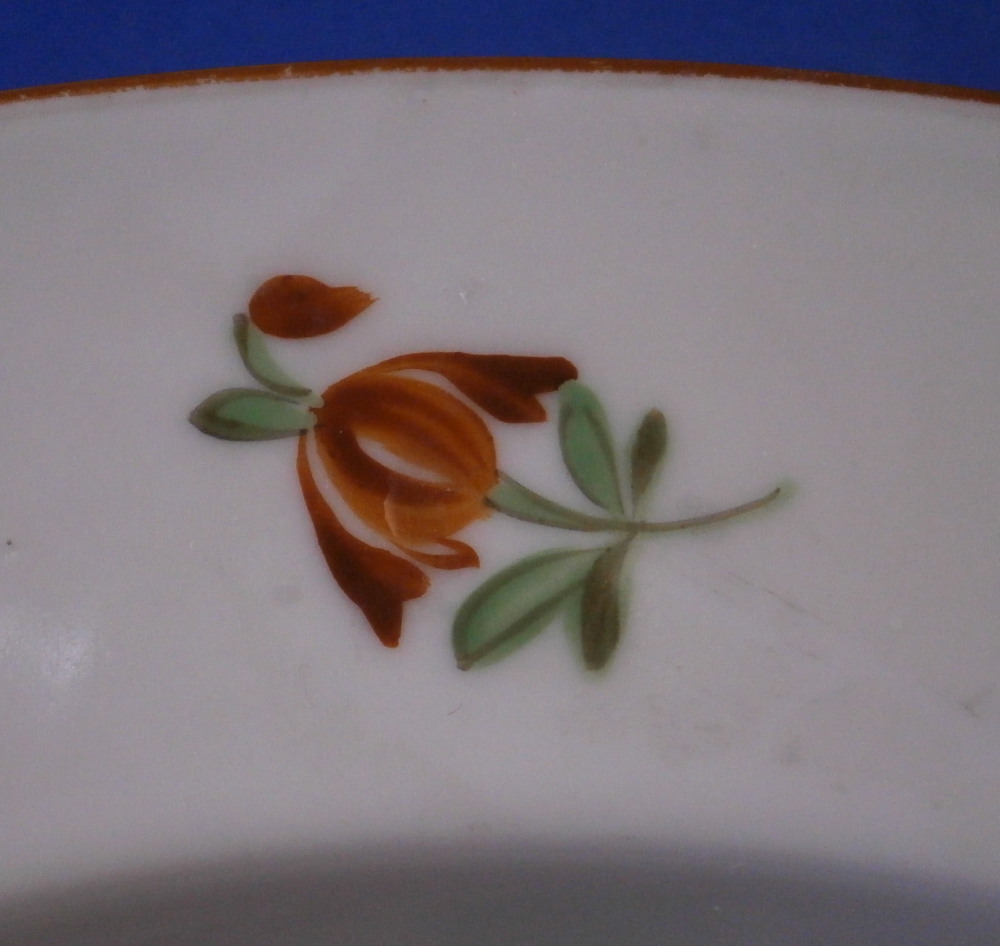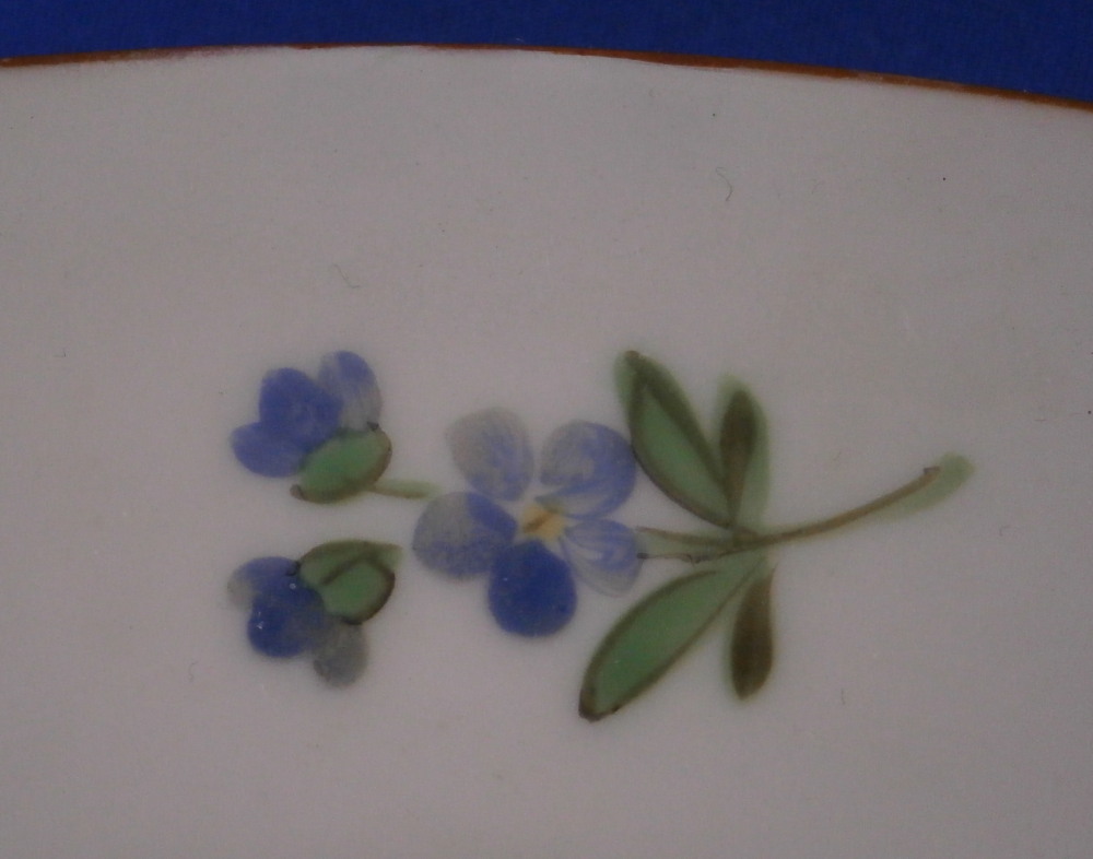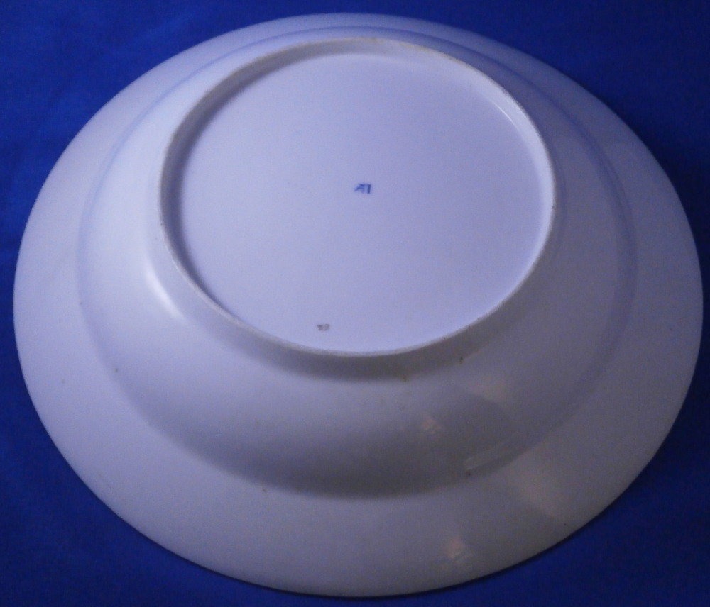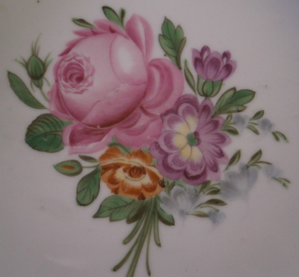 This is a superb plate made by Popov in the 19th century. Alexander Popoff founded the factory near Moscow in the early 19th century. The products from 1810 until 1830 were highly sought after which is when they produced the best quality wares. The factory was closed in 1872. The plates seems to have been made as a replacement piece for the famous Everyday Service of which most pieces were made by the St. Peterburg Imperial factory but I have also seen replacement pieces made by the Gardner factory. The plate is nicely hand painted with a nice floral arrangement in the center including a pink rose as well as an orange and purple flower. Three single flowers along the rim with a nice orange brown trim to the edge. The piece is 1.875 inches tall with a diameter of 9.25 inches. The plate displays perfectly but has three chips along the edge superbly restored. Almost invisible except for when you shine a bright light through it. Some wird scratches to the center only seen at the right angle to the light amost like sandpaper went over part of the center. Not sure why but I have seen that before on pieces. Never could figure out why. Maybe from getting rid of raised spots after the glaze firing before it was painted?! The plate is marked underneath with their blue AT looking mark as well as the black painter's mark as shown. Could be a '53 or EG depending on which way you look at it. Please email me for more information or other pictures.