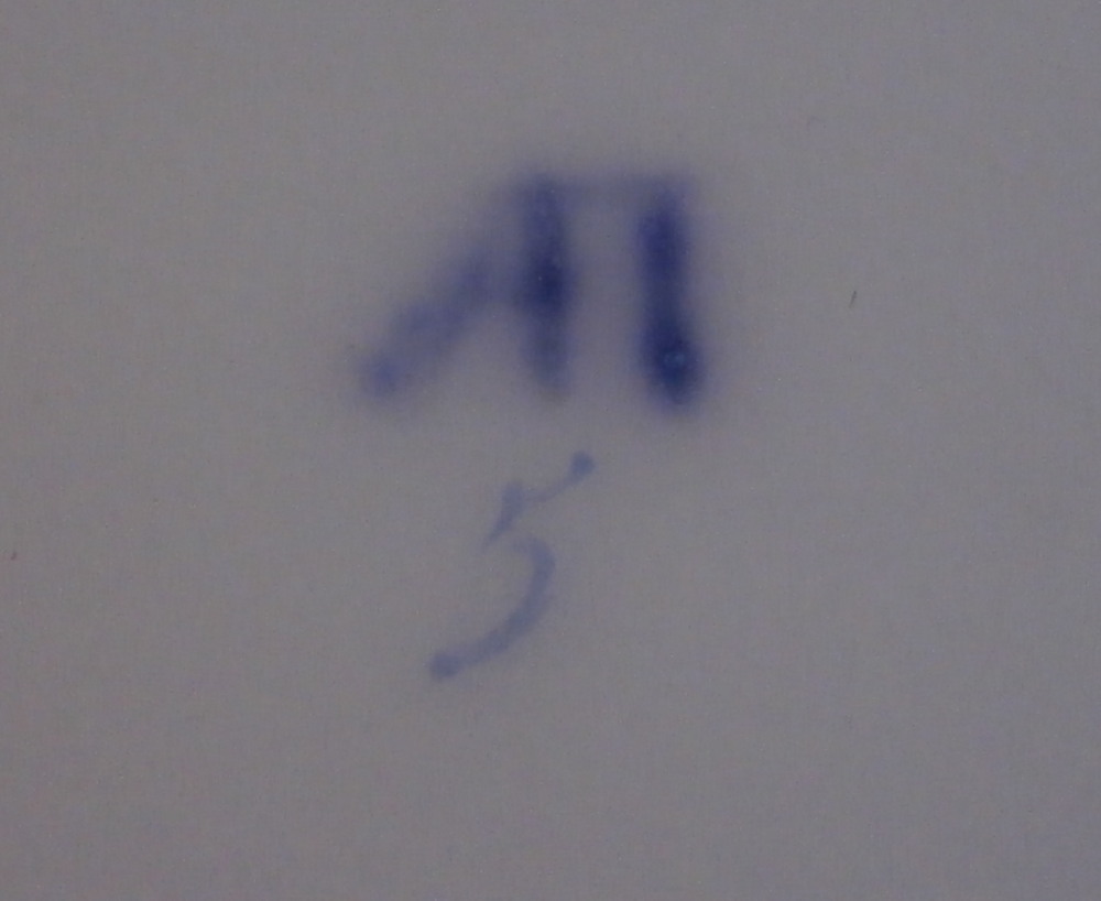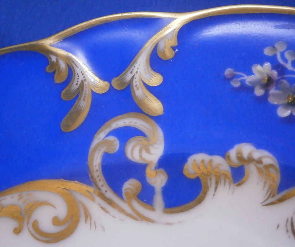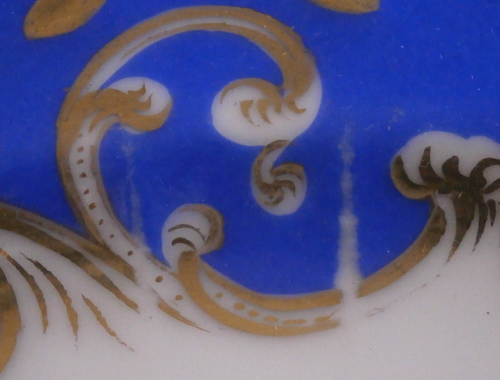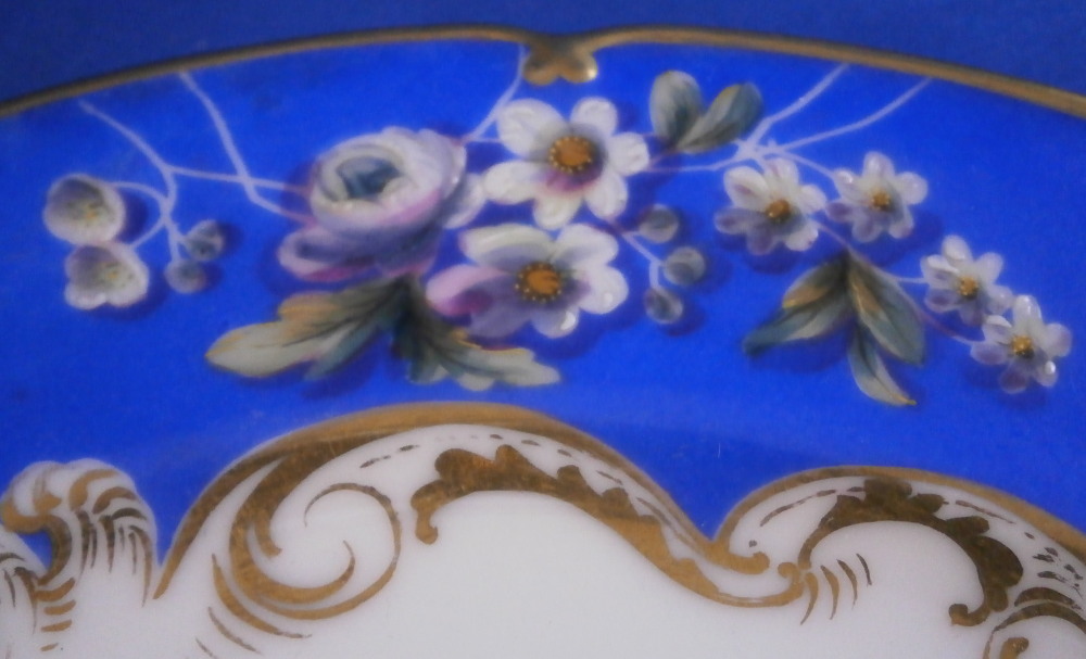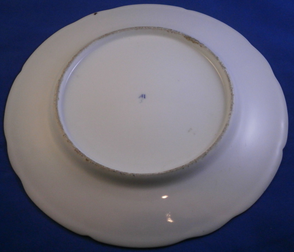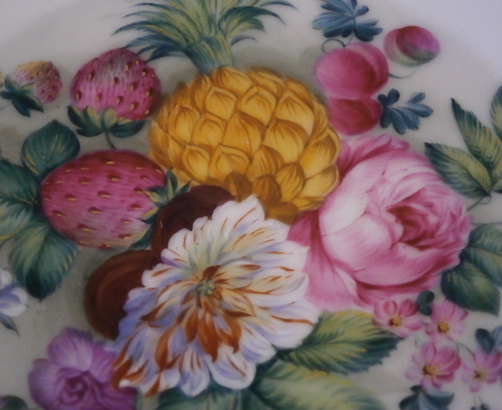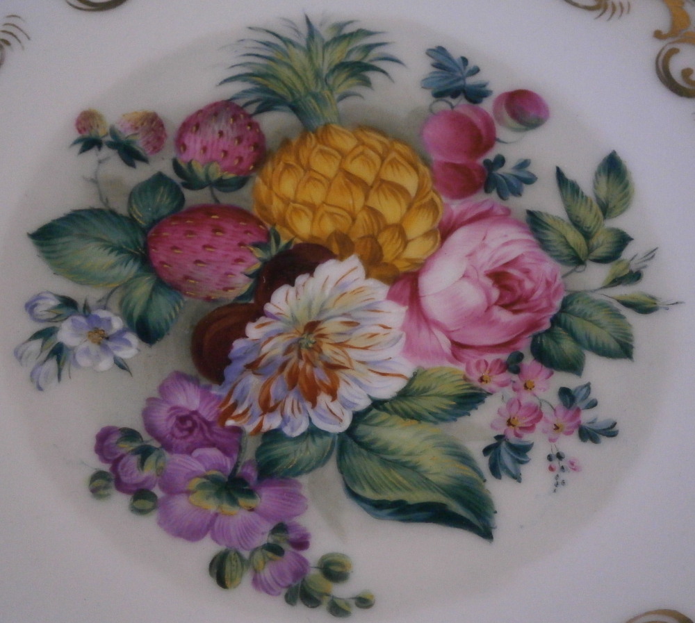 This is a superb polychrome plate made by Popov around 1830. Alexander Popoff founded the factory near Moscow in the early 19th century. The products were highly sought after and from 1810 until 1830 they produced the best quality wares. The factory was closed in 1872. The center of the plate has a colorful hand painted scene to it including flowers, berries and even a superb pineapple fruit as well as their leaves on a light grey ground. The central scene is surrounded by a white open space with the edge of the well having a nice gold trim to it. What really makes the plate look amazing is the rim design! The rim has a nice blue ground color to it with four floral panels painted over that with a relief design that is gilded coming down from the edge in between the floral panels. The nicely shaped edge is gilded as well. A stunning plate for sure! The plate is in superb condition with some minor wear to the gilding mainly from stacking to four areas along the edge of the well where there is a slight relief design that meant the blue color wore off a touch in strainght lines as shown. It matches in all four spots so it blends in perfectly with the design. A brown firing spot to the underside as shown from when it was made. The piece is marked underneath with the under glaze Popow AT looking mark, a blue number 5 below that an impressed number 28 (I think) as shown.The plate is 0.875 inches tall and 9.375 inches in diameter. Please email me for more information or other pictures.