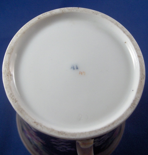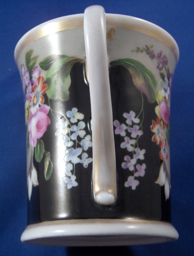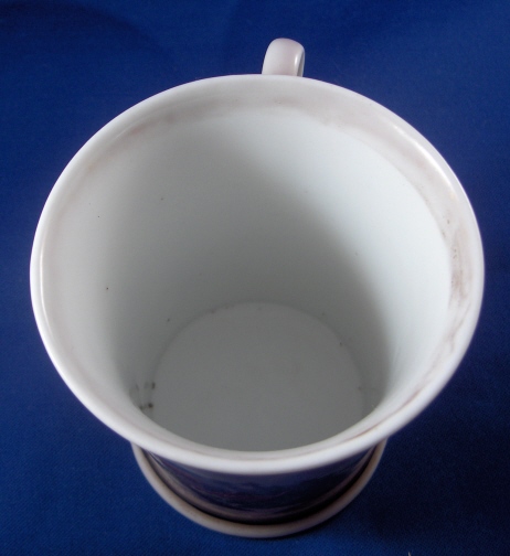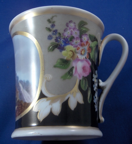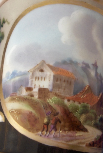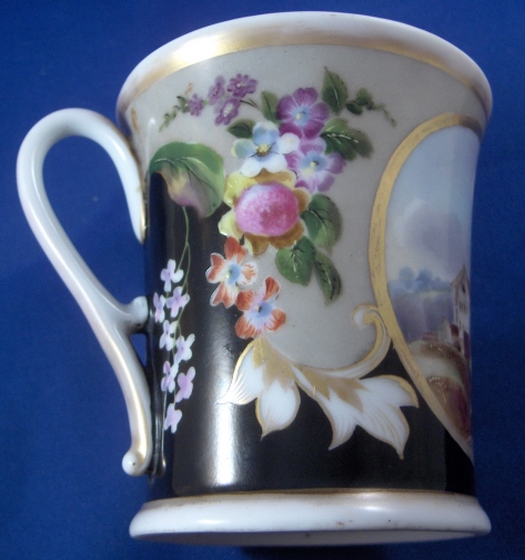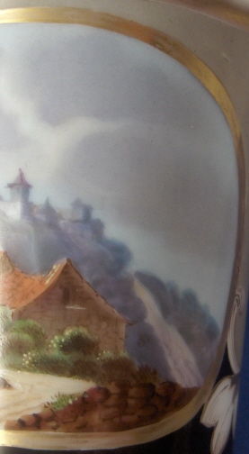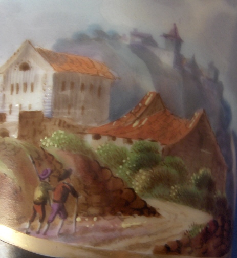 This is a superb mug made by Popoff around 1820. Alexander Popoff founded the factory near Moscow in the early 19th century. The products were highly sought after and from 1810 until 1830 they produced the best quality wares. The factory was closed in 1872. The front has a large scene that is handpainted with great detail and color. There are clouds in the sky, a castle in the background (one might be able to find out which one), two houses in the center with a road going towards them that two people are walking on. Nice rocks and greenery all around. The scene is surrounded with a gold trim and to either side there is a nice floral arrangement that is quite typical of Popov. Nice handle shape finishes this superb mug. It is in great condition as well except for a lot of wear to the gold trim on the handle and top & bottom rim. It was definitely loved and used and the wear doesn't take away from the piece at all. The mug is marked underneath with the underglaze Popow mark, a red 49 and an impressed 23. It is 3.75 inches tall and just under 3.5 inches in diameter. Please email me for more information or other pictures.