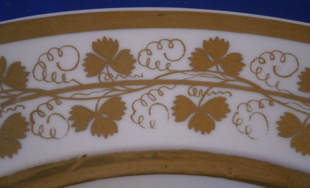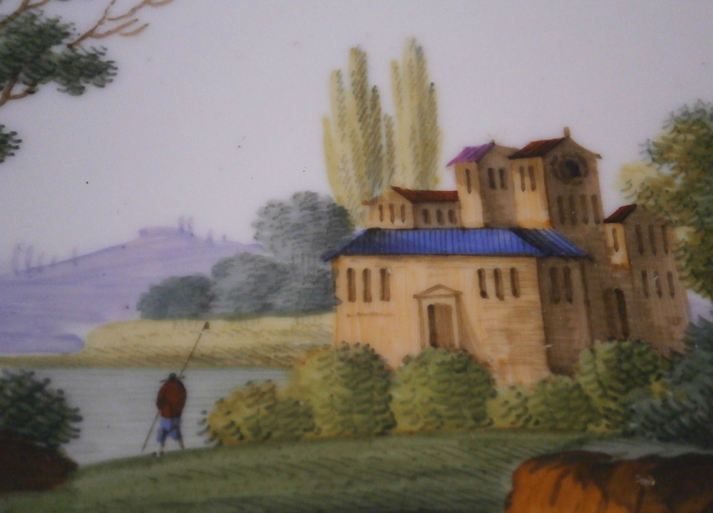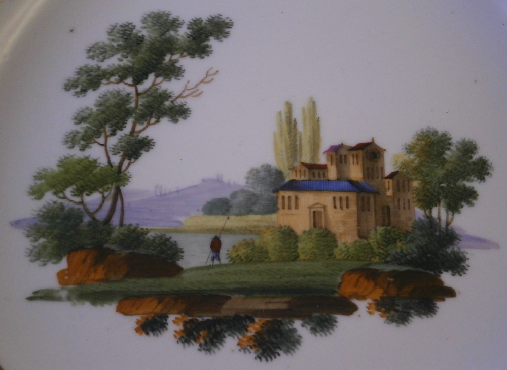 This is a superb polychrome scenic plate made by Popov around 1820. Alexander Popoff founded the factory near Moscow in the early 19th century. The products were highly sought after and from 1810 until 1830 they produced the best quality wares. The factory was closed in 1872. The center of the plate has a colorful hand painted landscape scene to it including a building and a person in a landscape surrounding. The rim has a nice gold grape leaf garland to it with thick gold bands to the edge and around the well edge. The plate is in superb condition with some very minor wear and a couple of minor firing flaws from when it was made. It displays perfectly! The piece is marked underneath with the under glaze Popow AT looking mark, an impressed number 25 as well as a black number 8 as shown. The plate is 1.625 inches tall and 9.125 inches in diameter. Please email me for more information or other pictures.