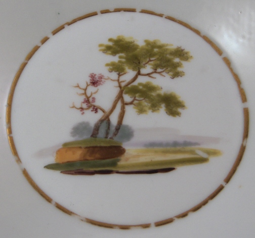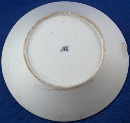 This is a scenic saucer made by Popoff around 1820. Alexander Popoff founded the factory near Moscow in the early 19th century. The products were highly sought after and from 1810 until 1830 they produced the best quality wares. The factory was closed in 1872. The center of the saucer has a large simple landscape scene in it with a gold trim line around it and another gold trim line on the rim edge with a thinner line under that. The saucer displays nicely with a little wear to the gilding and a large flat chip to mostly the underside rim with only a tiny bit showing from the top. An easy fix if need be! The piece is marked underneath with the underglaze Popow AT looking mark with an impressed 19 or so by the footring. The saucer is just over 1 inch tall and 5.375 inches in diameter. Please email me for more information or other pictures.