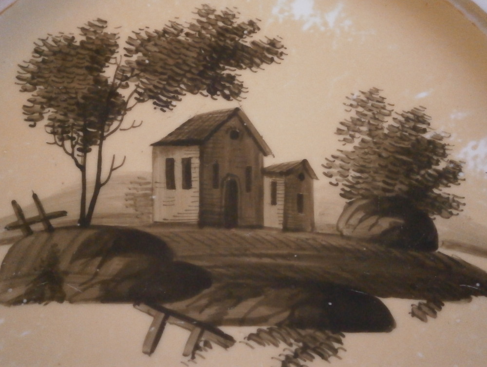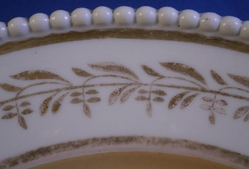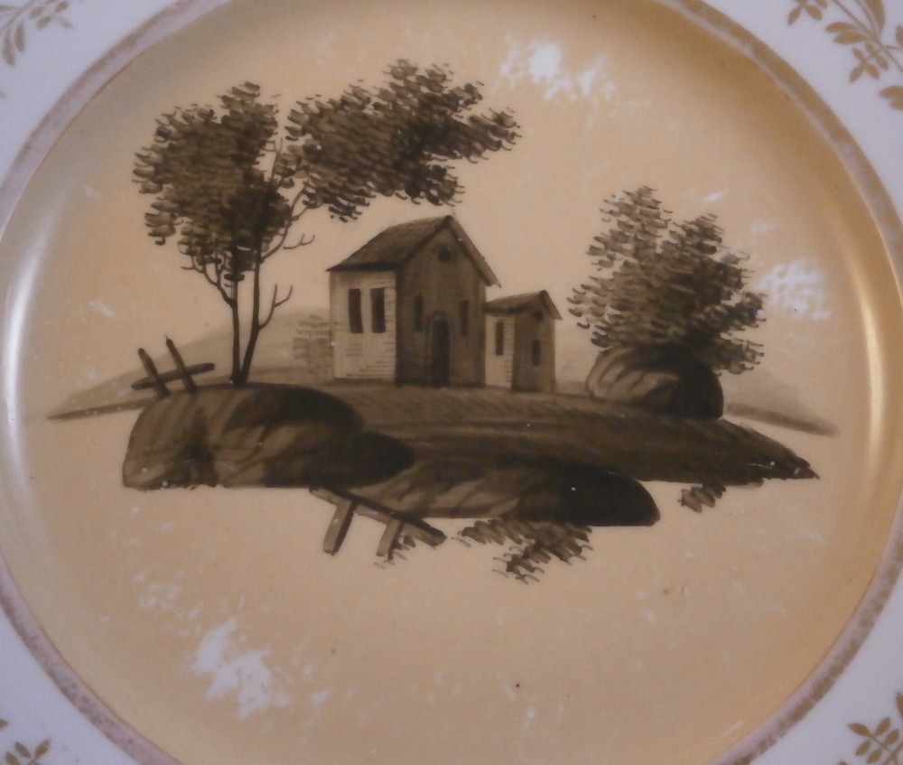 This is a scenic plate made by Popov in the earlier to mid 19th century. Alexander Popoff founded the factory near Moscow in the early 19th century. The products were highly sought after and from 1810 until 1830 they produced the best quality wares and it closed in 1872. This piece here is not one of the really nice pieces but still a good example and quite typically Russian. The plate has a monotone scene in the center including a buidling in a landscape surrounding. The rest of the well has a beige / off white ground color to it with a gold ring around the edge, a leaf design trim to the rim and another gold ring around the outer edge of the rim with a raised "pearl" trim to the very edge. The plate is in good condition with what looks to be some stacking wear to the ground color of the well and wear to the gold trim. Still a nice example from a maker one does not come across often. The piece is marked underneath with the under glaze Popow AT looking mark as well as an impressed number that is hard to see as shown. The plate is 1.5 inches tall and 8.625 inches in diameter. Please email me for more information or other pictures.