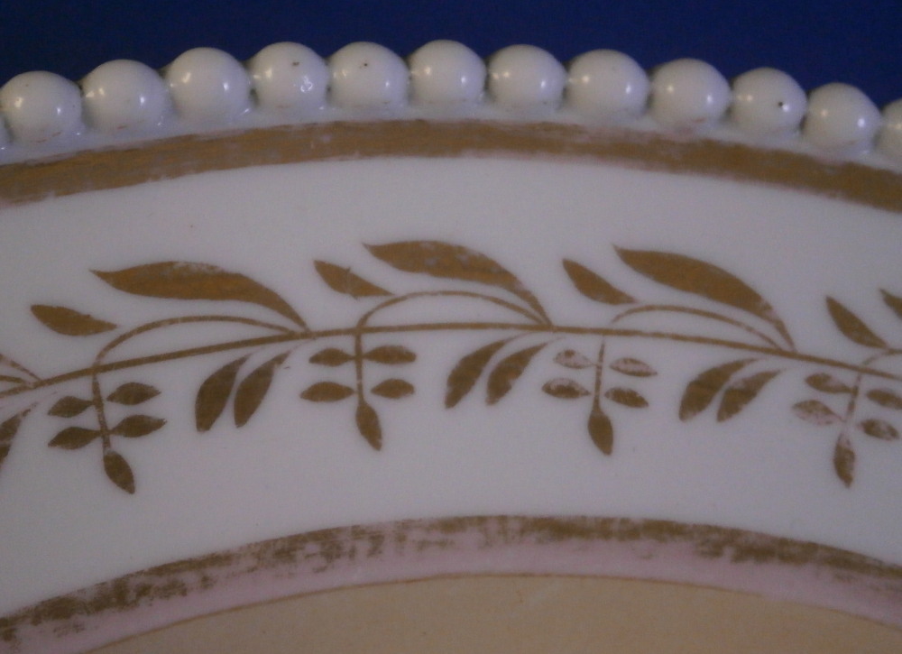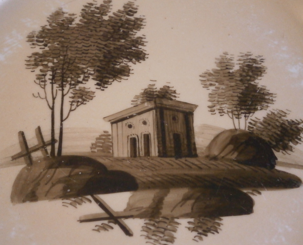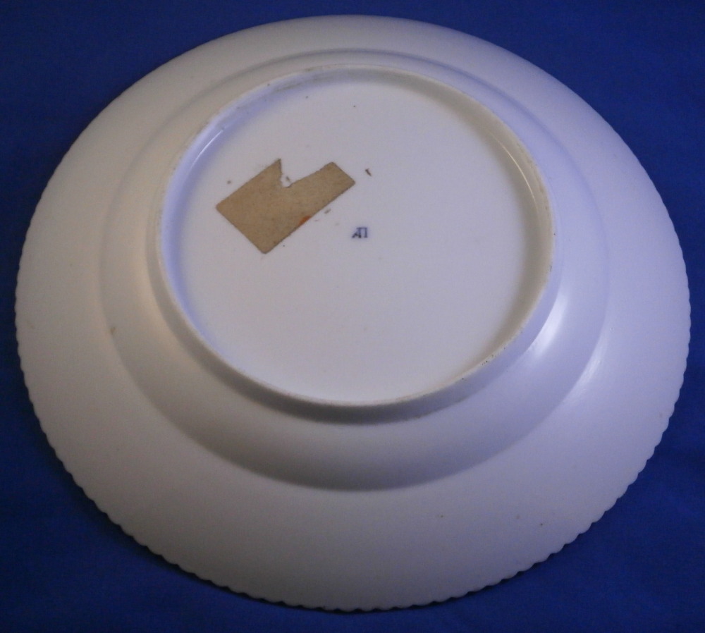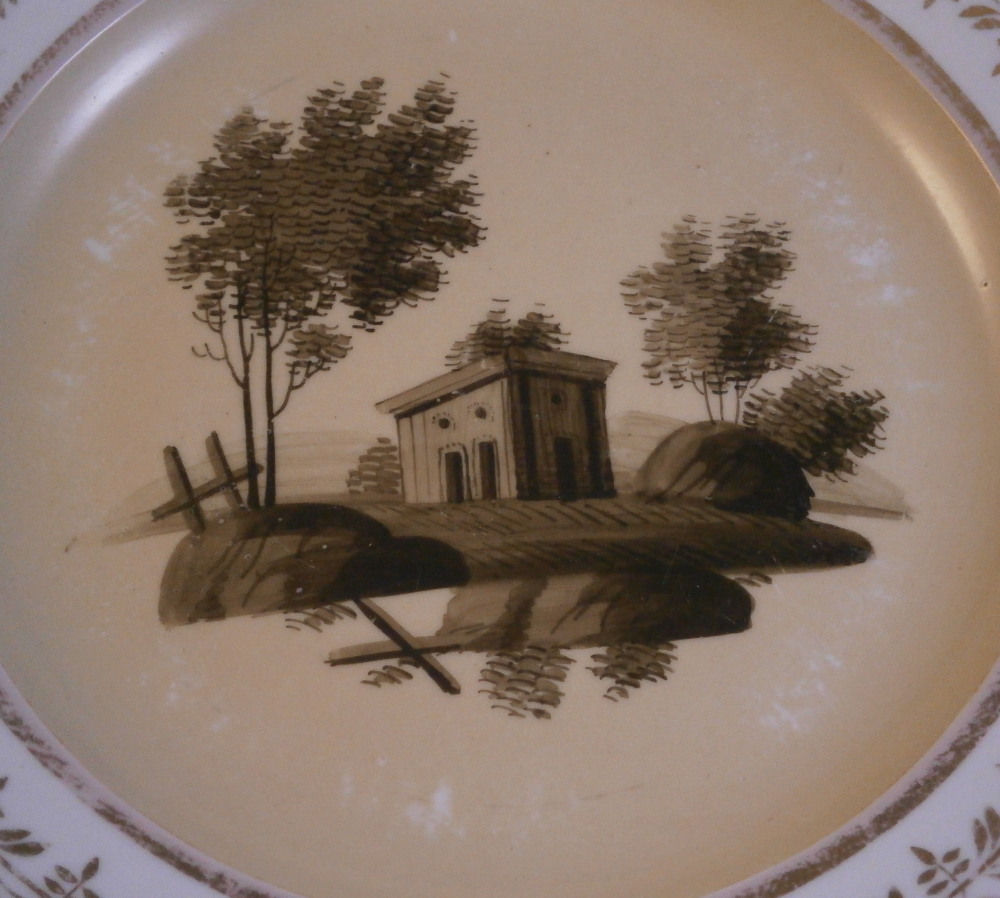 This is a scenic plate made by Popov in the earlier to mid 19th century. Alexander Popoff founded the factory near Moscow in the early 19th century. The products were highly sought after and from 1810 until 1830 they produced the best quality wares and it closed in 1872. This piece here is not one of the really nice pieces but still a good example and quite typically Russian. The plate has a monotone scene in the center including a buidling in a landscape surrounding. The rest of the well has a beige / off white ground color to it with a gold ring around the edge, a leaf design trim to the rim and another gold ring around the outer edge of the rim with a raised "pearl" trim to the very edge. The plate is in good condition with what looks to be some stacking wear to the ground color of the well and wear to the gold trim. Still a nice example from a maker one does not come across often. The piece is marked underneath with the under glaze Popow AT looking mark as well as an impressed number 25 as shown. The plate is 1.375 inches tall and 8.75 inches in diameter. Please email me for more information or other pictures.