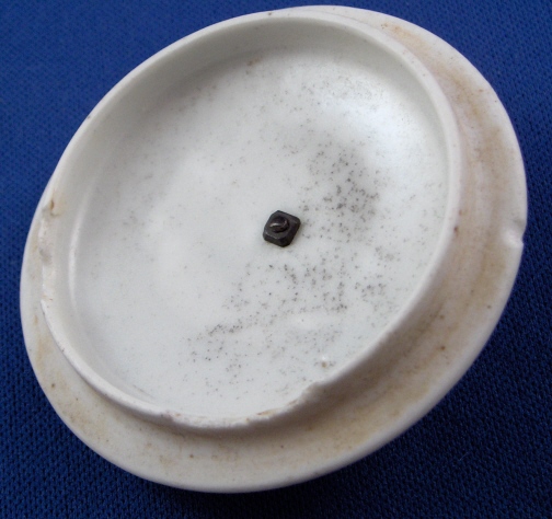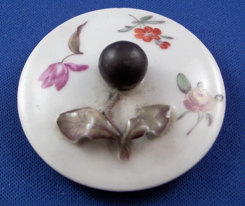 This is a lid to a pot de creme or even a small creamer or pitcher from around the mid to late 18th century made by Meissen. It is handpainted with flowers and would have had a fruit or flower finial that was replaced by a round black ball. The lid is in OK condition with the finial replaced and held on by a small screw and nut, some chipping to the leaves, a small rim chip and two chipped areas to the underside ring that would sit inside the main piece. Still nice to have if you were lacking a lid of this side and style. The lid is 0.75 inch tall and just under 2.25 inches in diameter. The underside ring that would sit inside the main body is just over 1.75 inches in diameter. The piece is not marked. Please email me for more information or other pictures.
