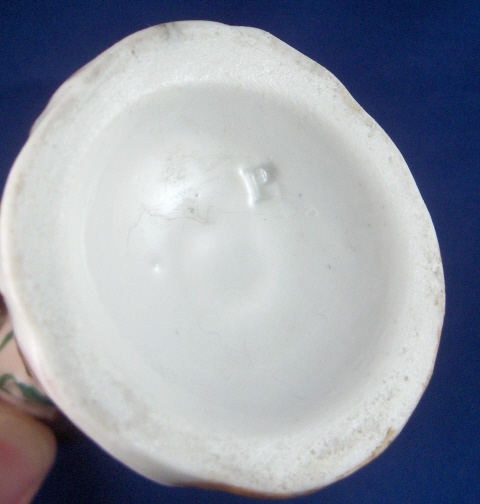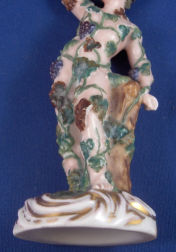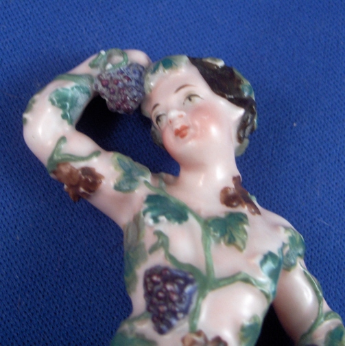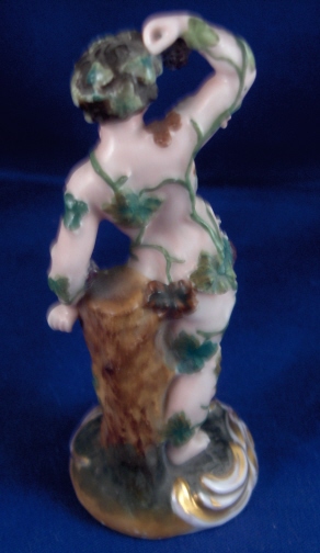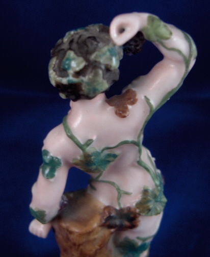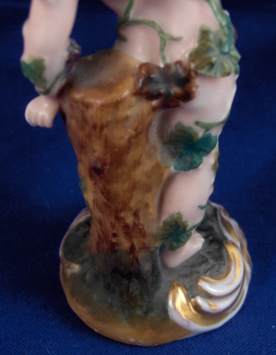 This is a figurine made by Prague around 1840. It is of a nude man covered by grape vines including leaves and grapes. I would guess he is supoosed to be Bacchus the god of wine :) It is well modeled and pretty well painted. Nice gilded base adds to the piece. The figure is in good condition with just two small chips to the leaves and one or two vines also have chips. It is marked underneath with the impressed P mark. The piece is 4.75 inches tall and the base is 1.875 inches in diameter. A rare piece by one of the smaller makers in the porcelain world. Please email me for more information or other pictures. Prag
