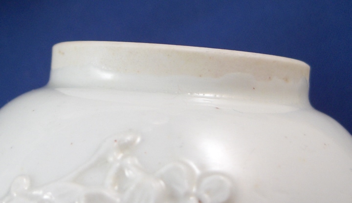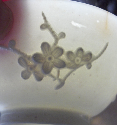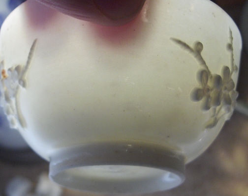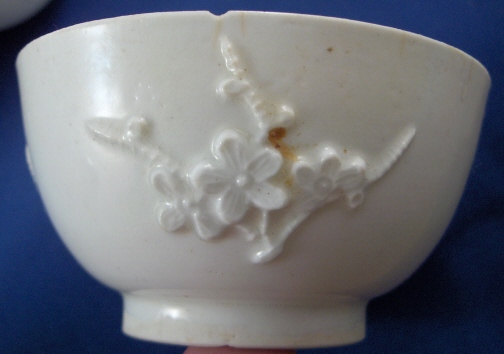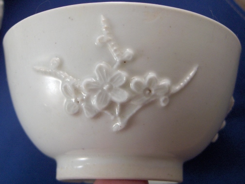 This is an early cup made by Meissen in about 1720 still of Boettger porcelain. The teabowl is nicely decorated with the famous prunus blossom design in relief on the outside. Very thin porcelain. The cup is in good display condition but has a small rim chip as well as a few short hairlines on the rim. The teabowl is 1.75 inches tall and has a diameter of 3.25 inches. It is not marked underneath which is normal on early Meissen porcelain. Please email me for more information or other pictures.