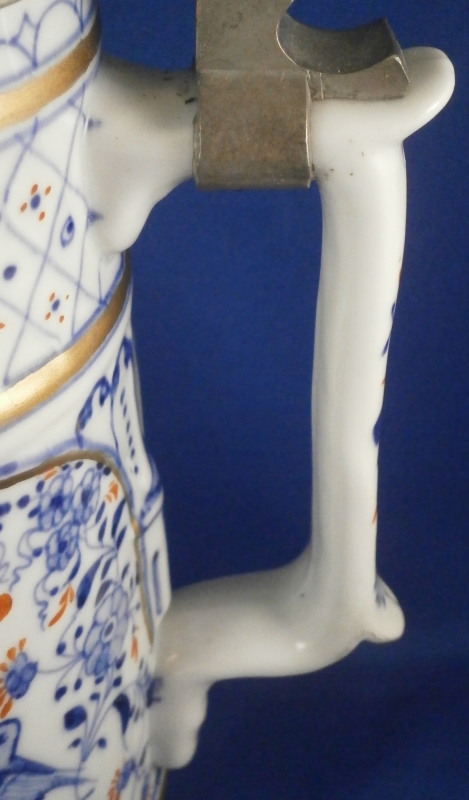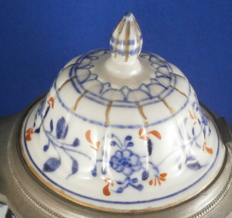 This is a porcelain beer stein / tankard made by Rauenstein in the mid 19th century. The body and lid are hand painted with an underglaze blue design based on the strawflower design with birds plus red and gold highlights. The body also has some raised elements to it in the shape of columns and rings and the pewter lid mount has an amazing thumb holder to it in the shape of an eagle or griffin. A very nice piece - ready and waiting for its next beer :) The tankard is marked underneath with the RN under the crossed flags mark in under glaze blue as well as an incised number line and 6. It is in great condition with just some very minimal wear to the gold trim, a firing crack under one of the columns which off course does not go through to the inside and the finial of the lid was restored back on at some point - but that petwer thumb holder easily makes up for that :) The tankard with lid is 10.125 inches tall (including the pewter finial) and 4.5 inches in diameter - larger than the others I have owned over the years. Please email me for more information or photos.