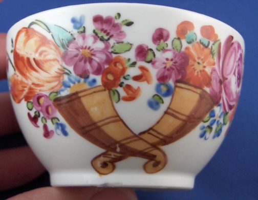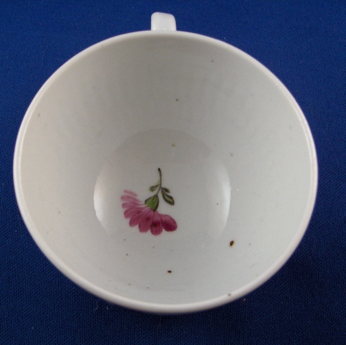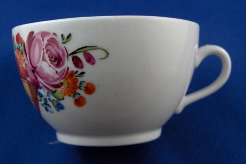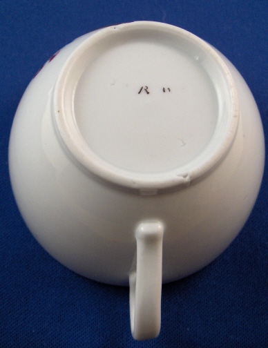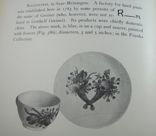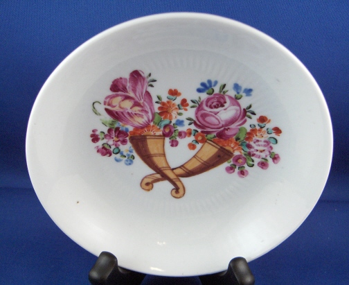 This is a cup and saucer made by Rauenstein around 1800. Rauenstein is one of the better known Thuringia makers as they made a lot of porcelain mostly decorated with the strawflower pattern until the end of the 19th century but the older pieces are hard to find. Rauenstein existed from 1783 until about 1930. This cup and saucer is handpainted with two horns of plenty that have flowers come out of them. The inside bottom of the cup has a flower painted on it. The porcelain has a ribbed pattern in relief very typical of all the Thuringia makers around this time period. The set is in good condition with a manufacturing flaw in the footring of the cup and a few black specs from the firing process. They are both marked underneath with the R-n mark in black only used for a short time. The cup is 1.75 inches tall and 3 inches in diameter and the saucer is 1.25 inches tall and 5.125 inches in diameter. Please e-mail me for more information or photos.