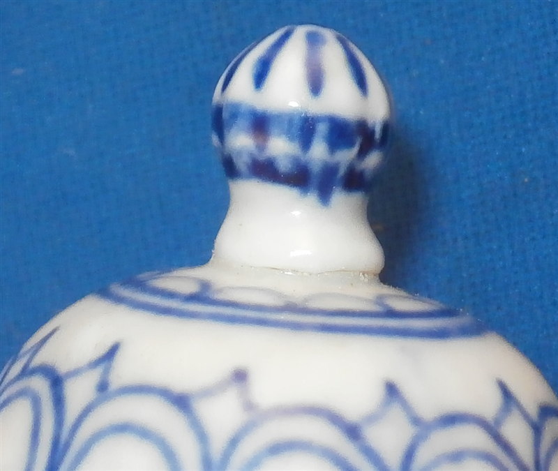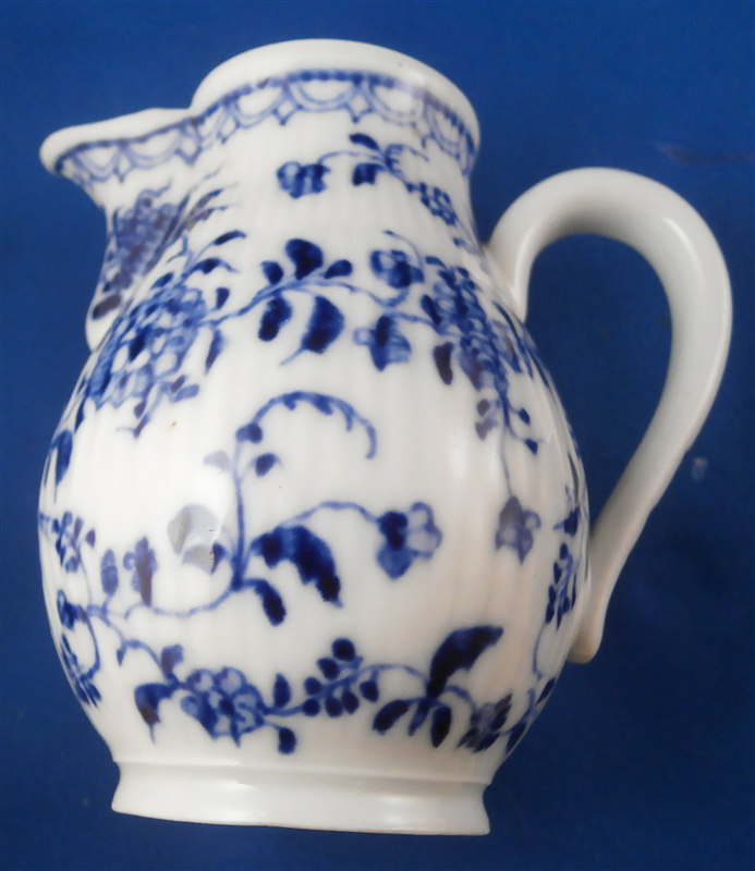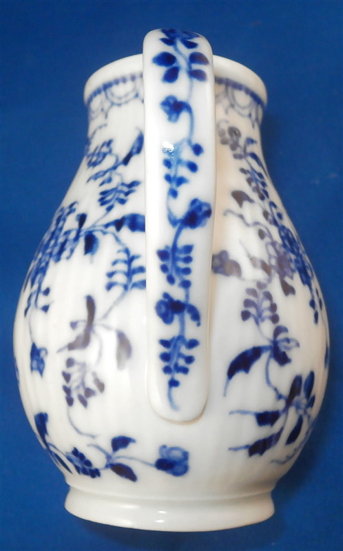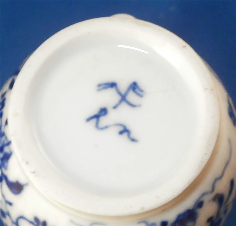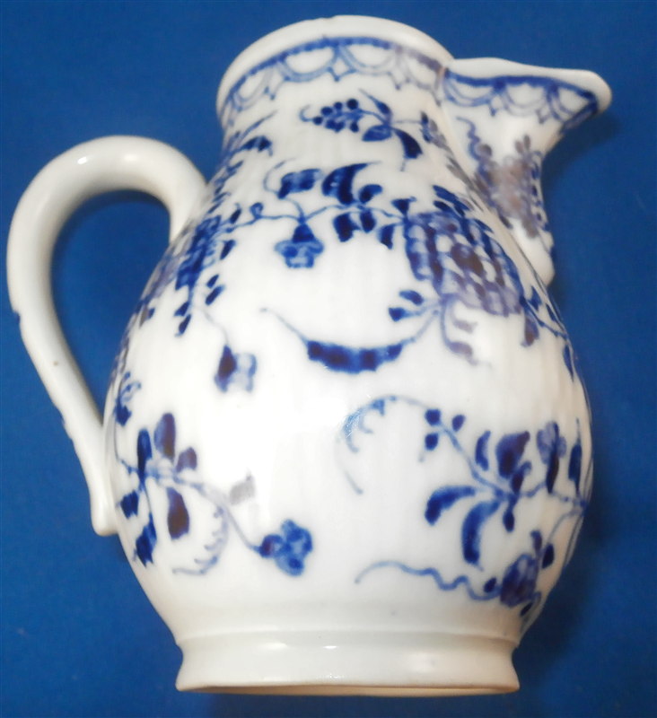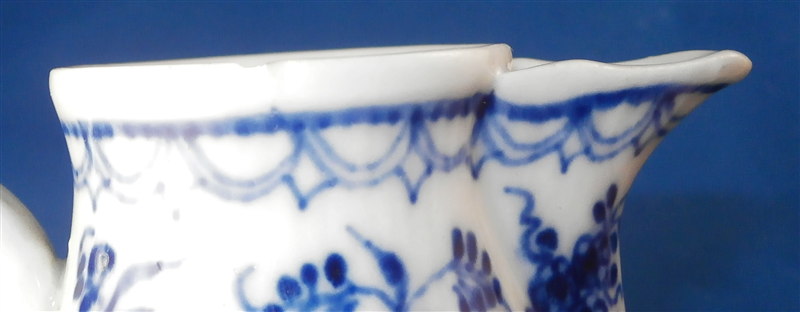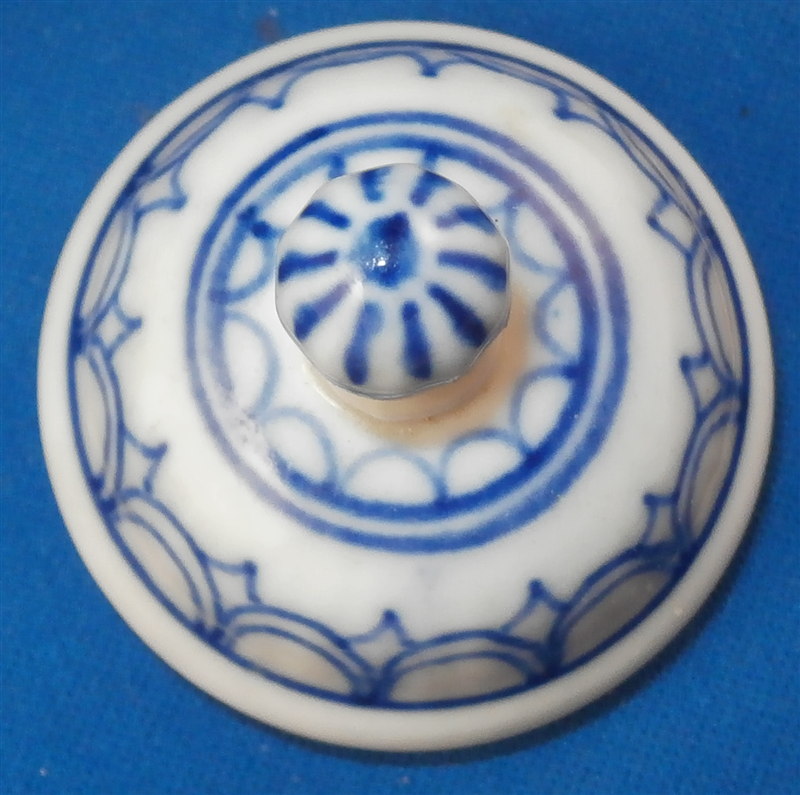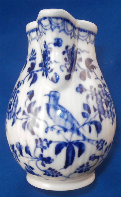 This is a fun lidded creamer or miniature coffee pot for one of their famous doll sets (as it is the same size as one that was included in a set I owned) made by Rauenstein in the mid 19th century. The piece is handpainted with the famous underglaze blue strawflower design including a bird and the paste has the ribbed design to it quite typical for Thuringia area makers. The pot is marked underneath with the RN mark in script under the crossed flags as well as an incised M or something along those lines. The piece is in great condition with a small chip to the top edge of the pot and the finial on the lid was cleanly broken off and reattached. The pot is 4.75 inches tall and 2.5 inches in diameter. Please email me for more information or photos.