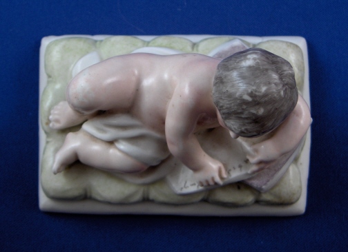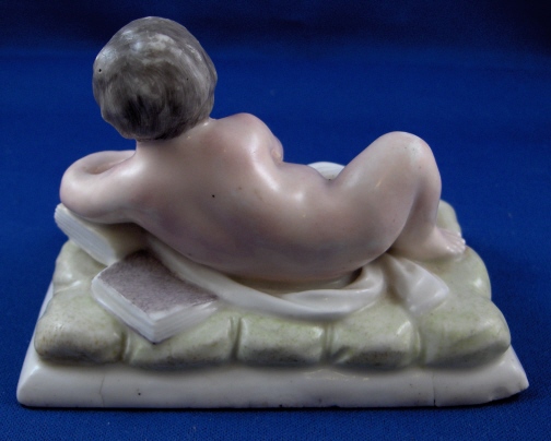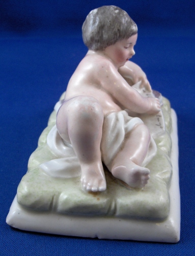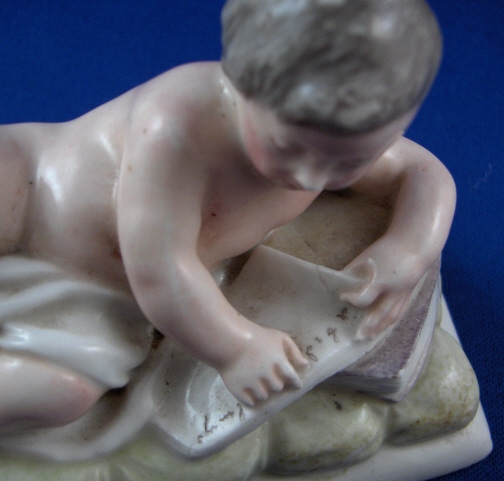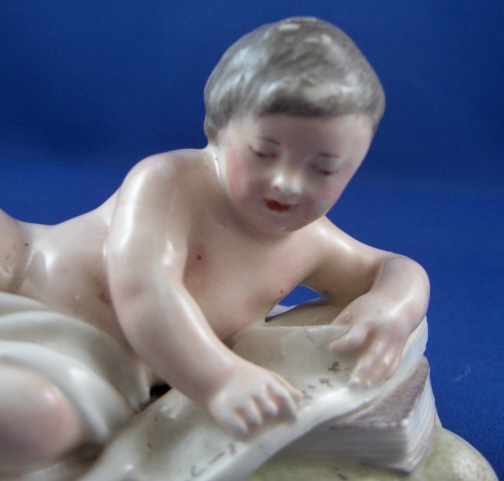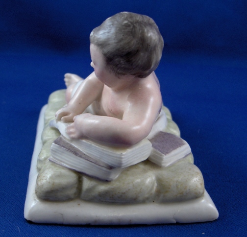 This is a figurine made in Zuerich about 1765. The factory at Kilchberg Schooren near Zurich was founded in 1763 and made softpaste porcelain which had a creamy white appearance at first but in 1765 they already started making hard paste porcelain mostly. So this figure is from the very beginnings of this already rare maker. The 'safe' shape is an indication to it being early as not much could happen to it during the firing process. Very few of these pieces are left today and they are quite expensive. Actually the ones I did find went up to 50,000 Euros but these were fancier than mine. This was my longest mystery piece which took me quite a few years to solve! Thanks for help from Christophe Perles who also has some very nice procelain in Paris or online and lots of books and my dad who recognized the writing on the book the boy is holding as Kurrentschrift - an old form of German / Swiss writing quite a long time ago. I am too young to know this style of writing but he recognized it at first glance not that I am calling him old here :) The small letter c is the easiest giveaway. So with that in mind we looked at who was left that could have made it and Zuerich was really it. The books confirm the style, colors, etc. for this figure and I will look some more if we can find this actual piece but since they are so rare that might be impossible. The figurine is handpainted very well and it is also modeled quite well. Very well done and quite solid. No air holes or anything else. It is in great condition with some wear to the paint mostly on his knee and his head. Also some small chips and firing cracks to the white part of the base. The face is very well painted and he even has teeth. It is 3 inches tall, 4.375 inches wide and 2.875 inches deep. Please email me for more information or other pictures.