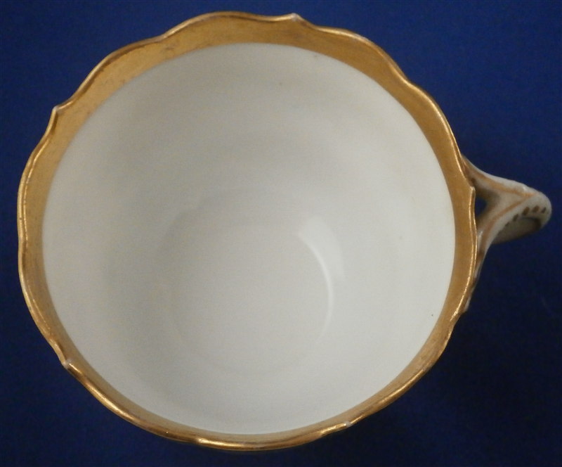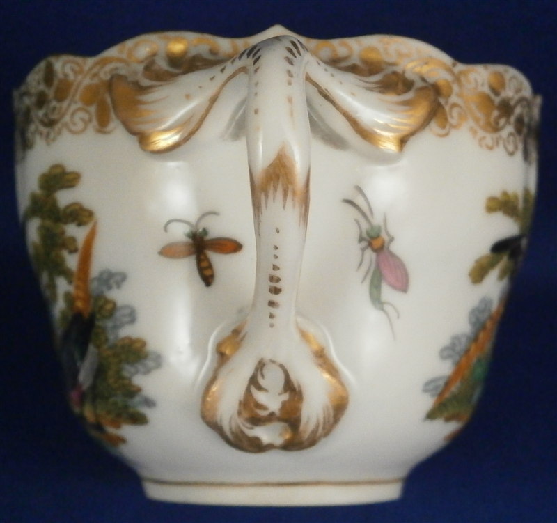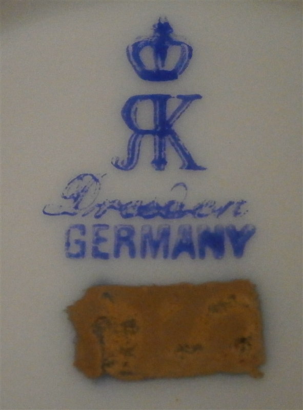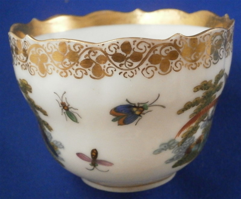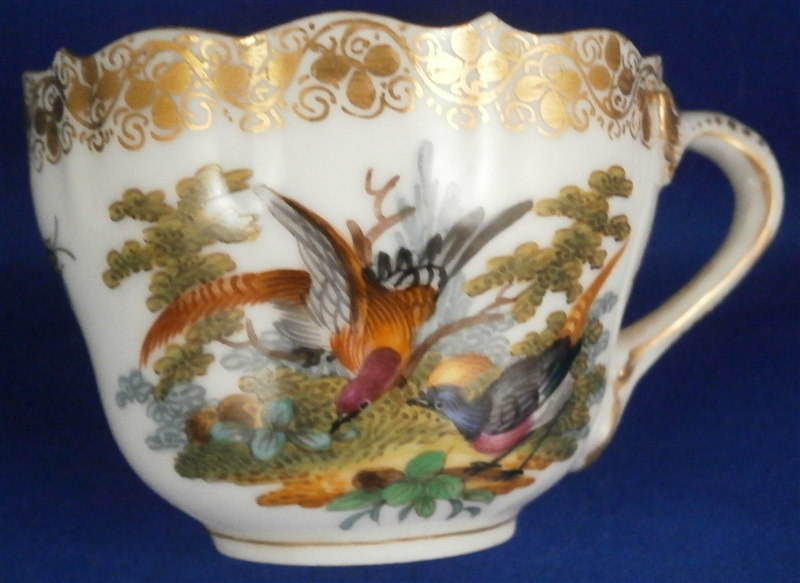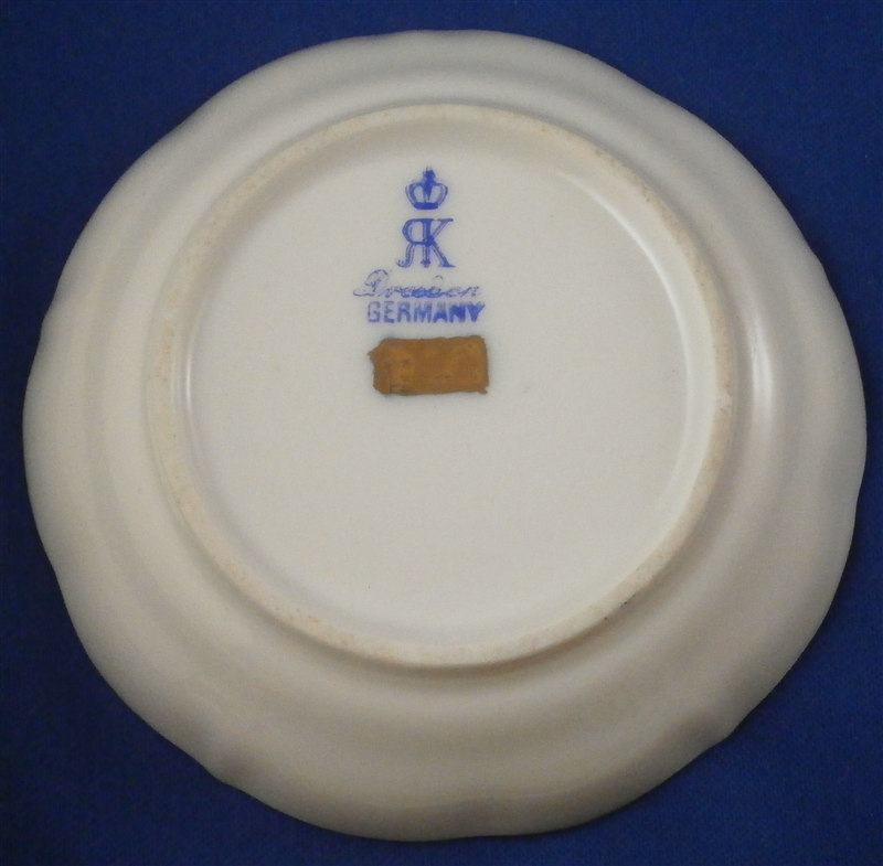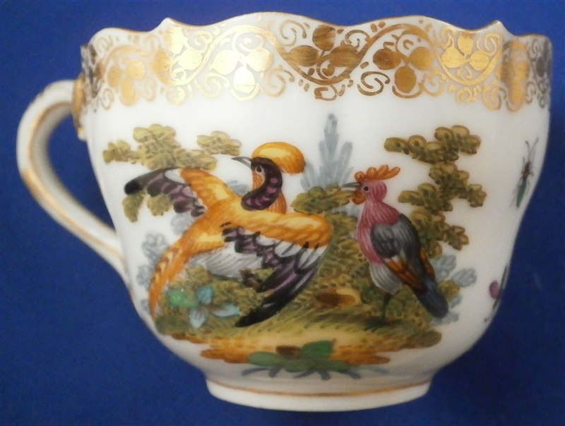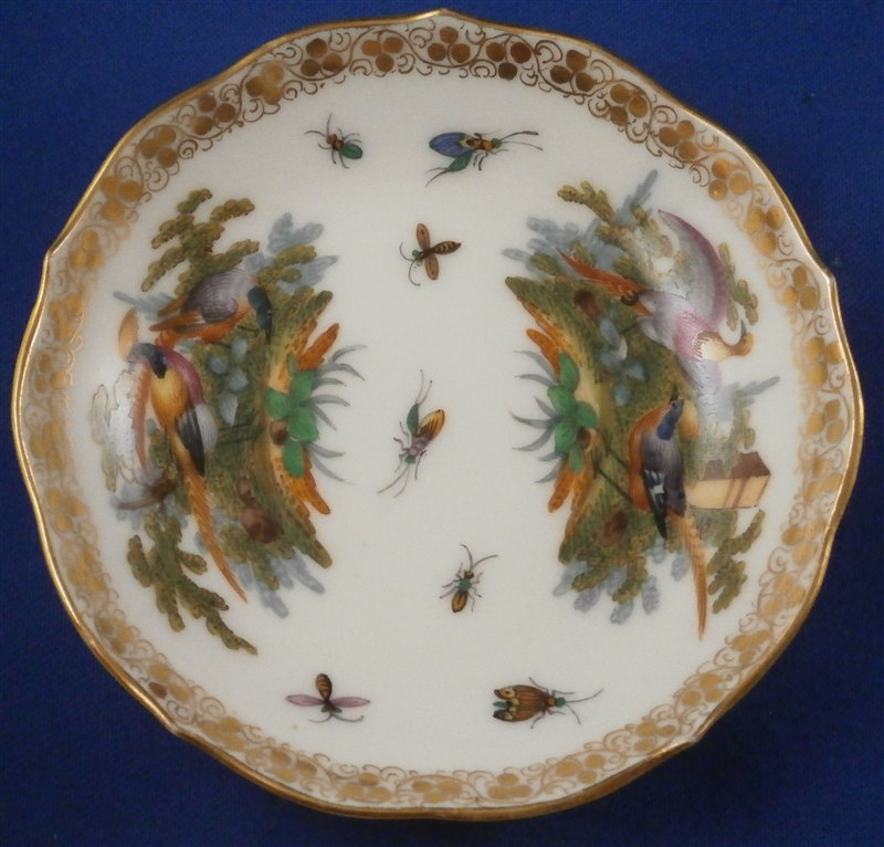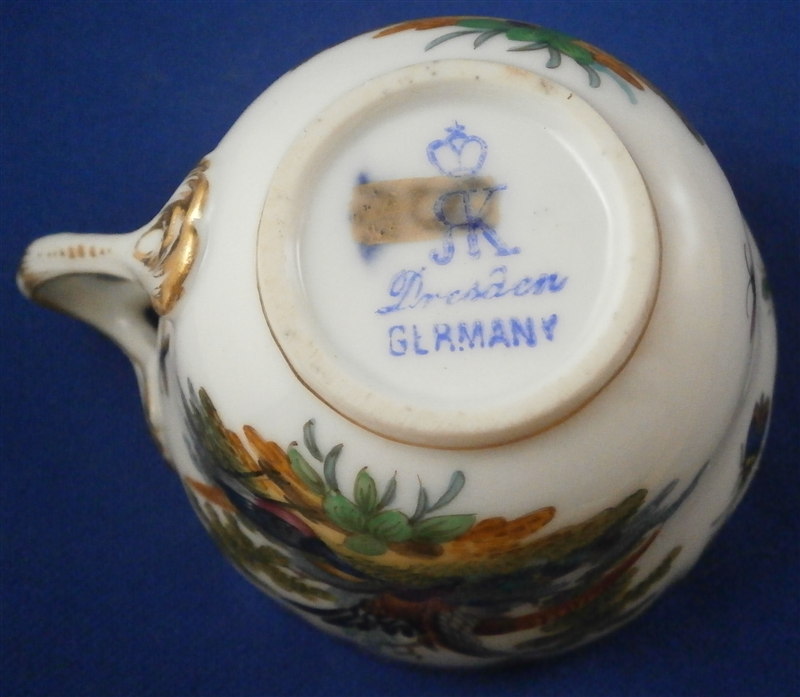 This is a small cup and saucer made by Richard Klemm between 1888 and 1916. Each piece is hand painted with two scenes of birds of paradise and insects in a landscape background and a nice gold trim. The demitasse is in perfect condition with some very minor wear to the gilding. The cup is 1.875 inches tall and 2.5 inches in diameter. The saucer is 0.875 inches tall and has a diameter of 4 inches. Both are marked underneath with the RK under a crown mark with the word Dresden underneath as well as the word GERMANY. There is also a mark of the manufactory that made the blank plate that was covered with a gold rectangle underneath. Please email me for more information or other pictures.