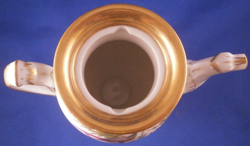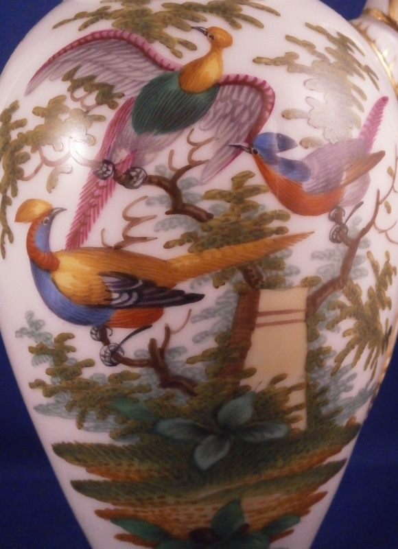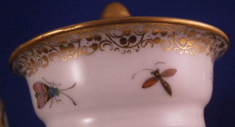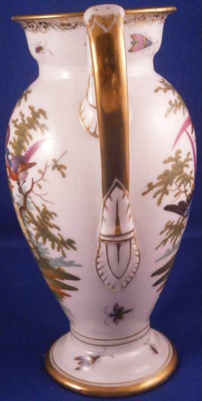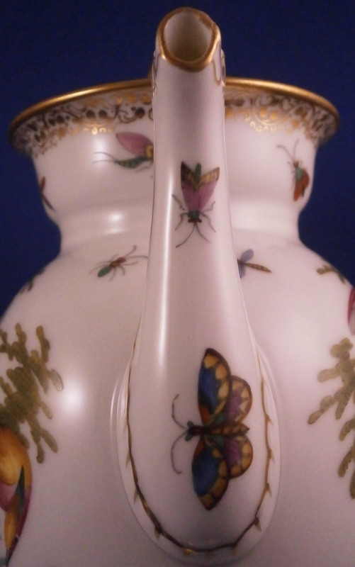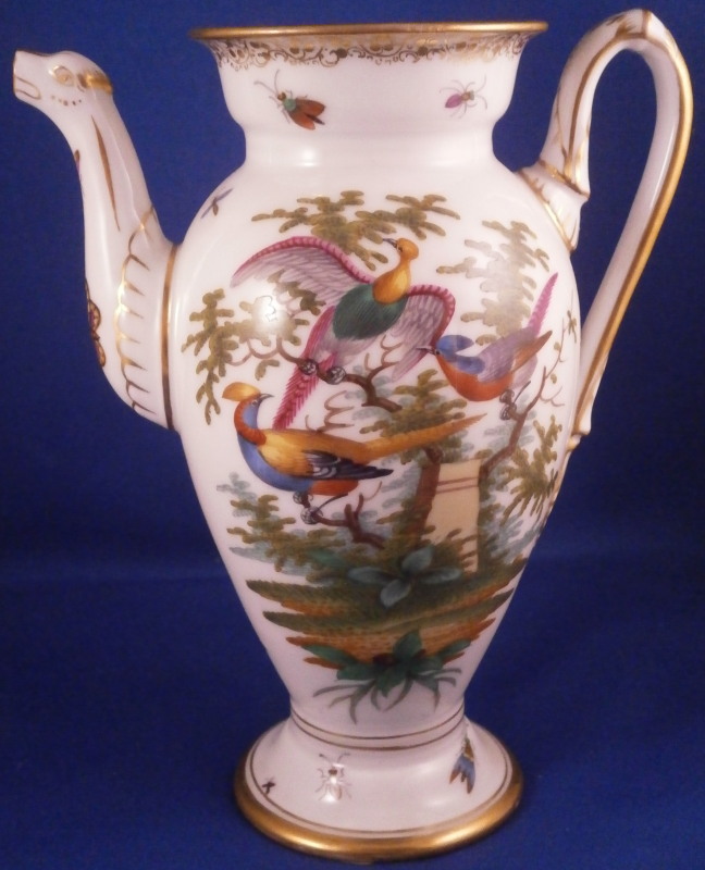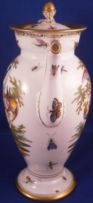 This is a small coffee pot with its lid made by Richard Klemm between 1888 and 1916. Likely of espresso or mocha coffee it is hand painted with their very collectible bird of paradise design including two scenes of colorful birds in a landscape surrounding with the rest of the space filled with scattered insects including butterflies, etc. Nice gold trim all around including the distinctive one to the top edge and around the edge of the lid. The lid also has some bugs painted on it as shown. Nice animal shape spout. We have collected this pattern for many years and while the plates are not super hard to find, the cups are fairly difficult to find and the main pieces almost impossible so here is your chance to complete the set if you are missing the pot. The piece is in perfect condition with a tiny manufacturing flaw on the inside spout which I tried to show. It is meaningless and does not show at all when on display and is hard to spot when you look for it as well. The pot and lid are 7.75 inches tall, 5.5 inches from hand to spout and 3.5 inches in diameter. It is marked underneath with the RK under a crown mark with the word Dresden under it printed in blue above glaze as well as an impressed number 3. Please email me for more information or other pictures.