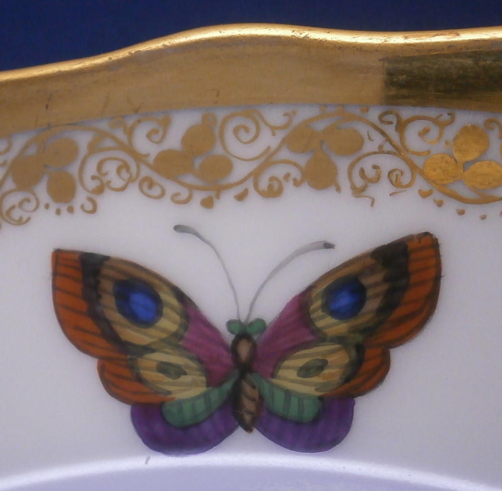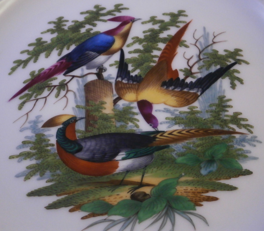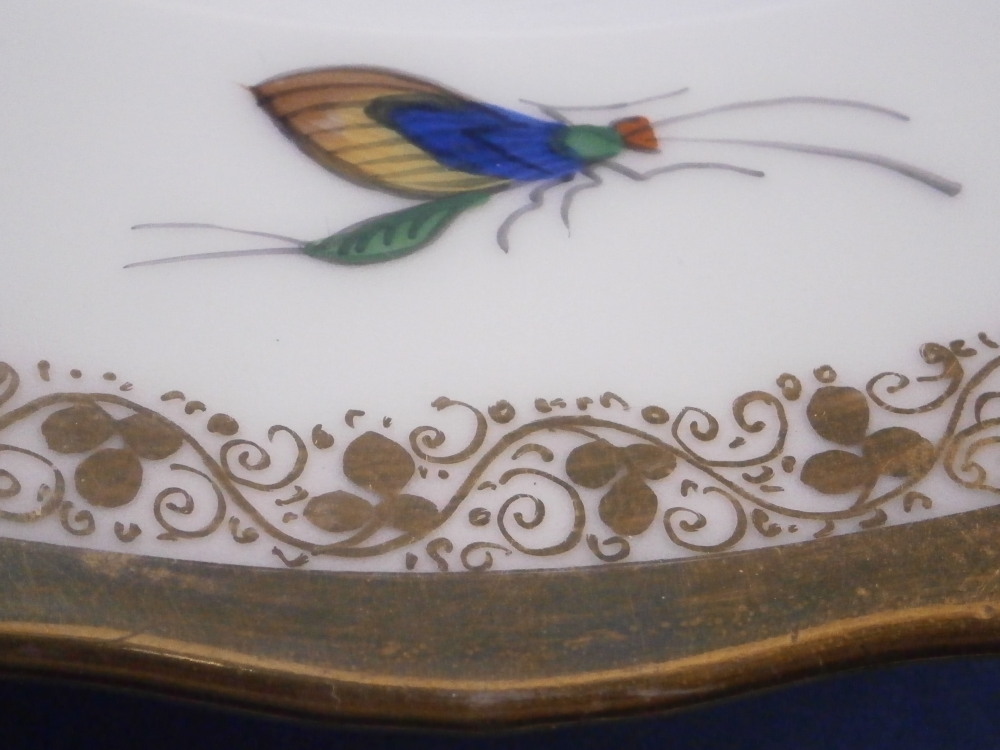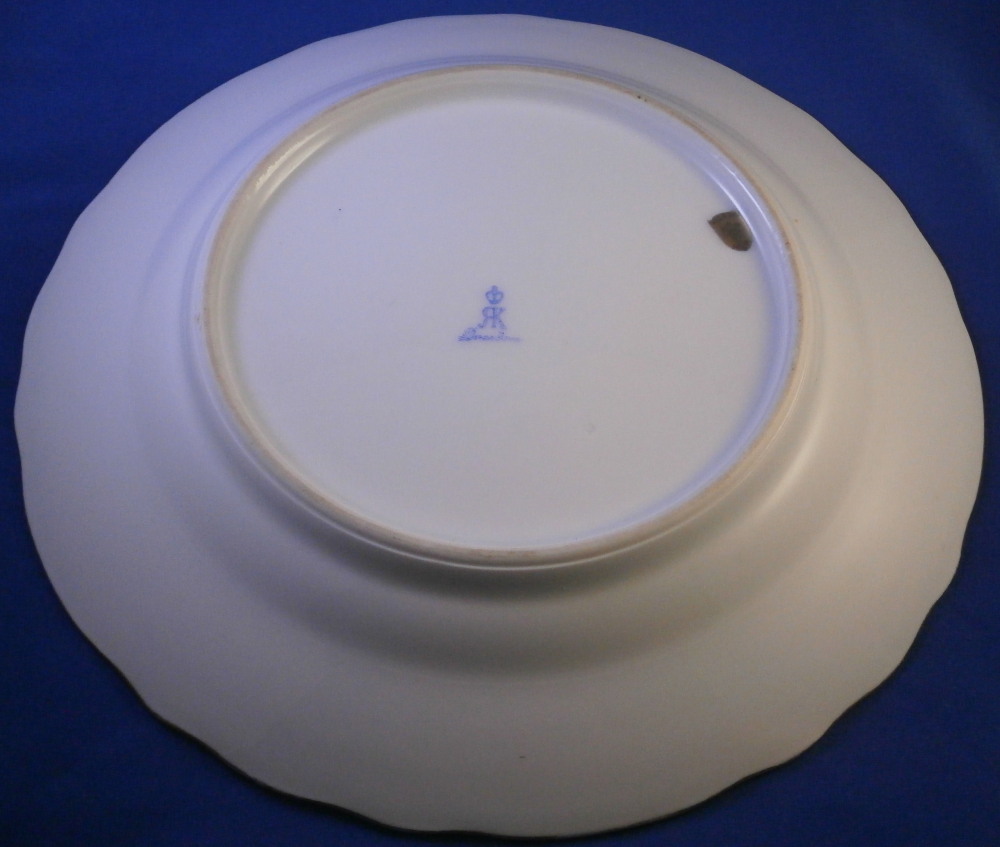 This is a rare dinner plate made by Richard Klemm between 1888 and 1916. It is hand painted with a scene including birds of paradise in a landscape surrounding as well as insects around the rim and a nice gold trim. We have collected this pattern for many years and have been told that the painter who painted this pattern on both RK marked pieces and crossed swords marked pieces was a Hausmaler trained at Meissen. The plate is in great condition with some wear to the gold band around the edge and a tiny paint flake to the tip of a green leaf as shown. The plate is 1.375 inches tall and 9.625 inches in diameter. It's marked underneath with the RK under a crown mark with the word Dresden underneath. There is also a gold mark hiding the mark of the manufacturer of the blank plate underneath. I think it is for Hermann Ohme from the SIlesia region. Please email me for more information or other pictures.